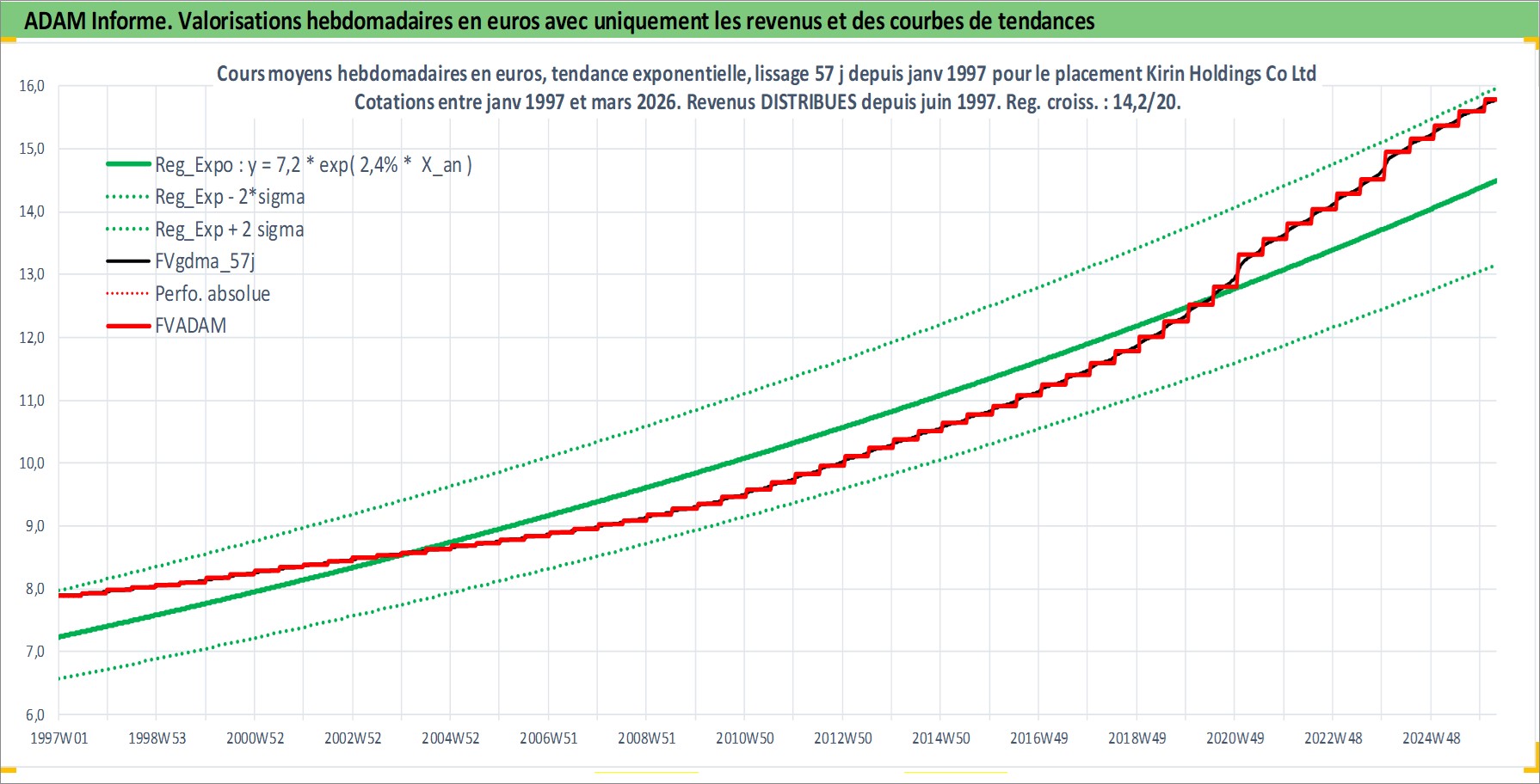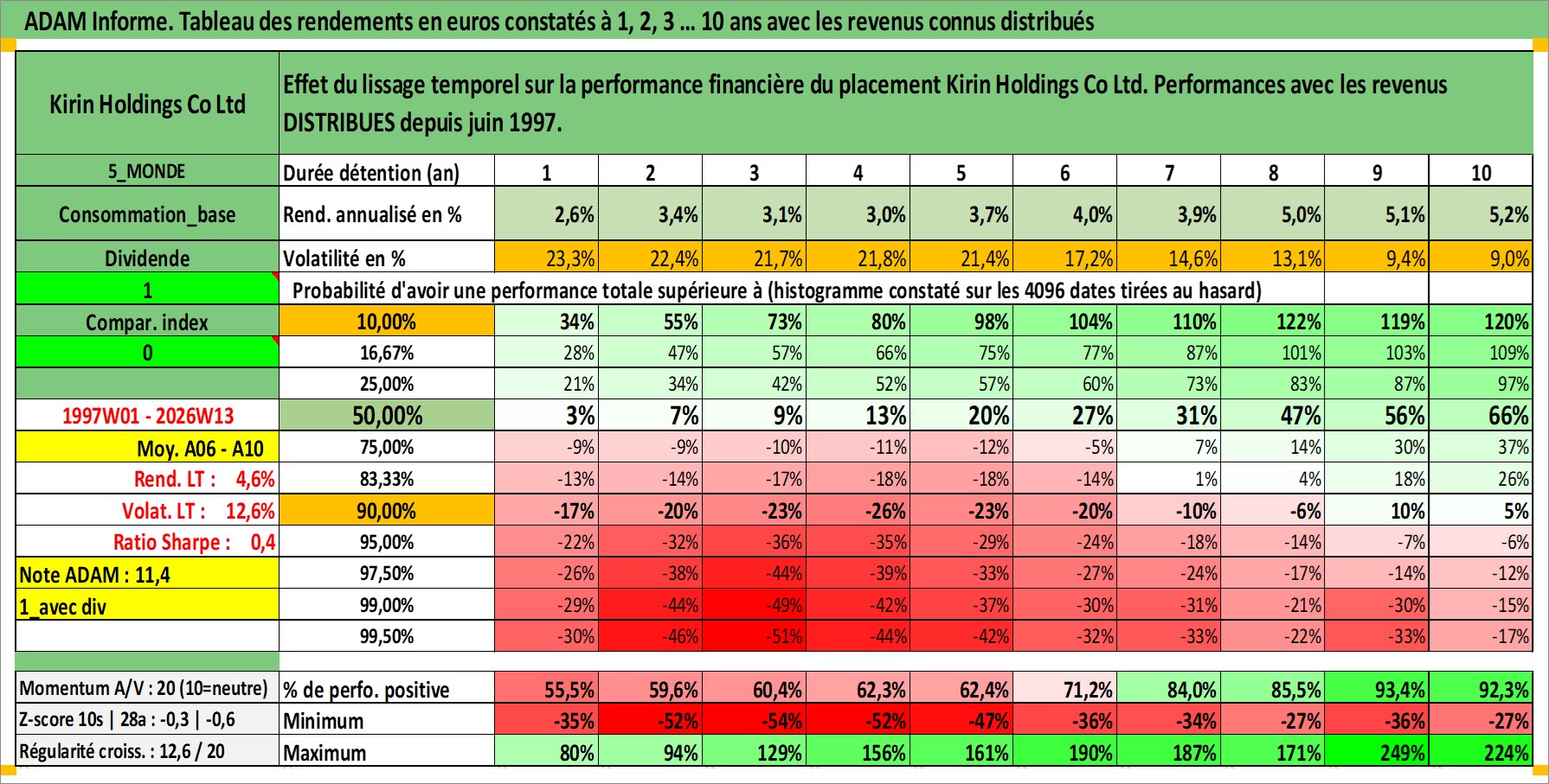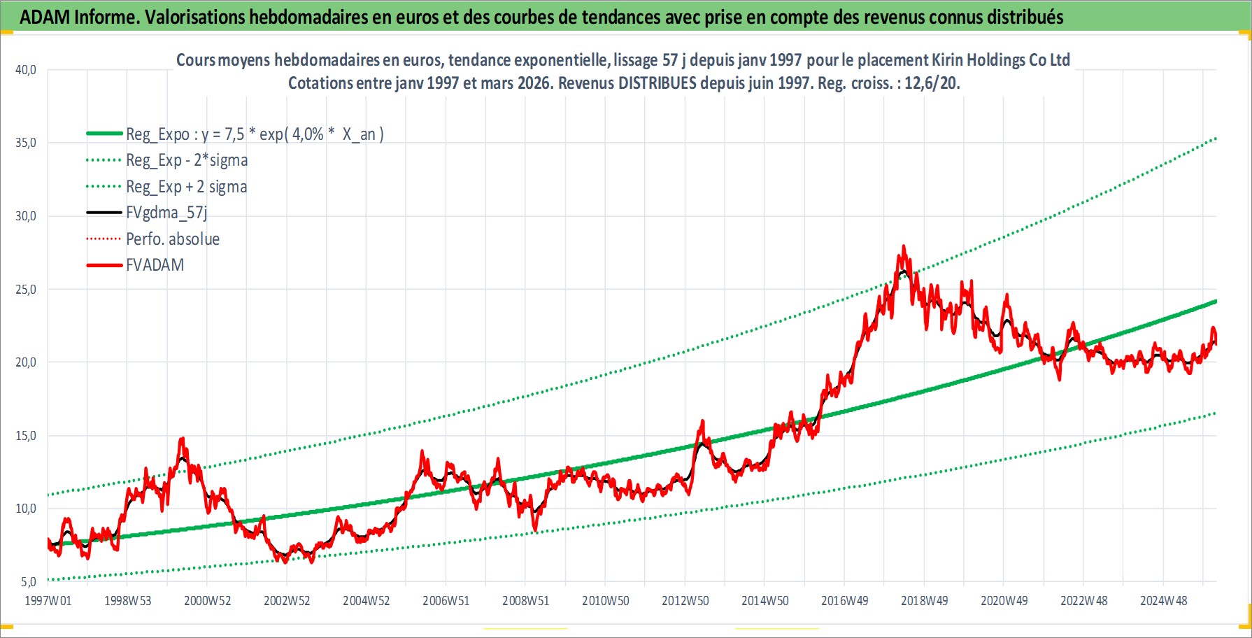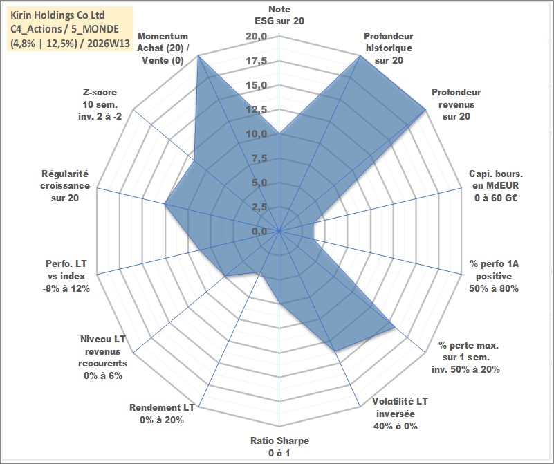 Site dédié aux investisseursPage dédiée sur site financeAnalyse des valorisations hebdomadaires de l'action Kirin Holdings Co Ltd. Cet actif est cote en JPY. Les valorisations sont en contrevaleur EURO et couvrent les semaines 1997W01 a 2026W13. Les revenus de cet actif financier sont pris en compte depuis la semaine 1997W26. La note globale ESG de cet actif est estimee a 10.0 (apres rebasage entre 0 et 20).