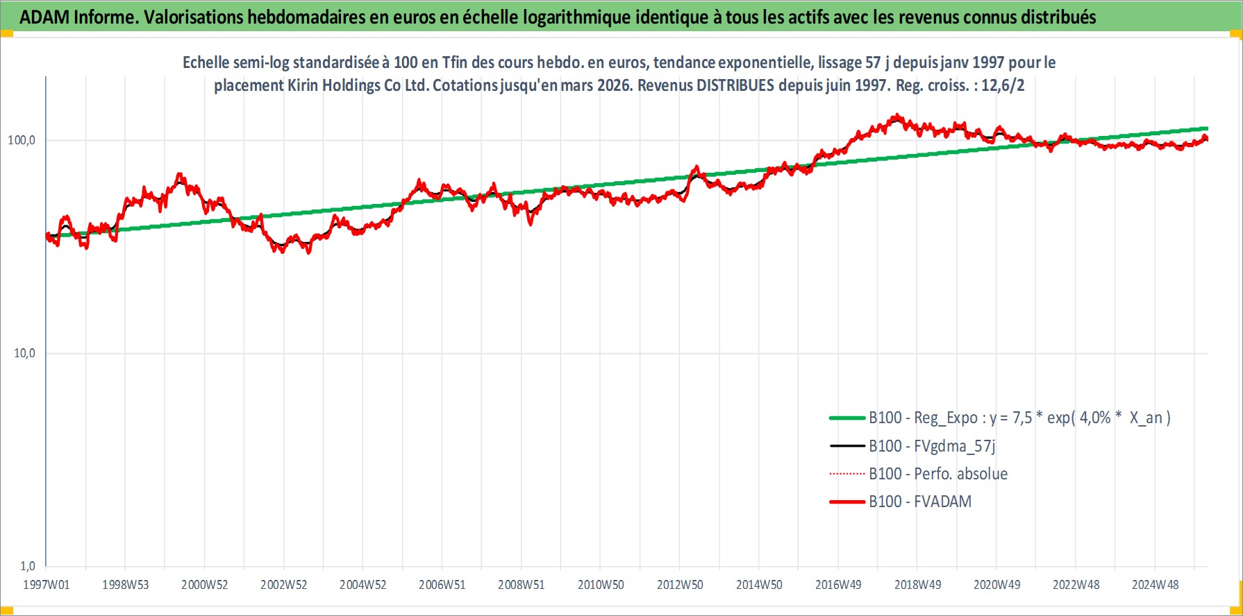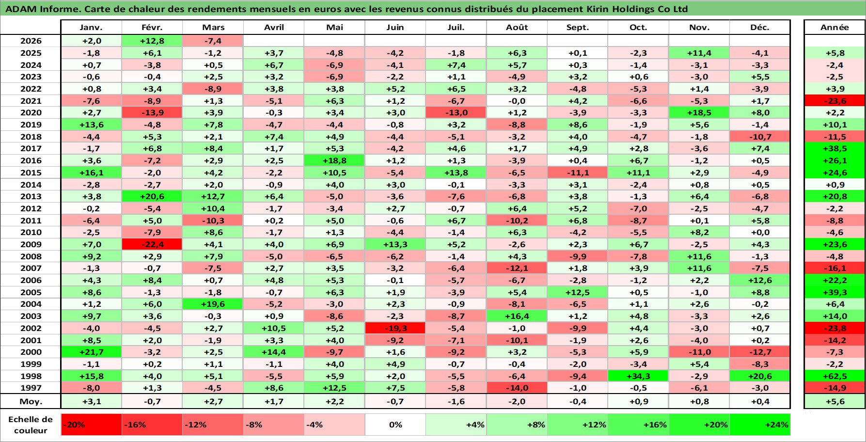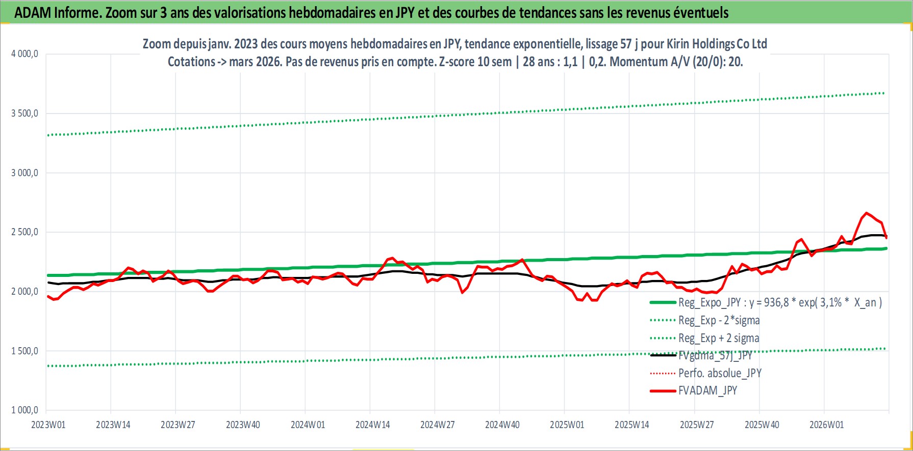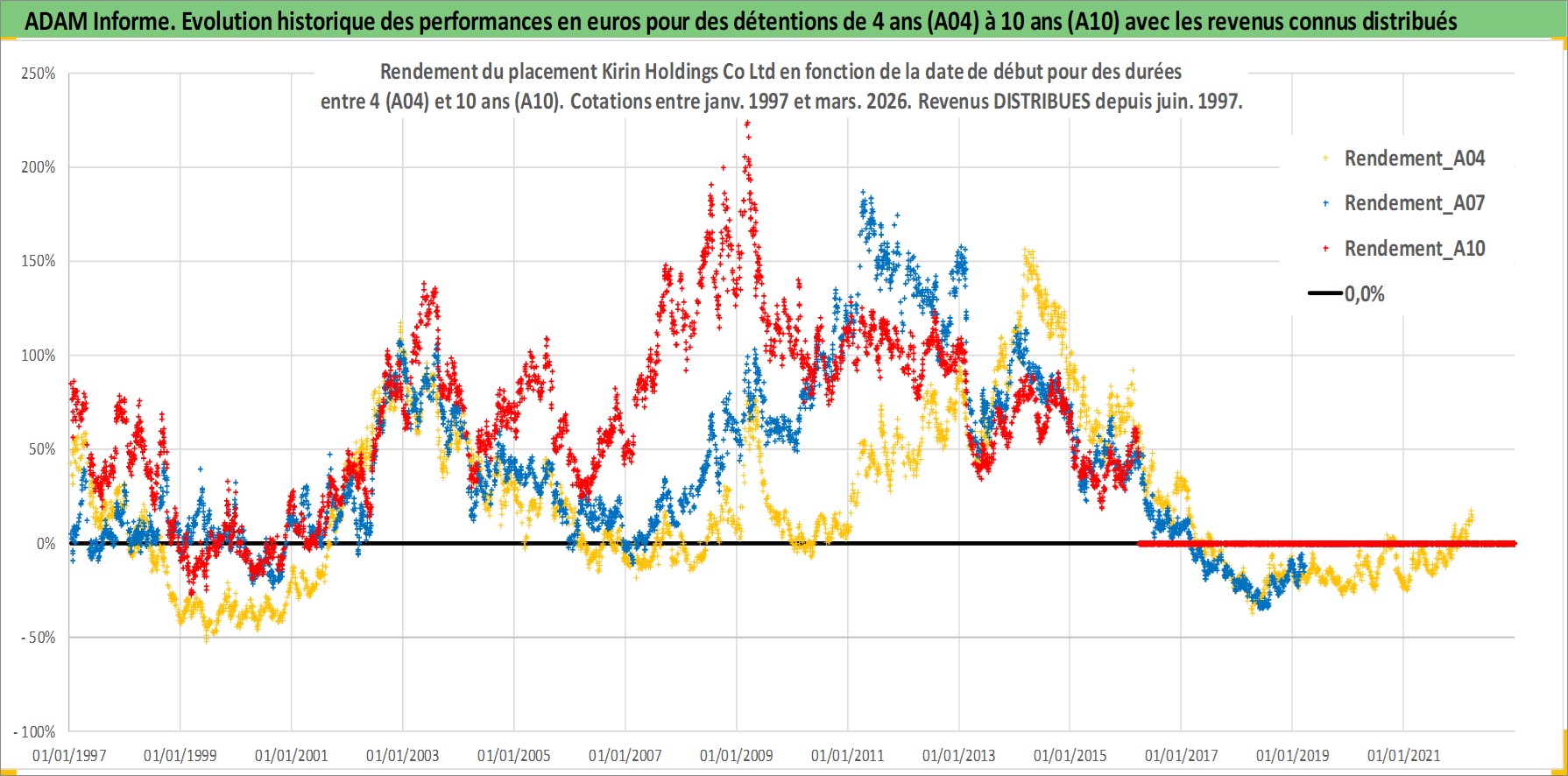 Site dédié aux investisseursPage dédiée sur site financeAnalyse des valorisations hebdomadaires de l'action Kirin Holdings Co Ltd. Cet actif est cote en JPY. Les valorisations sont en contrevaleur EURO et couvrent les semaines 1997W01 a 2026W13. Les revenus de cet actif financier sont pris en compte depuis la semaine 1997W26. La note globale ESG de cet actif est estimee a 10.0 (apres rebasage entre 0 et 20).