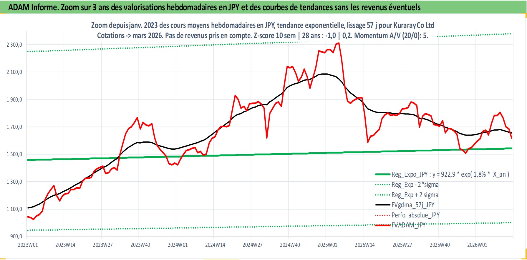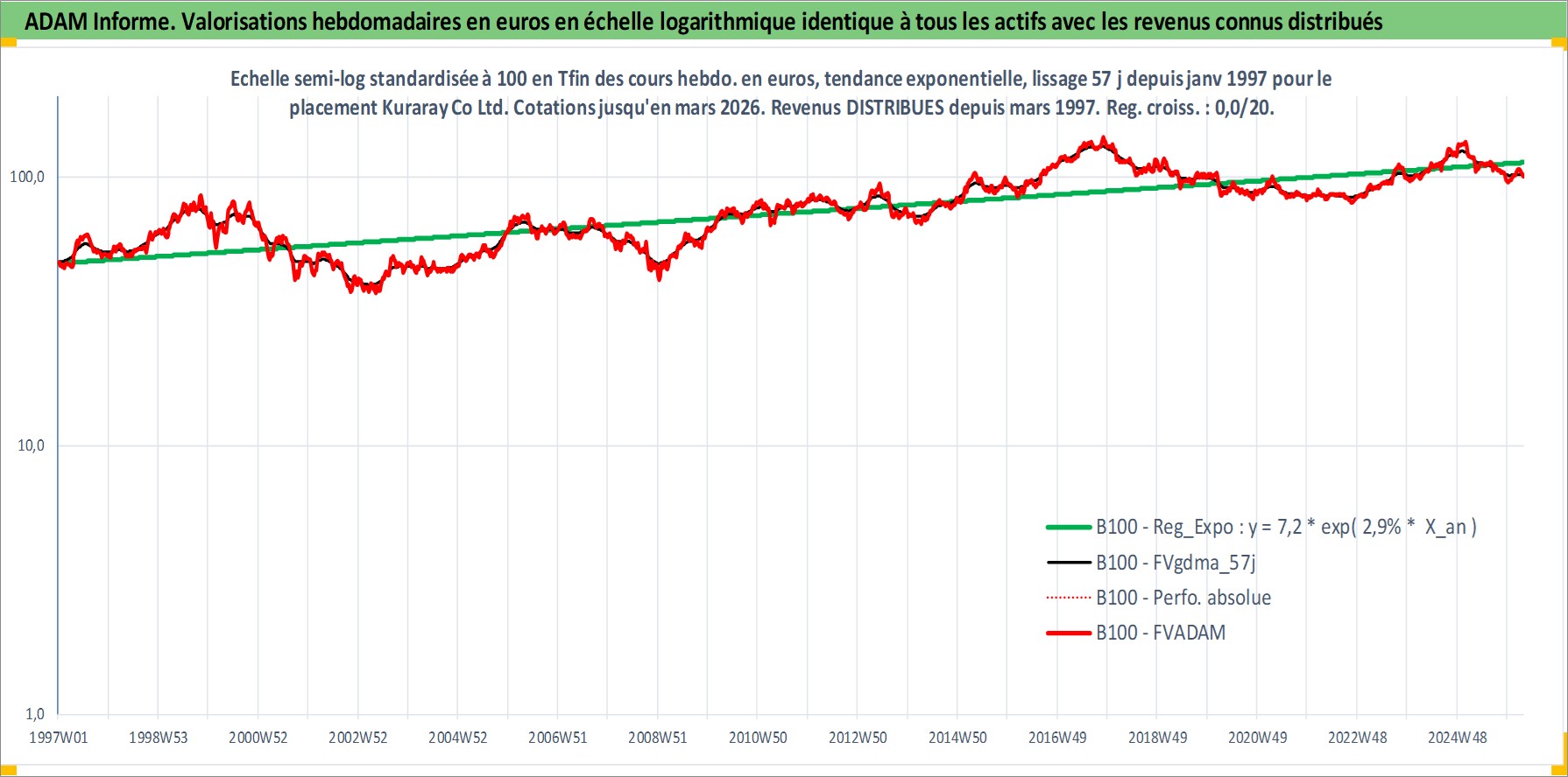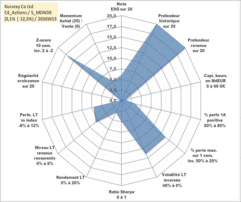 Site dédié aux investisseursPage dédiée sur site financeAnalyse des valorisations hebdomadaires de l'action Kuraray Co Ltd. Cet actif est cote en JPY. Les valorisations sont en contrevaleur EURO et couvrent les semaines 1997W01 a 2026W13. Les revenus de cet actif financier sont pris en compte depuis la semaine 1997W13. La note globale ESG de cet actif est estimee a 6.0 (apres rebasage entre 0 et 20).