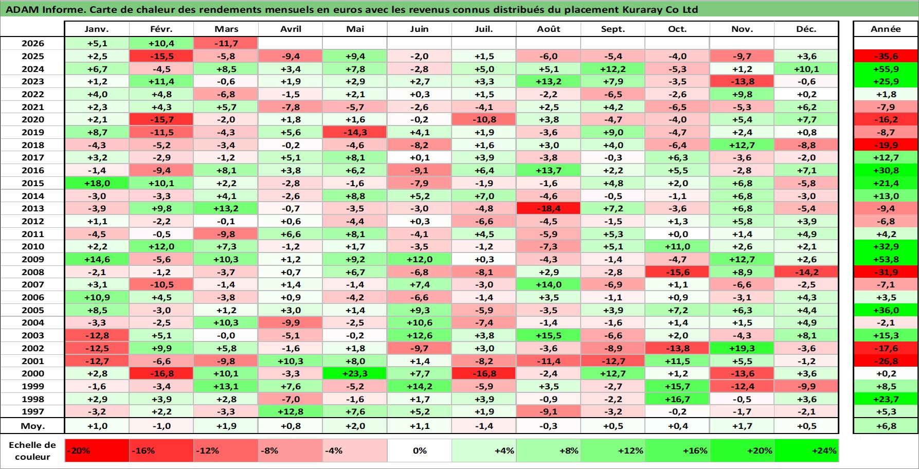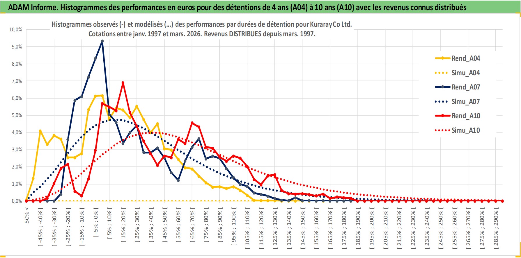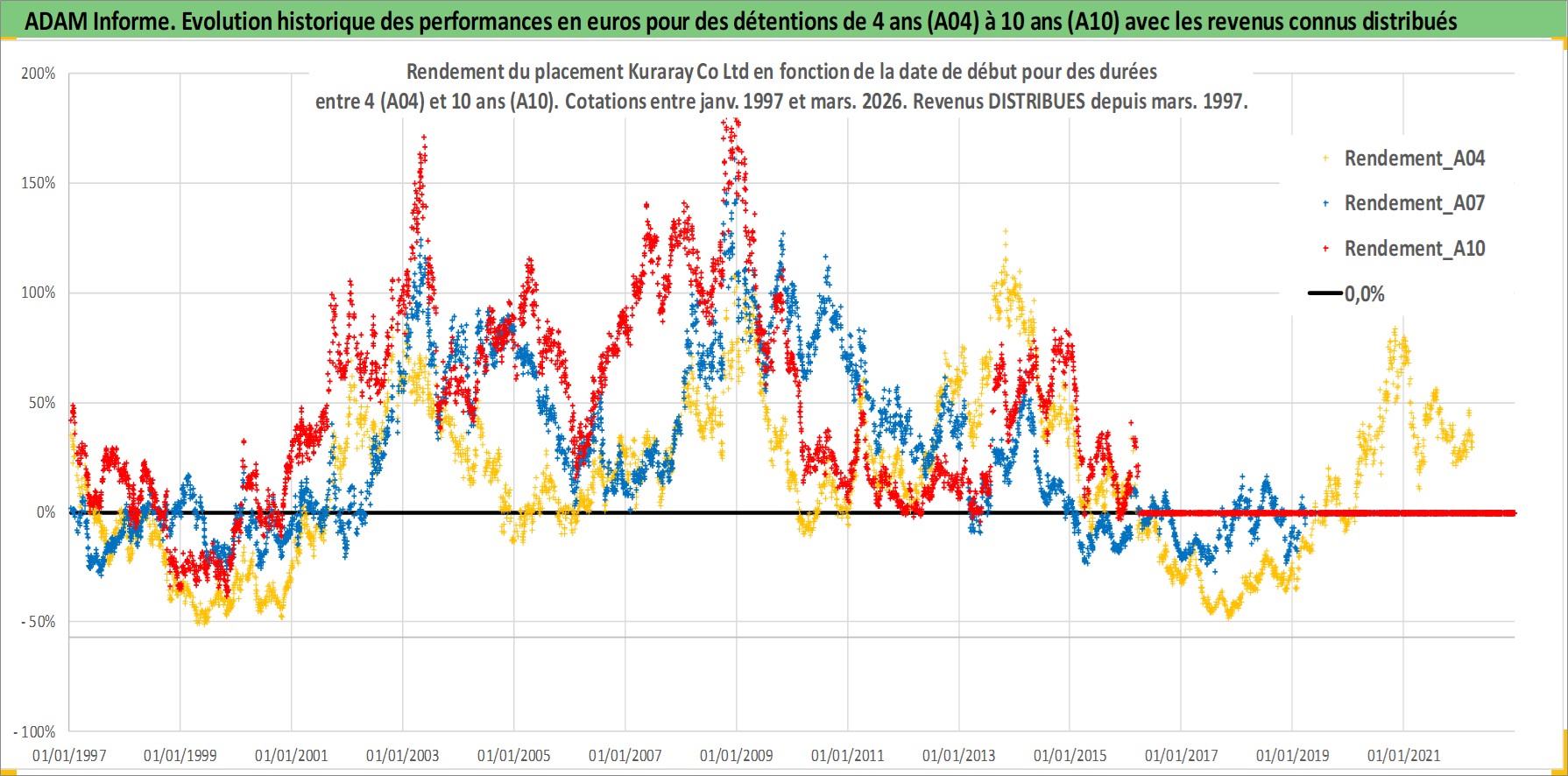 Site dédié aux investisseursPage dédiée sur site financeAnalyse des valorisations hebdomadaires de l'action Kuraray Co Ltd. Cet actif est cote en JPY. Les valorisations sont en contrevaleur EURO et couvrent les semaines 1997W01 a 2026W13. Les revenus de cet actif financier sont pris en compte depuis la semaine 1997W13. La note globale ESG de cet actif est estimee a 6.0 (apres rebasage entre 0 et 20).
