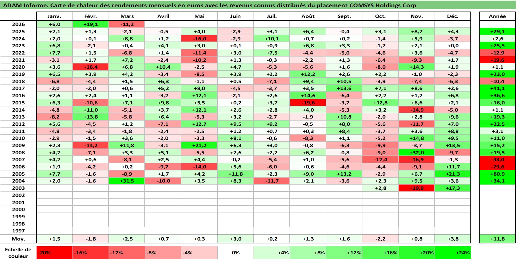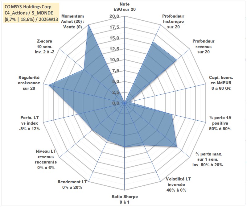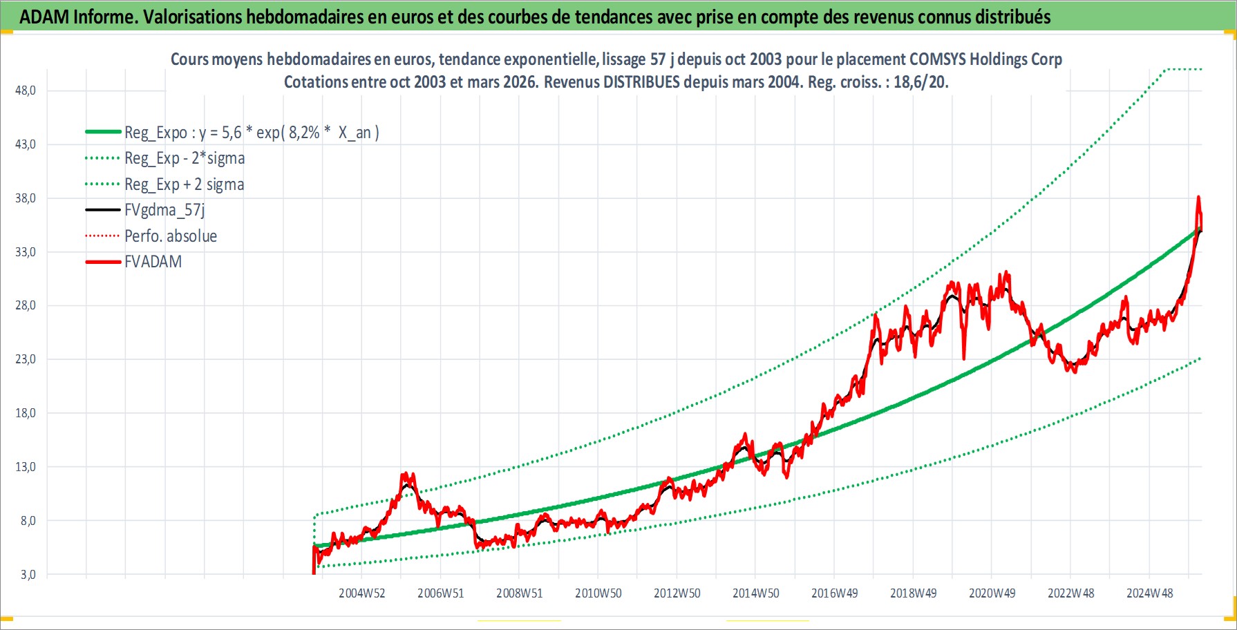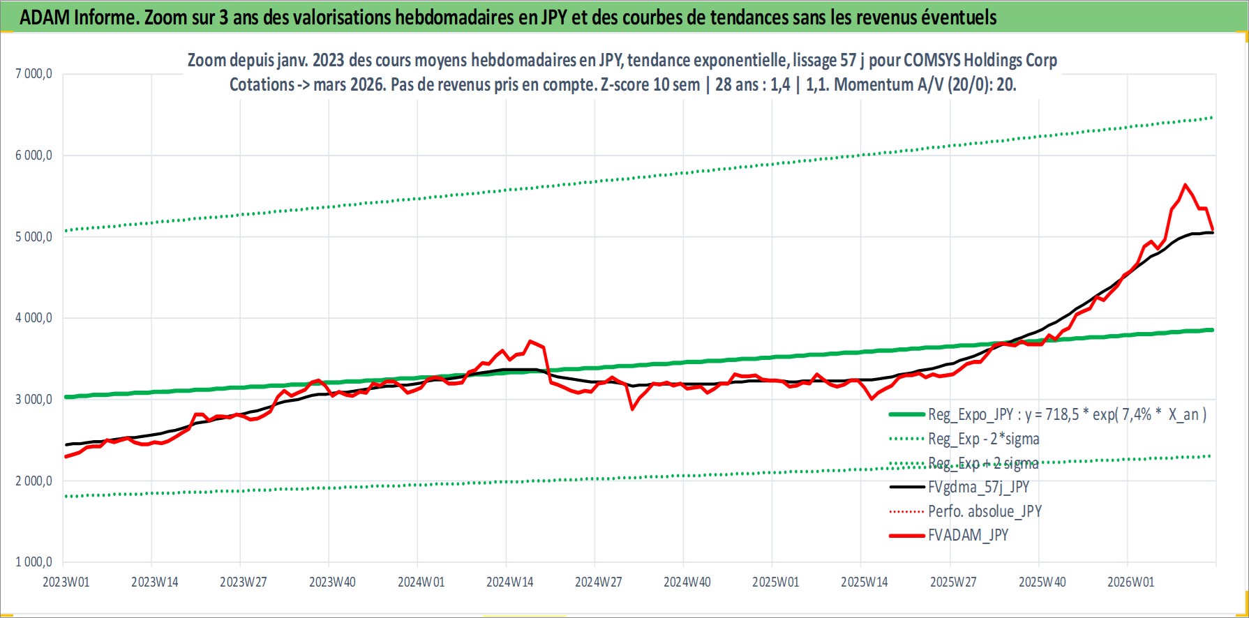 Site dédié aux investisseursPage dédiée sur site financeAnalyse des valorisations hebdomadaires de l'action COMSYS Holdings Corp. Cet actif est cote en JPY. Les valorisations sont en contrevaleur EURO et couvrent les semaines 2003W41 a 2026W13. Les revenus de cet actif financier sont pris en compte depuis la semaine 2004W13. La note ESG de cet actif n'est pas connue.