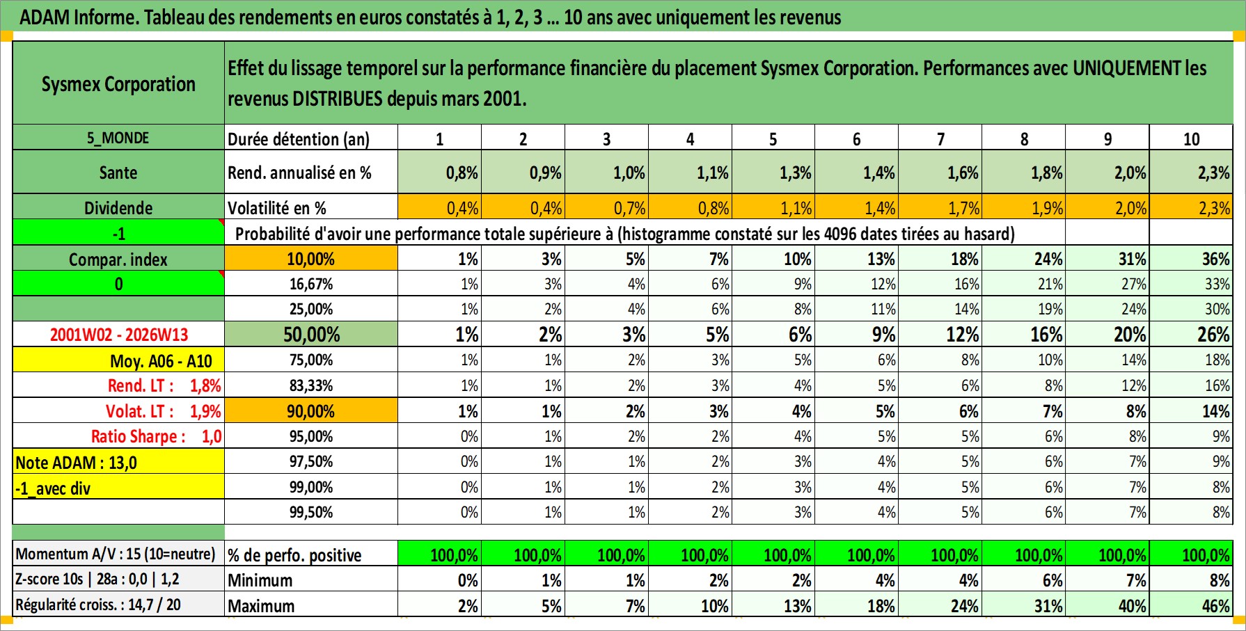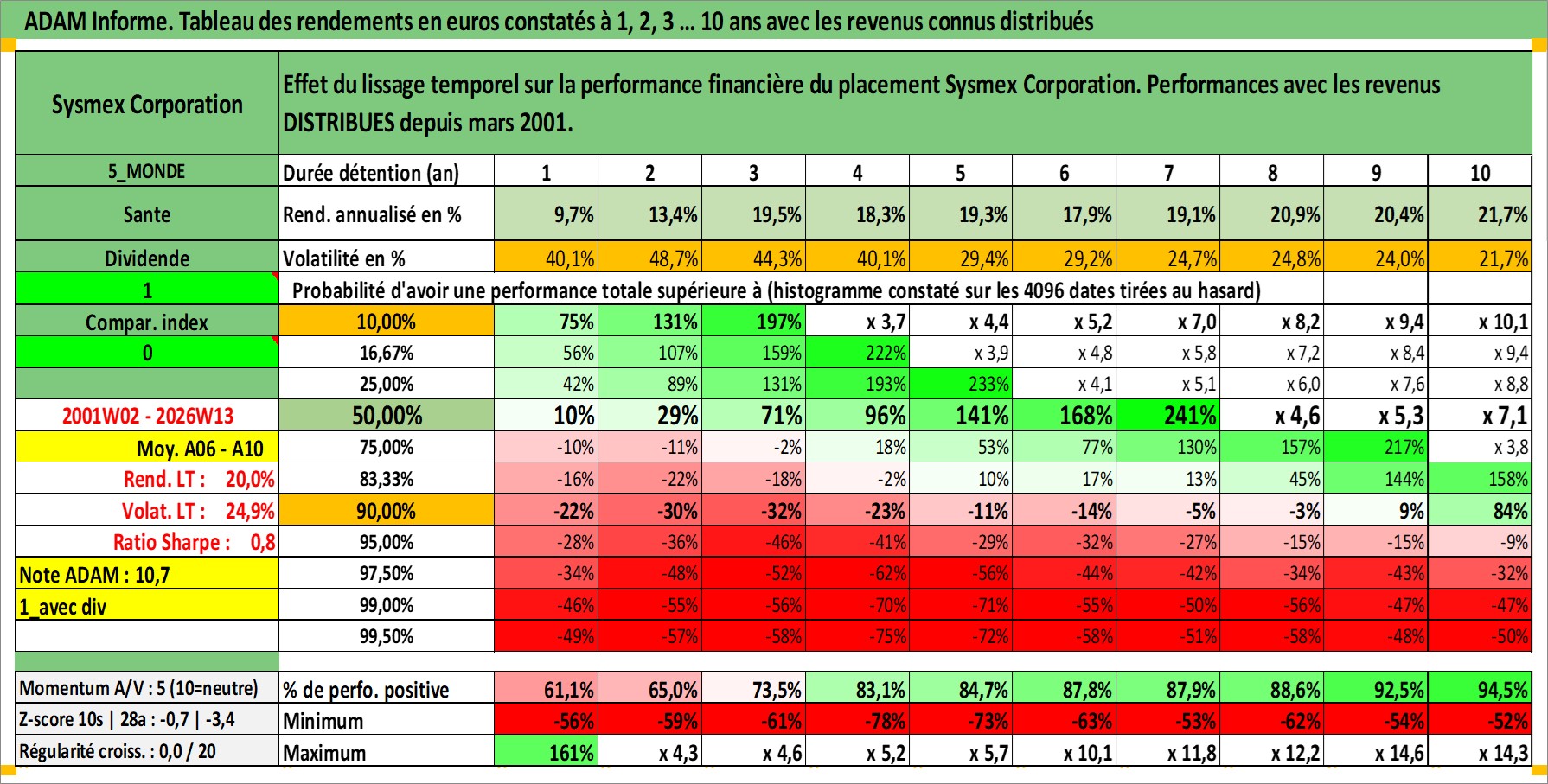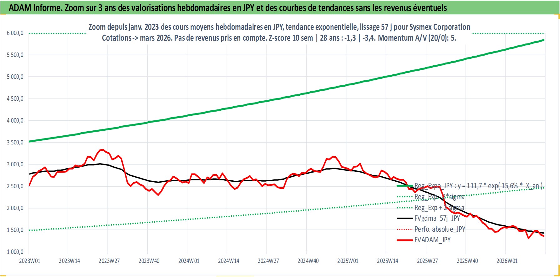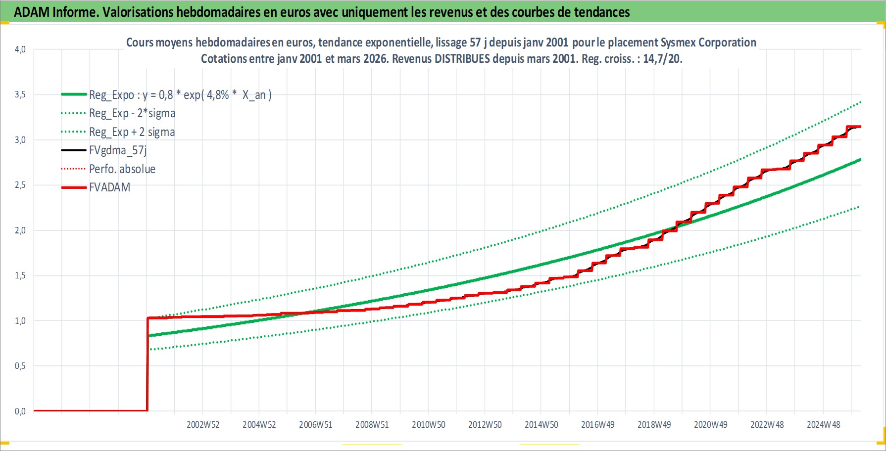 Site dédié aux investisseursPage dédiée sur site financeAnalyse des valorisations hebdomadaires de l'action Sysmex Corporation. Cet actif est cote en JPY. Les valorisations sont en contrevaleur EURO et couvrent les semaines 2001W02 a 2026W13. Les revenus de cet actif financier sont pris en compte depuis la semaine 2001W13. La note globale ESG de cet actif est estimee a 7.0 (apres rebasage entre 0 et 20).