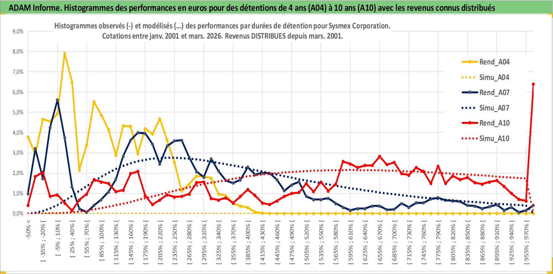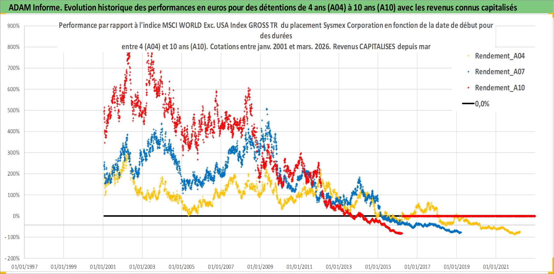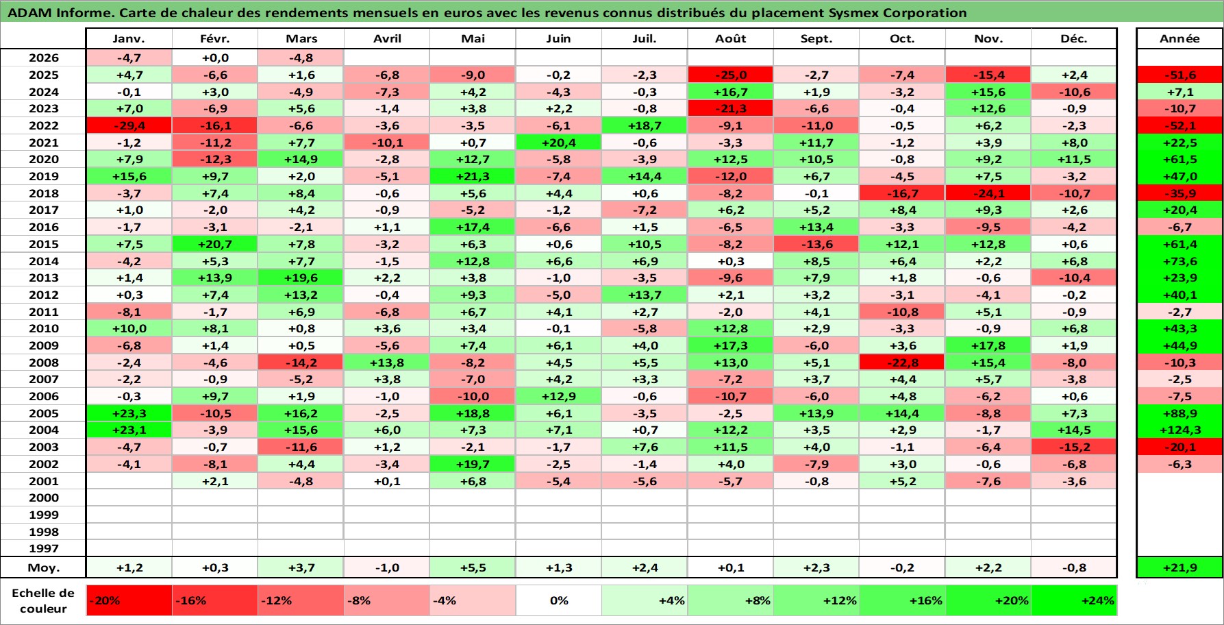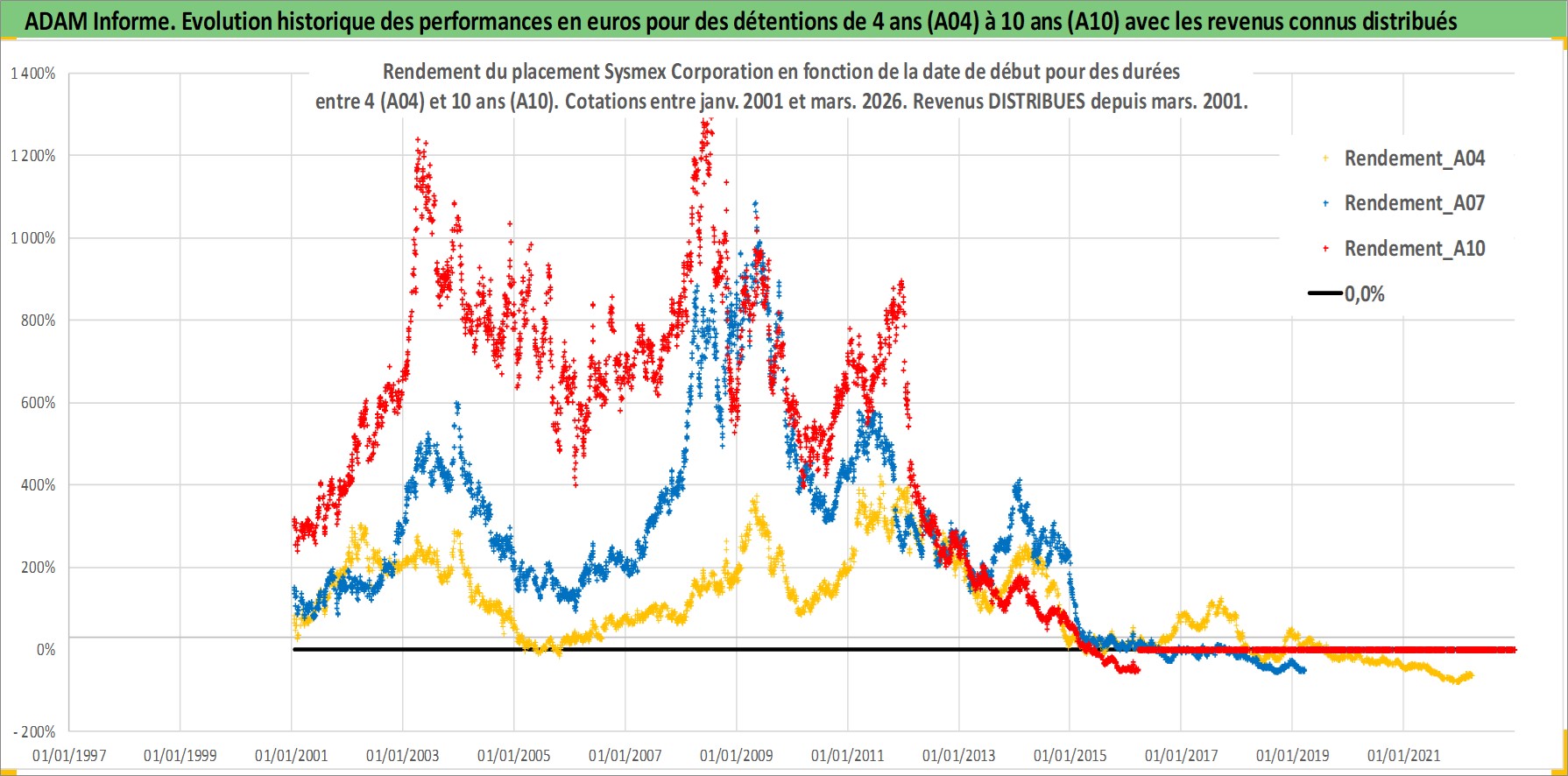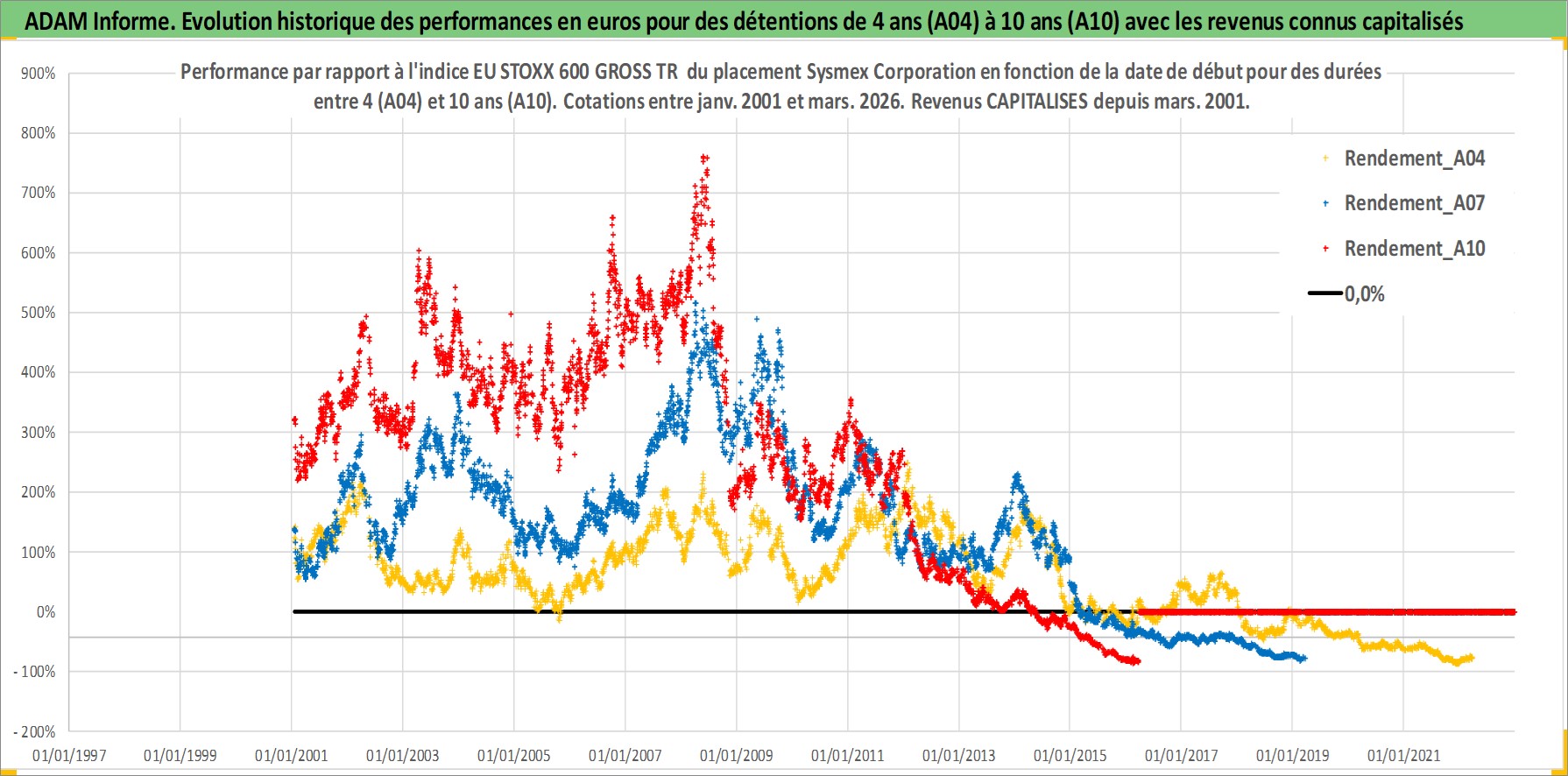 Site dédié aux investisseursPage dédiée sur site financeAnalyse des valorisations hebdomadaires de l'action Sysmex Corporation. Cet actif est cote en JPY. Les valorisations sont en contrevaleur EURO et couvrent les semaines 2001W02 a 2026W13. Les revenus de cet actif financier sont pris en compte depuis la semaine 2001W13. La note globale ESG de cet actif est estimee a 7.0 (apres rebasage entre 0 et 20).