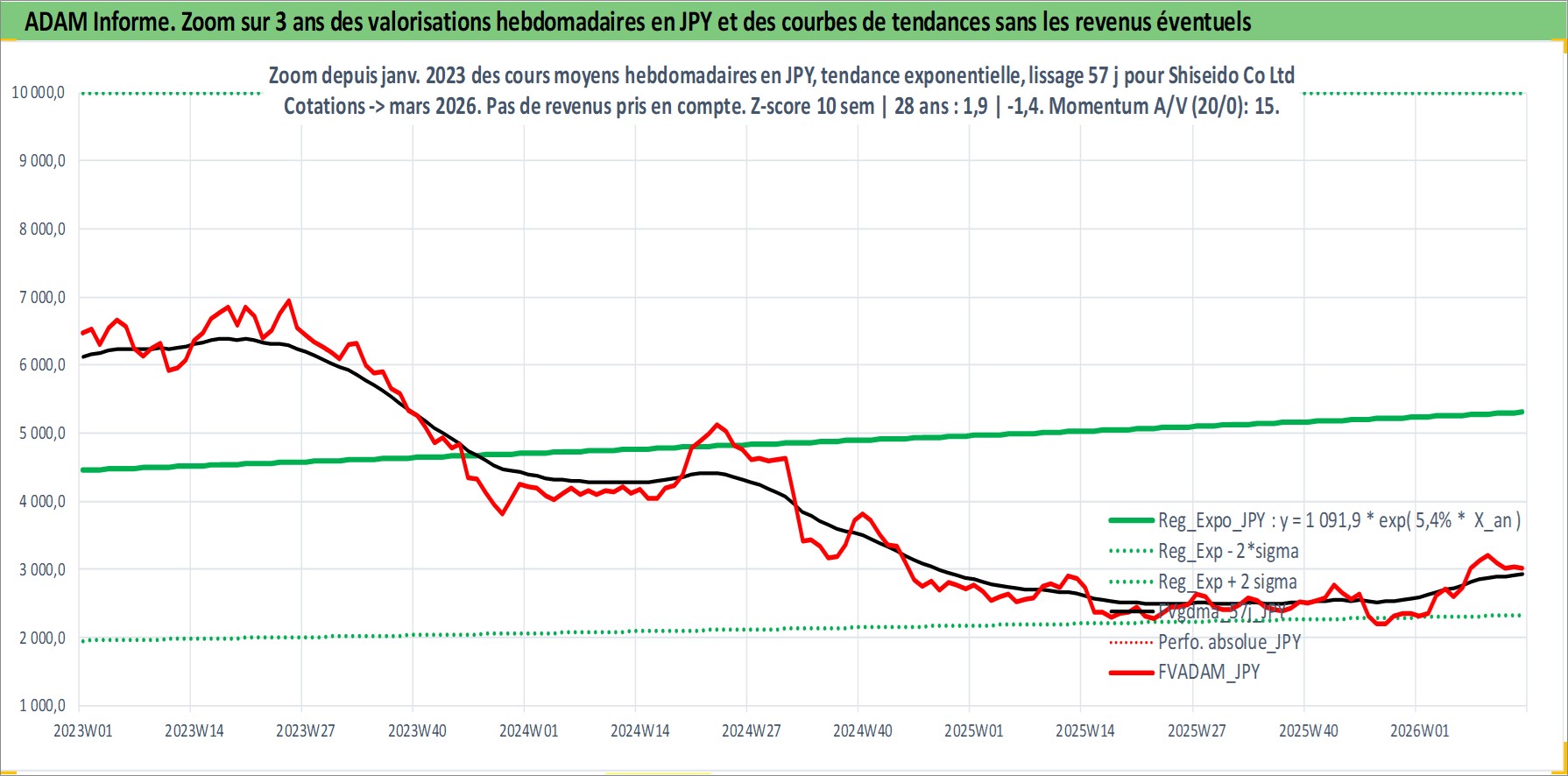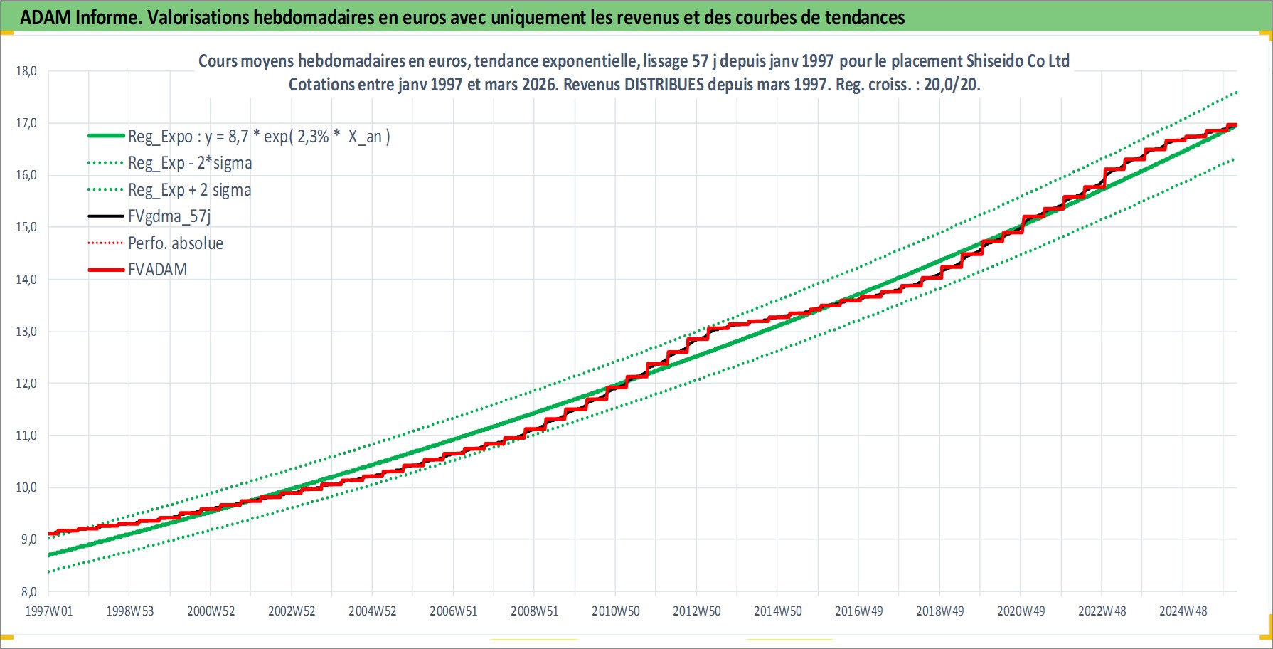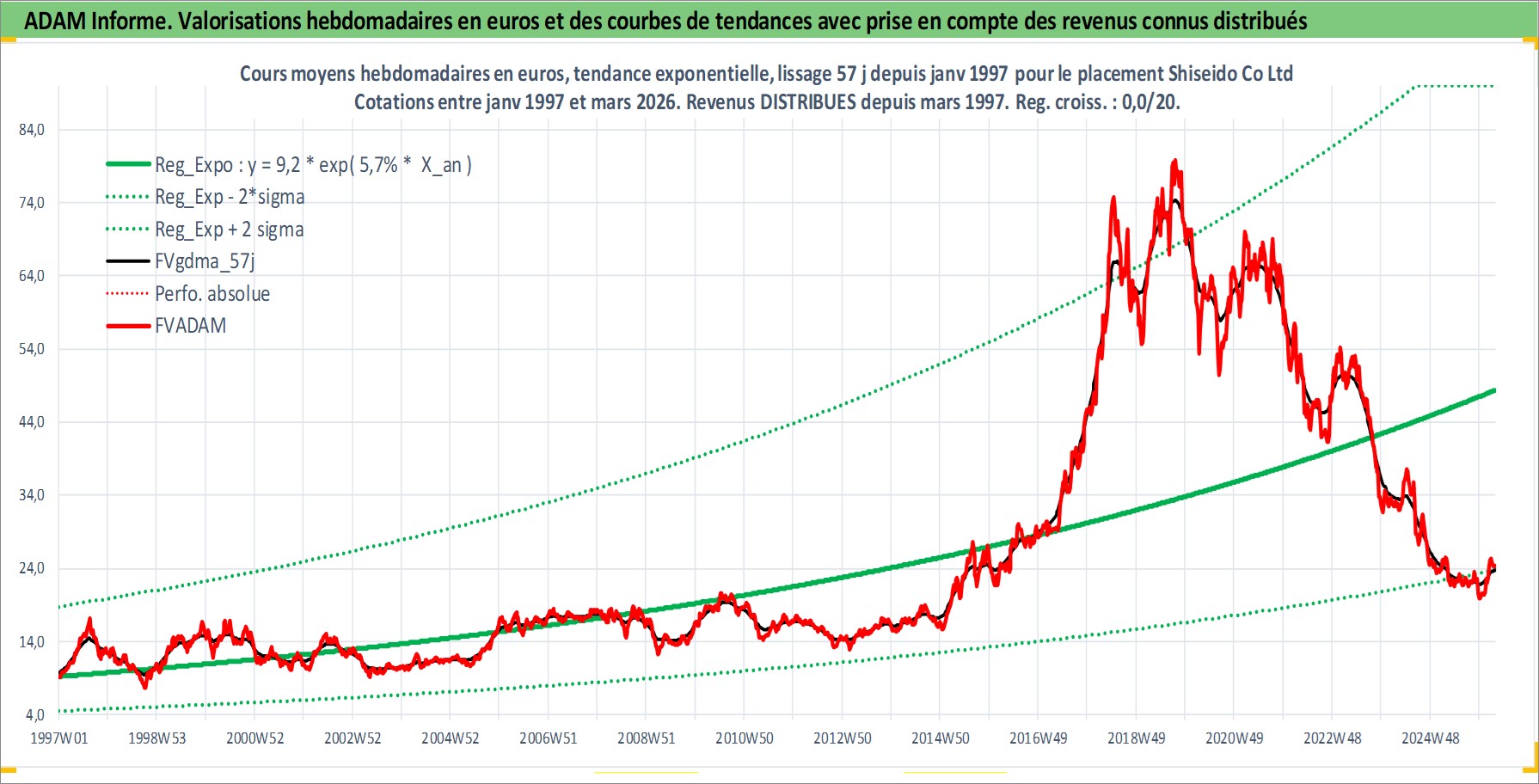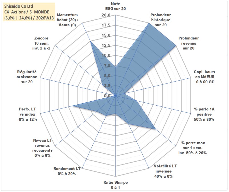 Site dédié aux investisseursPage dédiée sur site financeAnalyse des valorisations hebdomadaires de l'action Shiseido Co Ltd. Cet actif est cote en JPY. Les valorisations sont en contrevaleur EURO et couvrent les semaines 1997W01 a 2026W13. Les revenus de cet actif financier sont pris en compte depuis la semaine 1997W13. La note globale ESG de cet actif est estimee a 7.0 (apres rebasage entre 0 et 20).