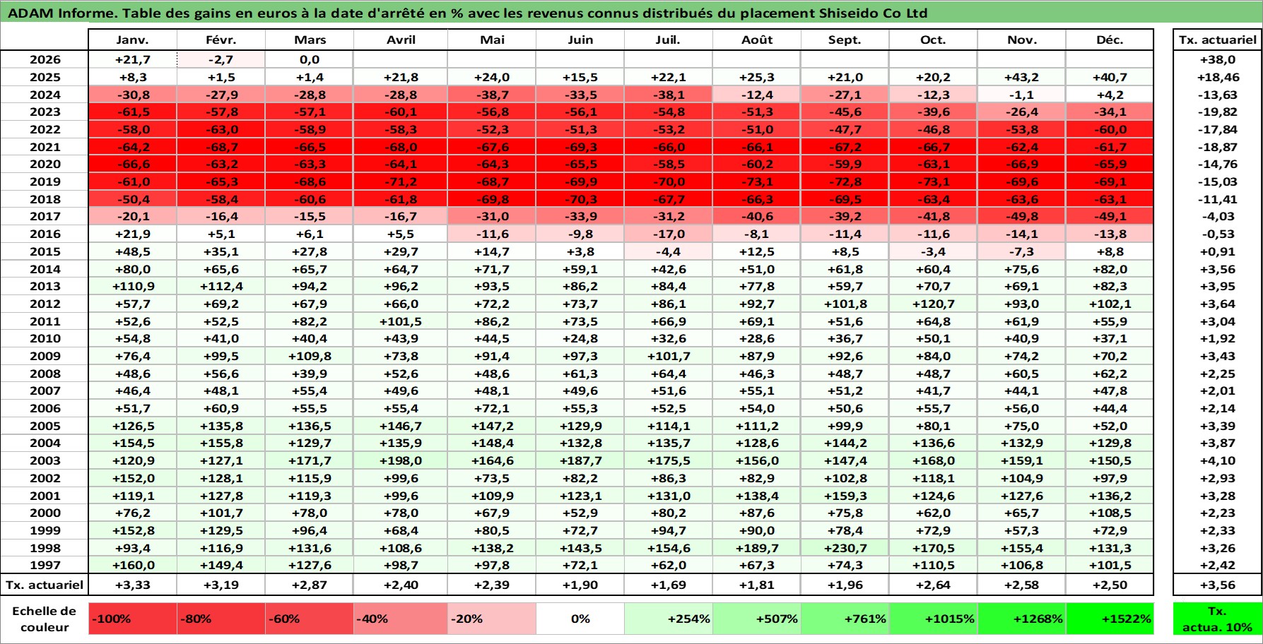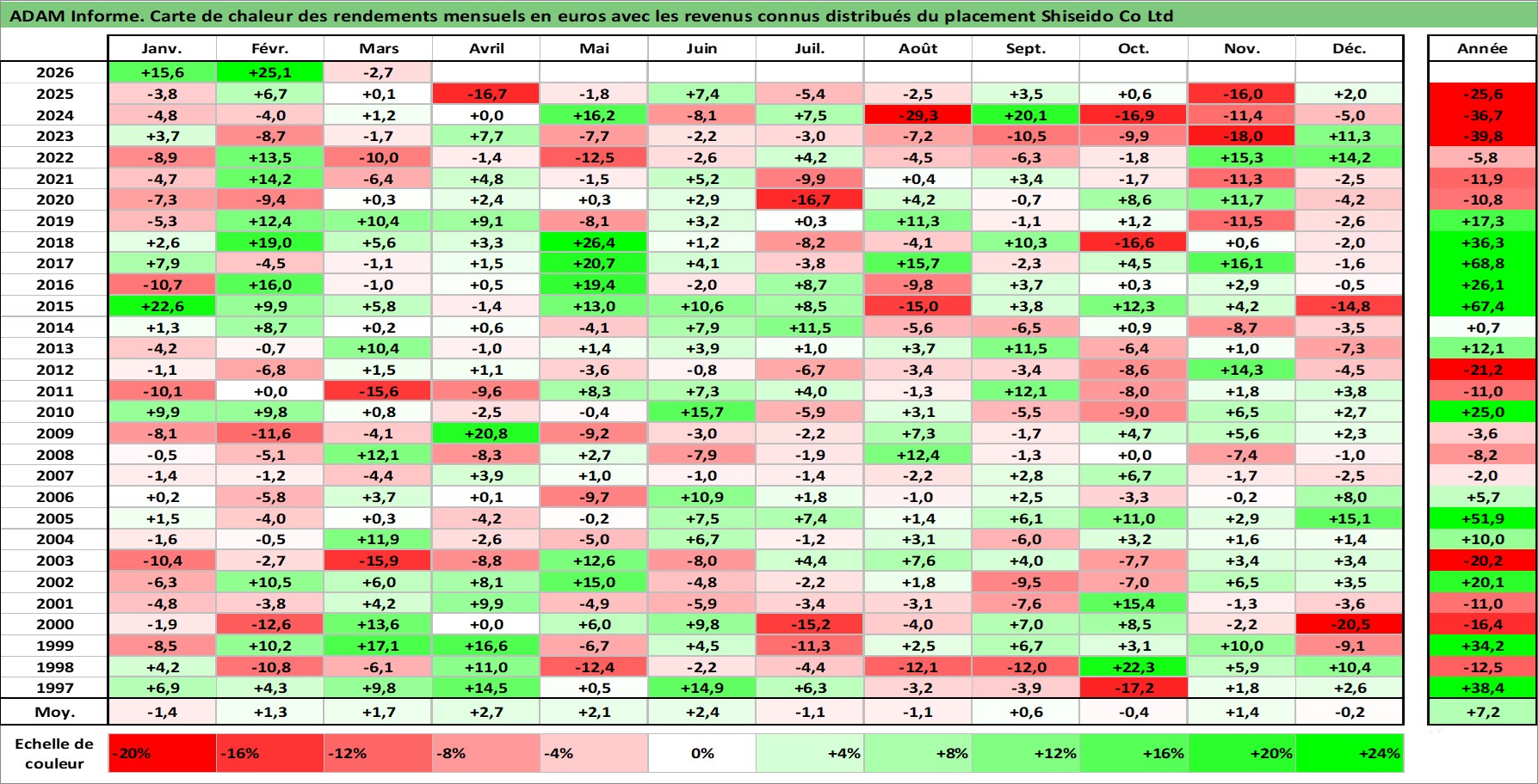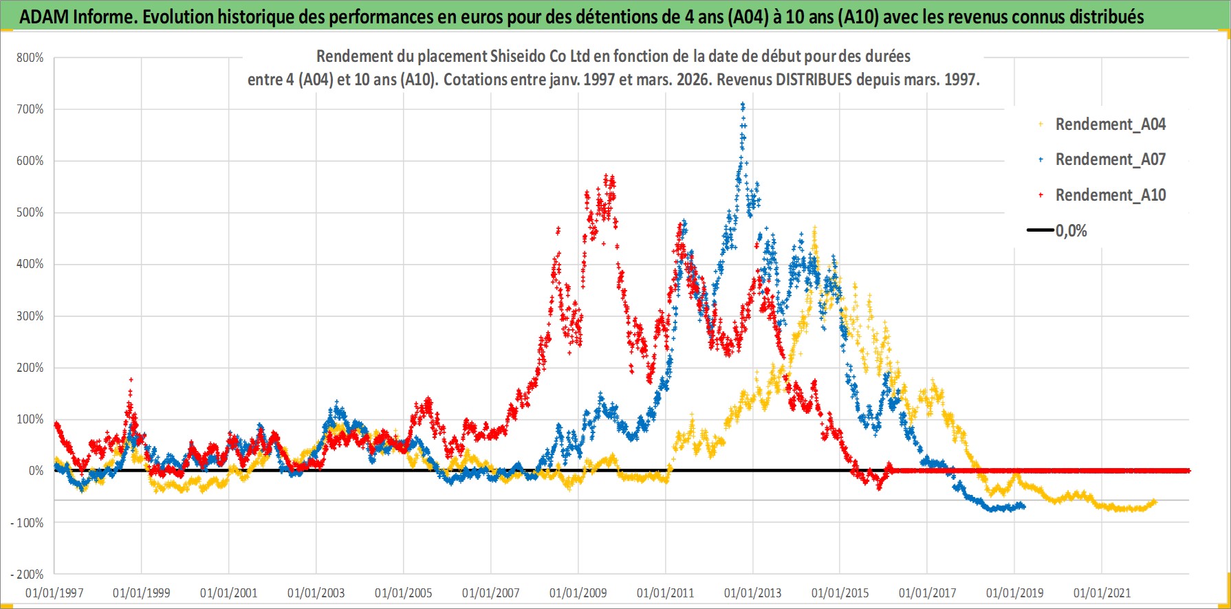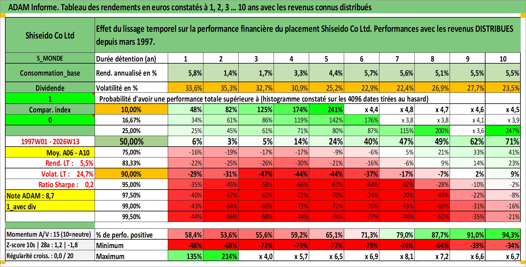 Site dédié aux investisseursPage dédiée sur site financeAnalyse des valorisations hebdomadaires de l'action Shiseido Co Ltd. Cet actif est cote en JPY. Les valorisations sont en contrevaleur EURO et couvrent les semaines 1997W01 a 2026W13. Les revenus de cet actif financier sont pris en compte depuis la semaine 1997W13. La note globale ESG de cet actif est estimee a 7.0 (apres rebasage entre 0 et 20).