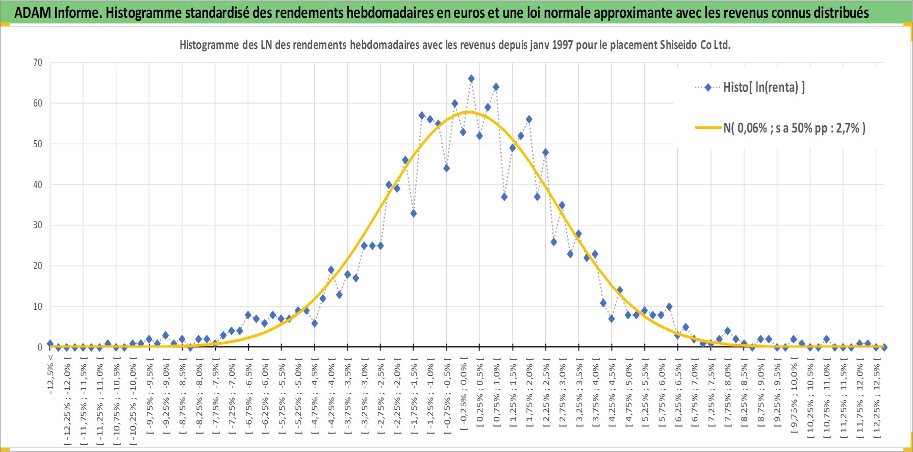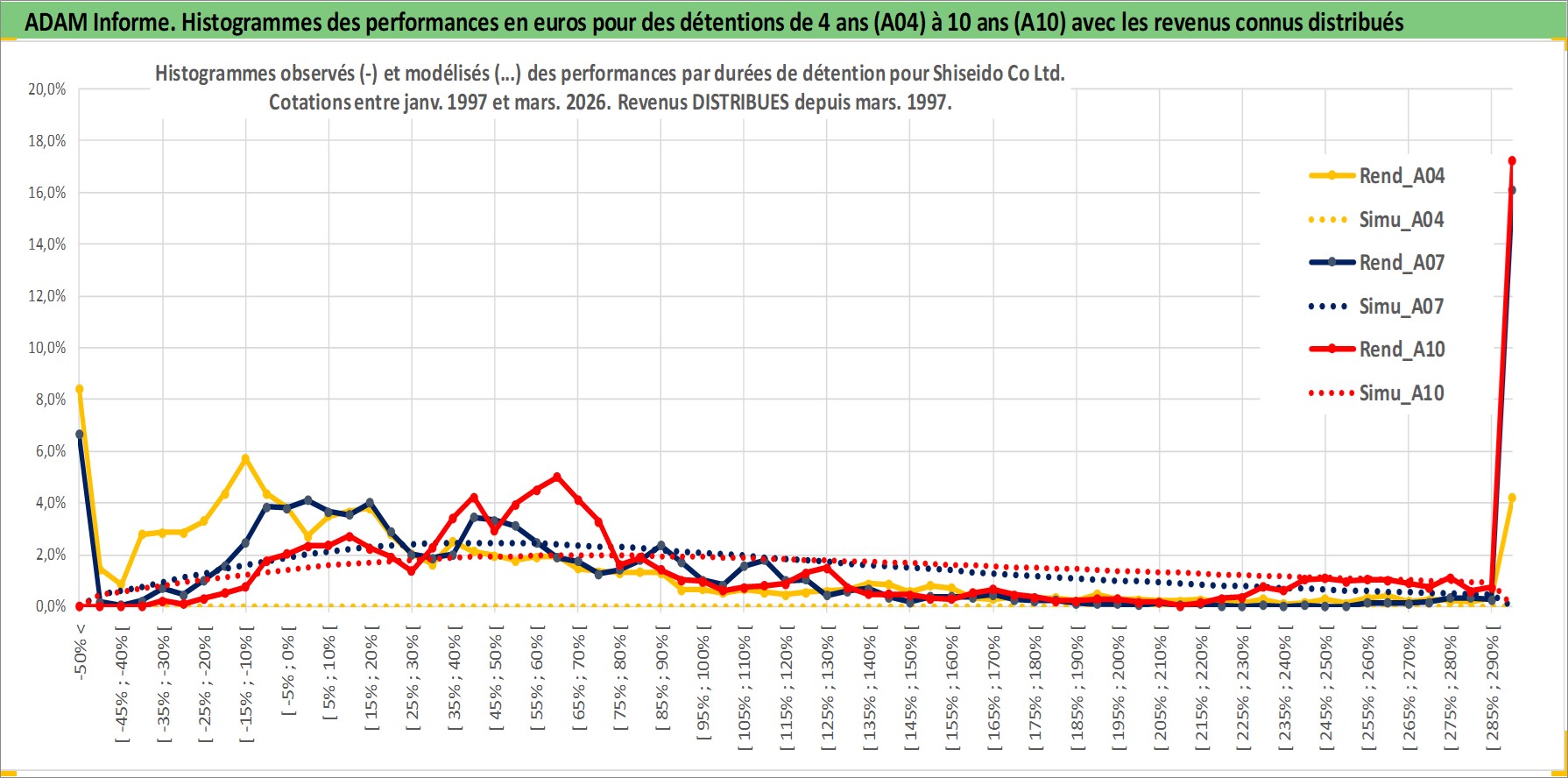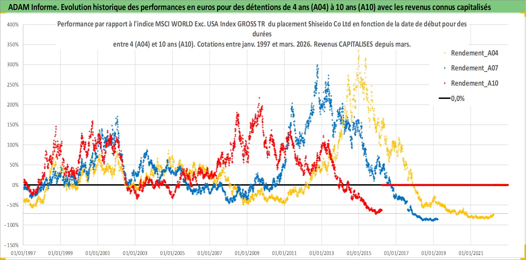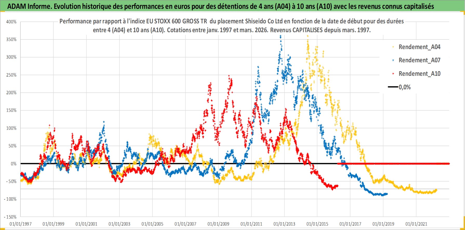 Site dédié aux investisseursPage dédiée sur site financeAnalyse des valorisations hebdomadaires de l'action Shiseido Co Ltd. Cet actif est cote en JPY. Les valorisations sont en contrevaleur EURO et couvrent les semaines 1997W01 a 2026W13. Les revenus de cet actif financier sont pris en compte depuis la semaine 1997W13. La note globale ESG de cet actif est estimee a 7.0 (apres rebasage entre 0 et 20).