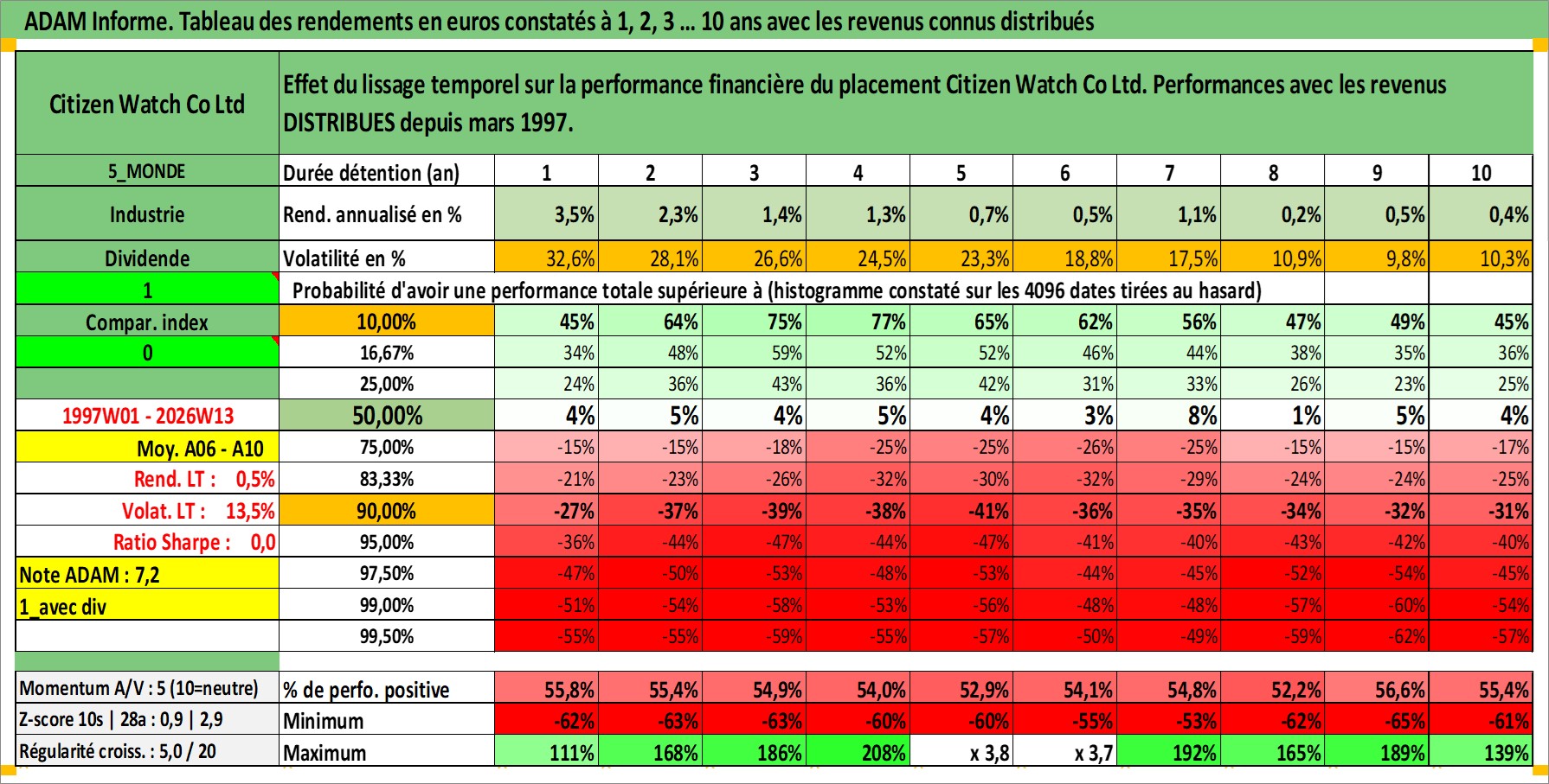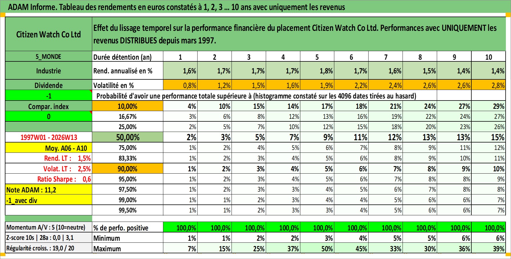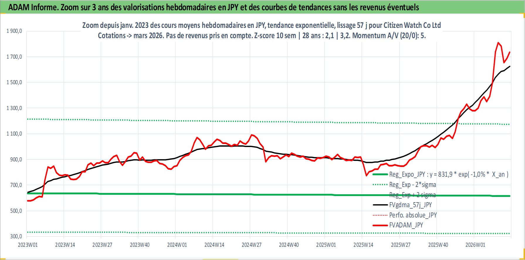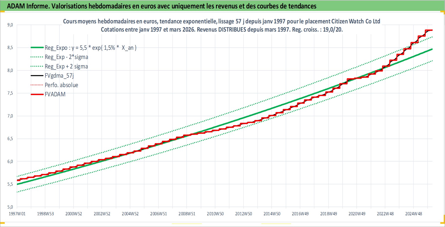 Site dédié aux investisseursPage dédiée sur site financeAnalyse des valorisations hebdomadaires de l'action Citizen Watch Co Ltd. Cet actif est cote en JPY. Les valorisations sont en contrevaleur EURO et couvrent les semaines 1997W01 a 2026W13. Les revenus de cet actif financier sont pris en compte depuis la semaine 1997W13. La note ESG de cet actif n'est pas connue.