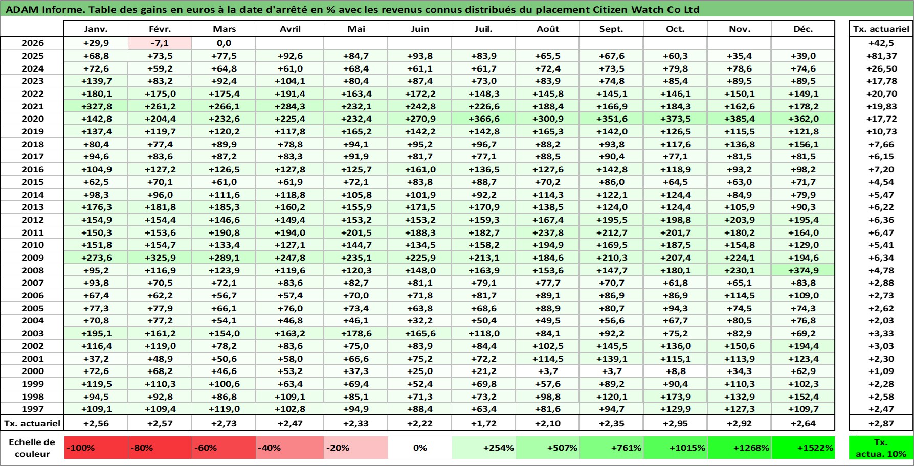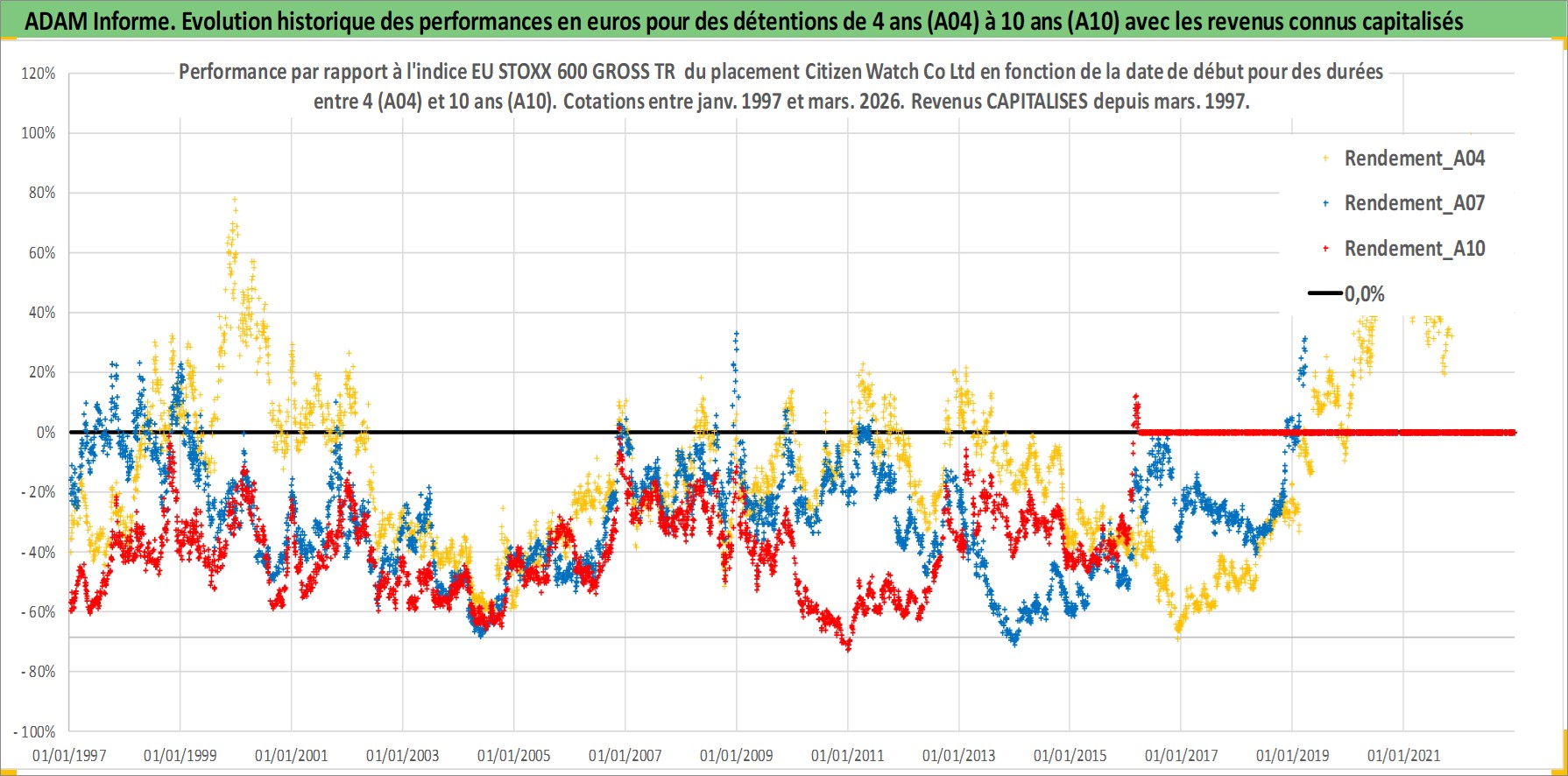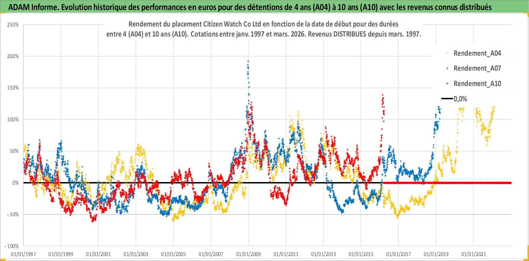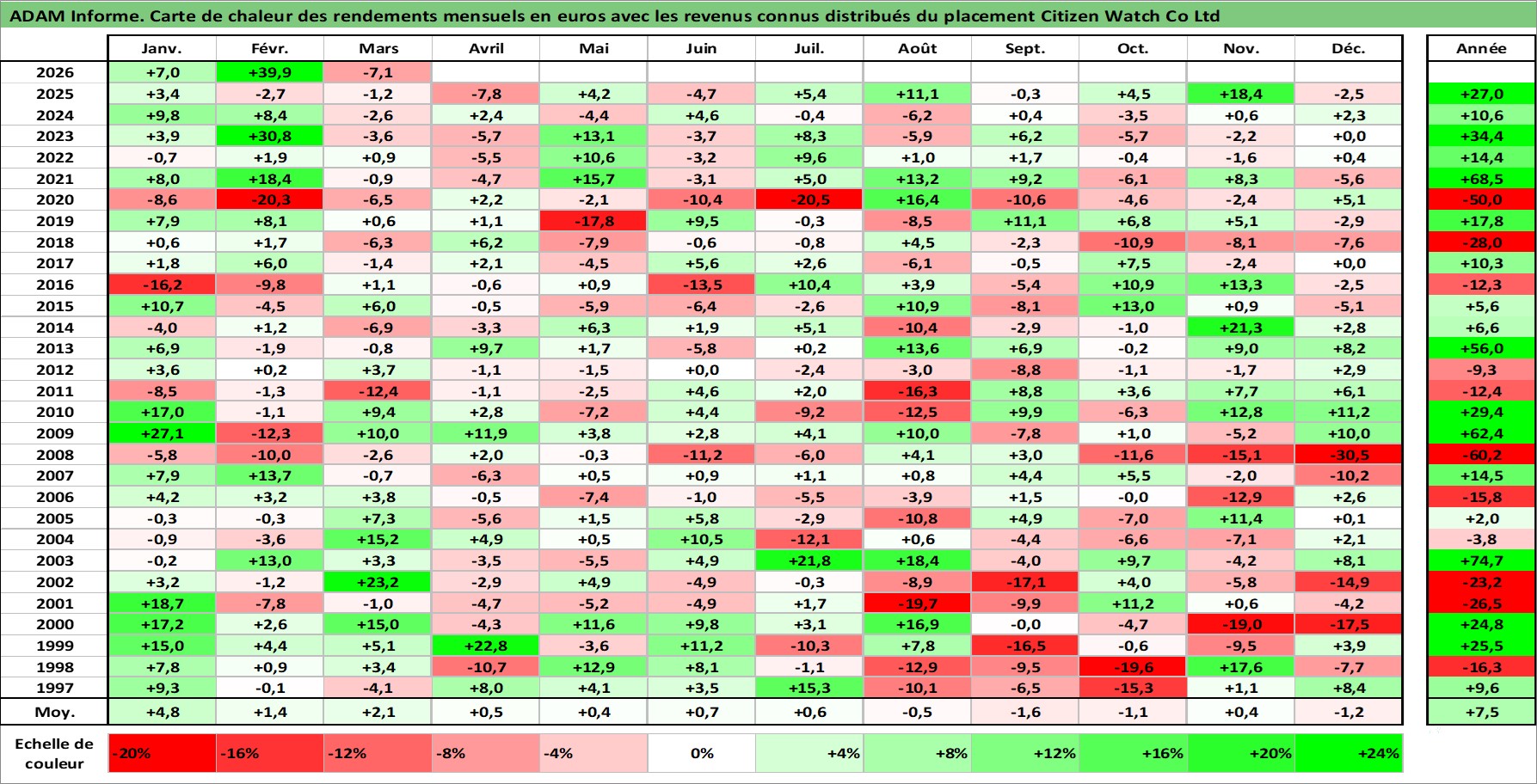 Site dédié aux investisseursPage dédiée sur site financeAnalyse des valorisations hebdomadaires de l'action Citizen Watch Co Ltd. Cet actif est cote en JPY. Les valorisations sont en contrevaleur EURO et couvrent les semaines 1997W01 a 2026W13. Les revenus de cet actif financier sont pris en compte depuis la semaine 1997W13. La note ESG de cet actif n'est pas connue.