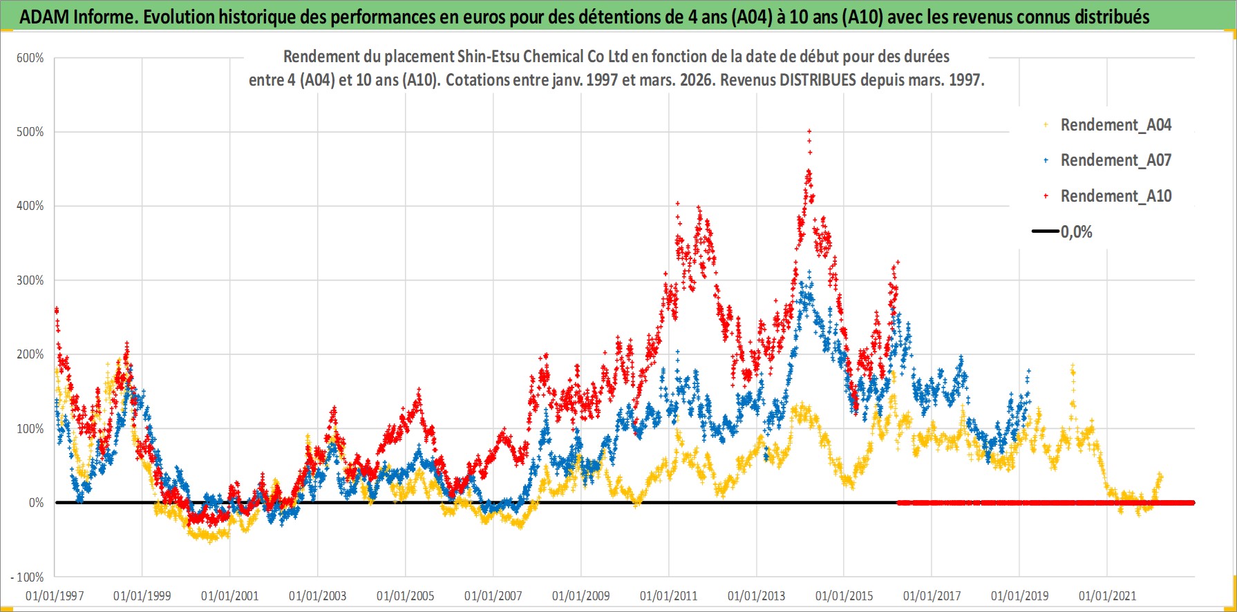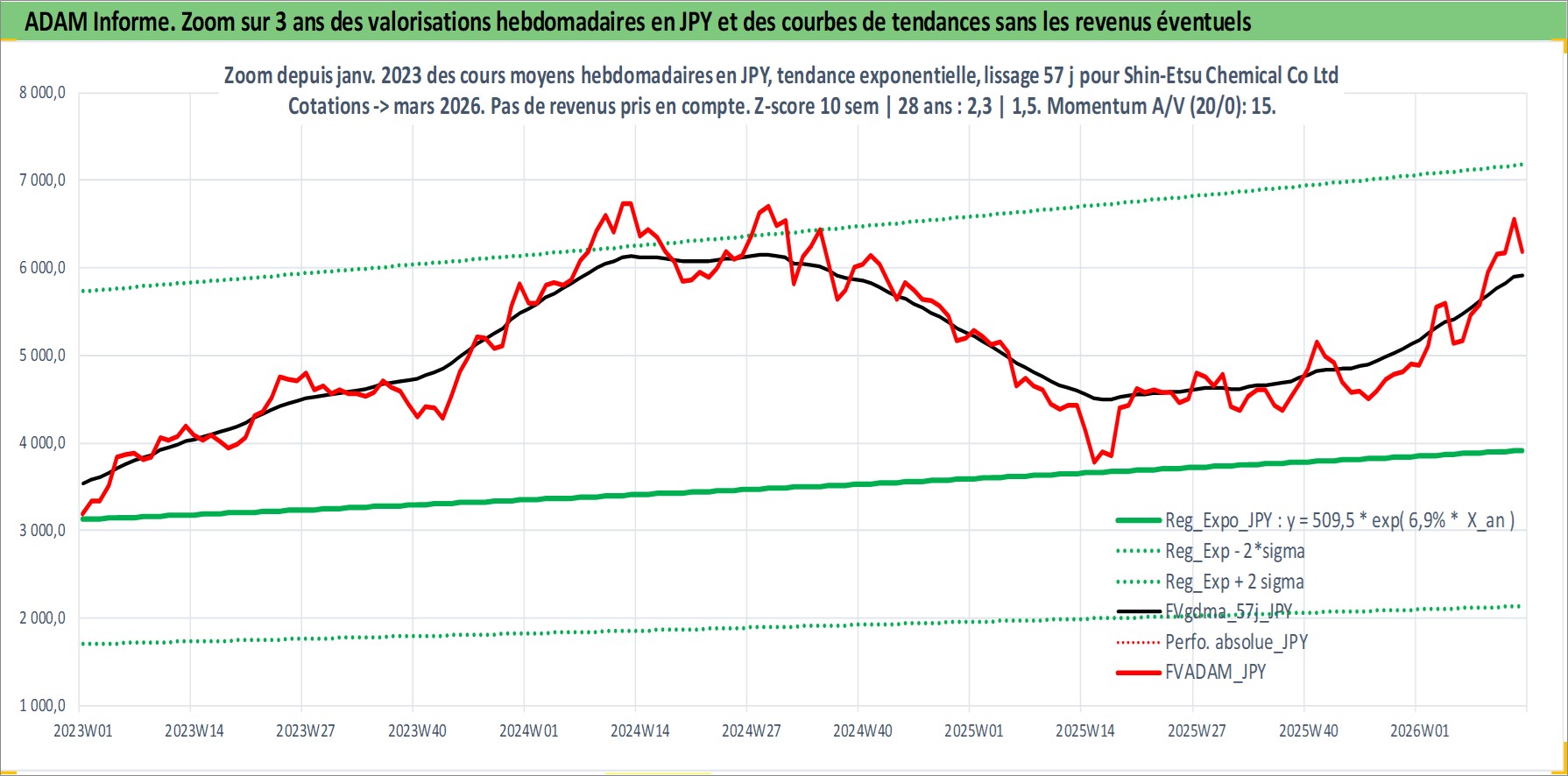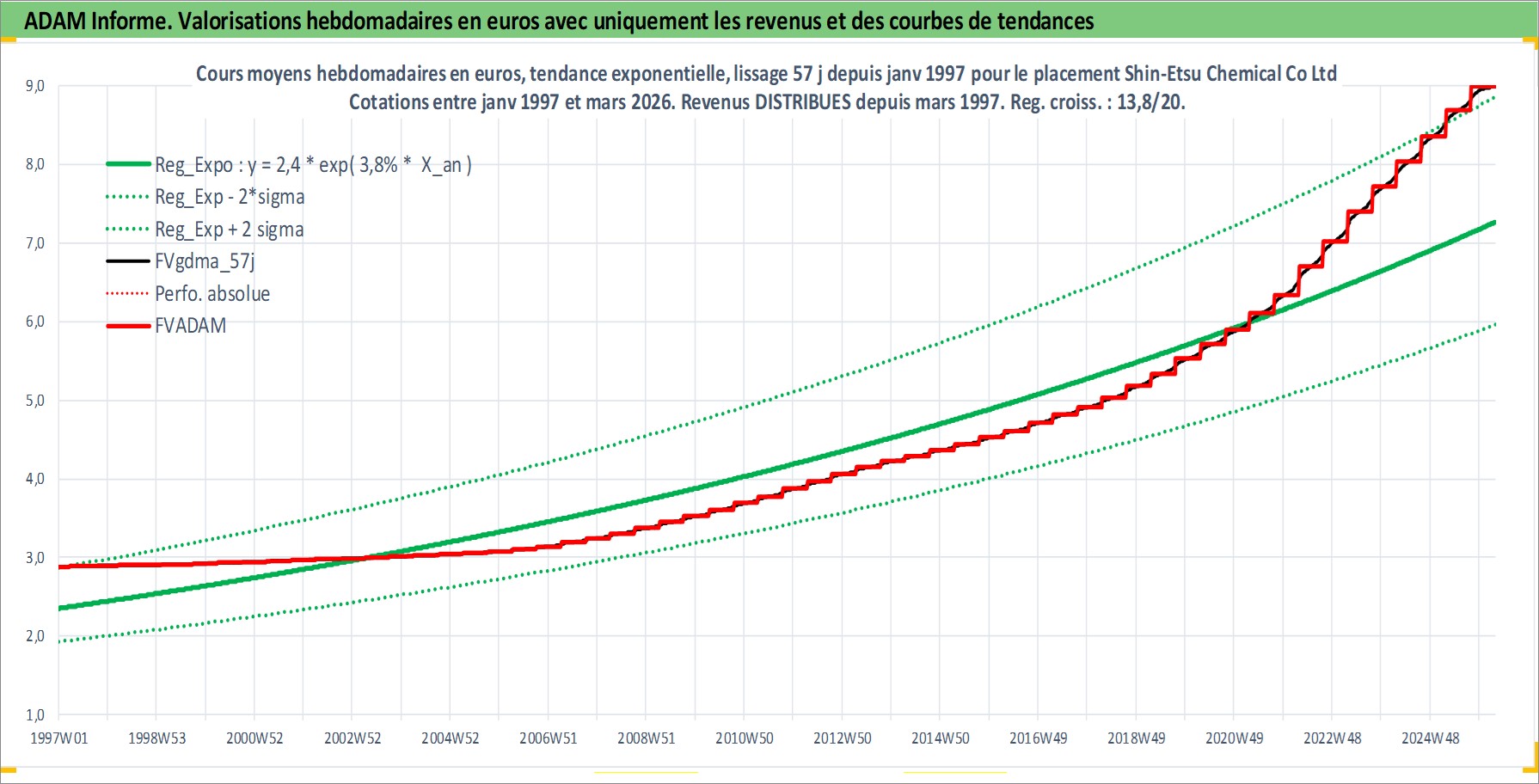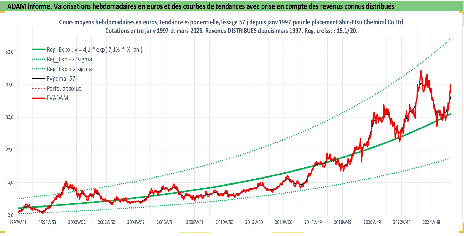 Site dédié aux investisseursPage dédiée sur site financeAnalyse des valorisations hebdomadaires de l'action Shin-Etsu Chemical Co Ltd. Cet actif est cote en JPY. Les valorisations sont en contrevaleur EURO et couvrent les semaines 1997W01 a 2026W13. Les revenus de cet actif financier sont pris en compte depuis la semaine 1997W13. La note globale ESG de cet actif est estimee a 5.0 (apres rebasage entre 0 et 20).