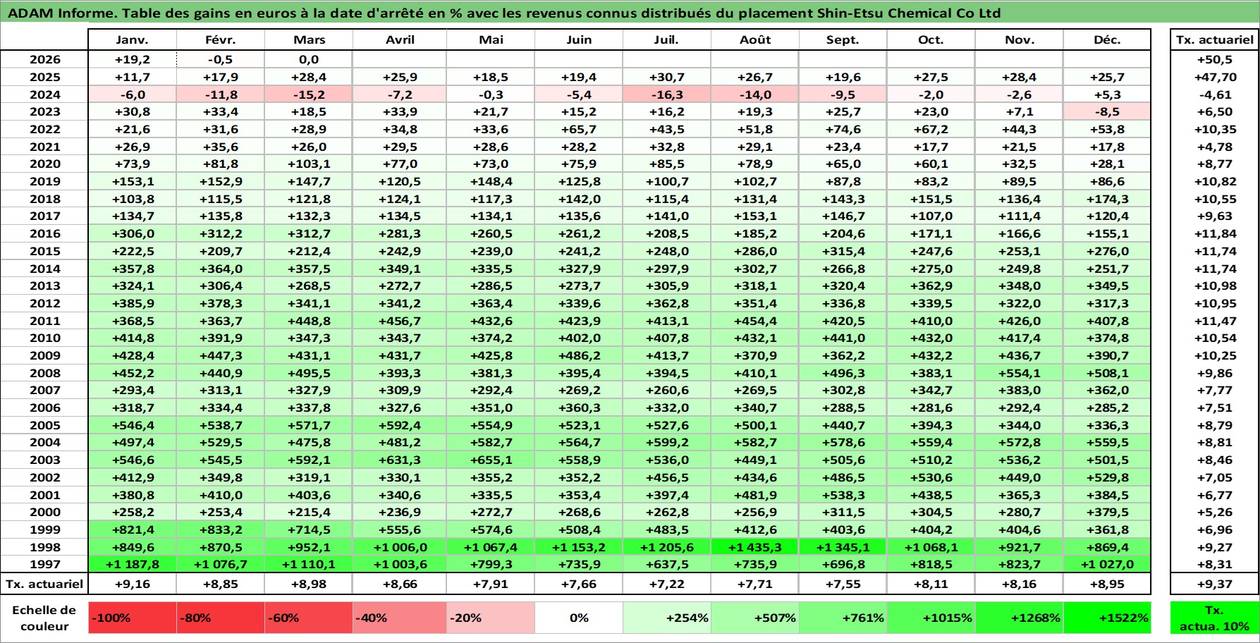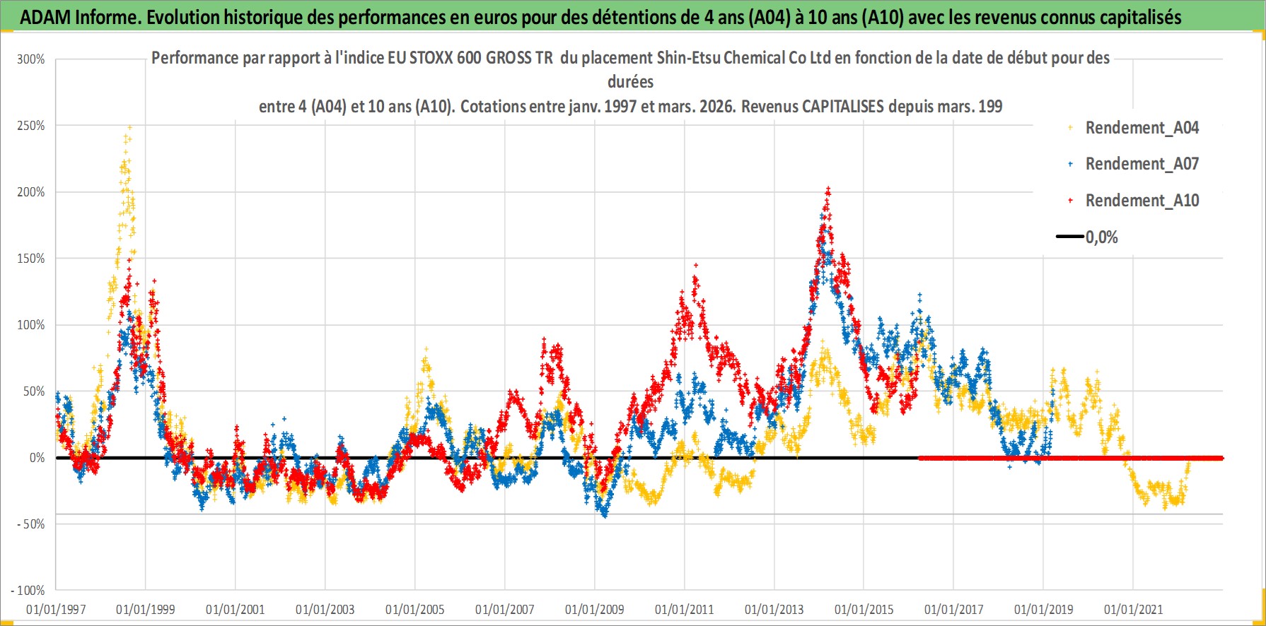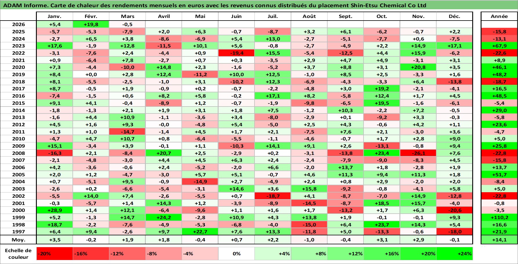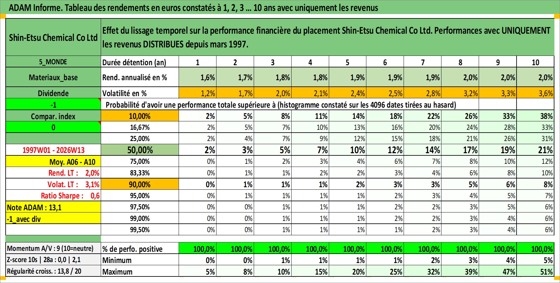 Site dédié aux investisseursPage dédiée sur site financeAnalyse des valorisations hebdomadaires de l'action Shin-Etsu Chemical Co Ltd. Cet actif est cote en JPY. Les valorisations sont en contrevaleur EURO et couvrent les semaines 1997W01 a 2026W13. Les revenus de cet actif financier sont pris en compte depuis la semaine 1997W13. La note globale ESG de cet actif est estimee a 5.0 (apres rebasage entre 0 et 20).