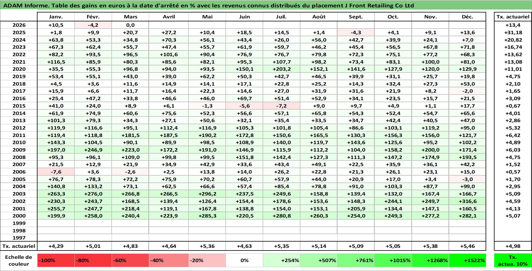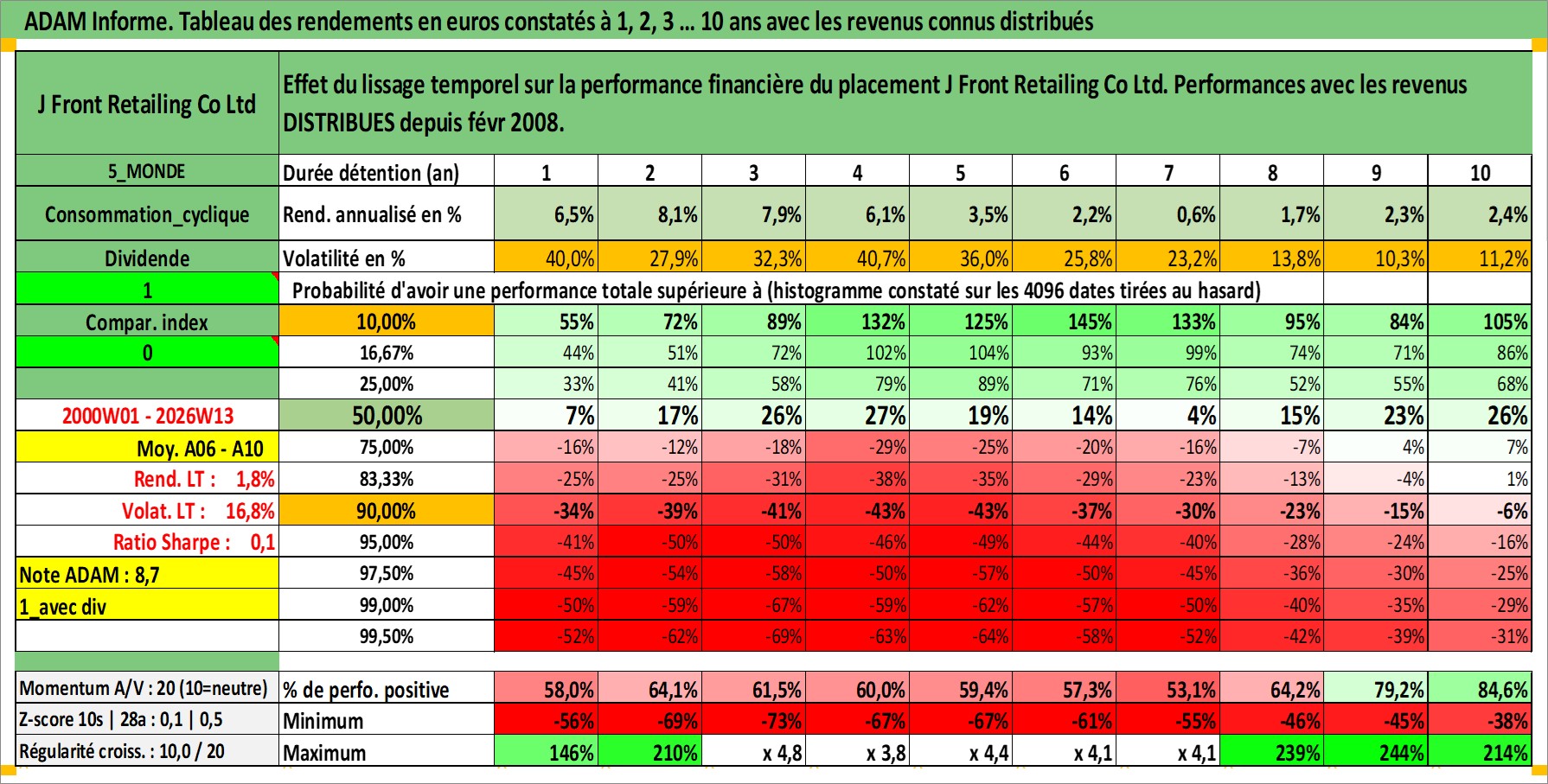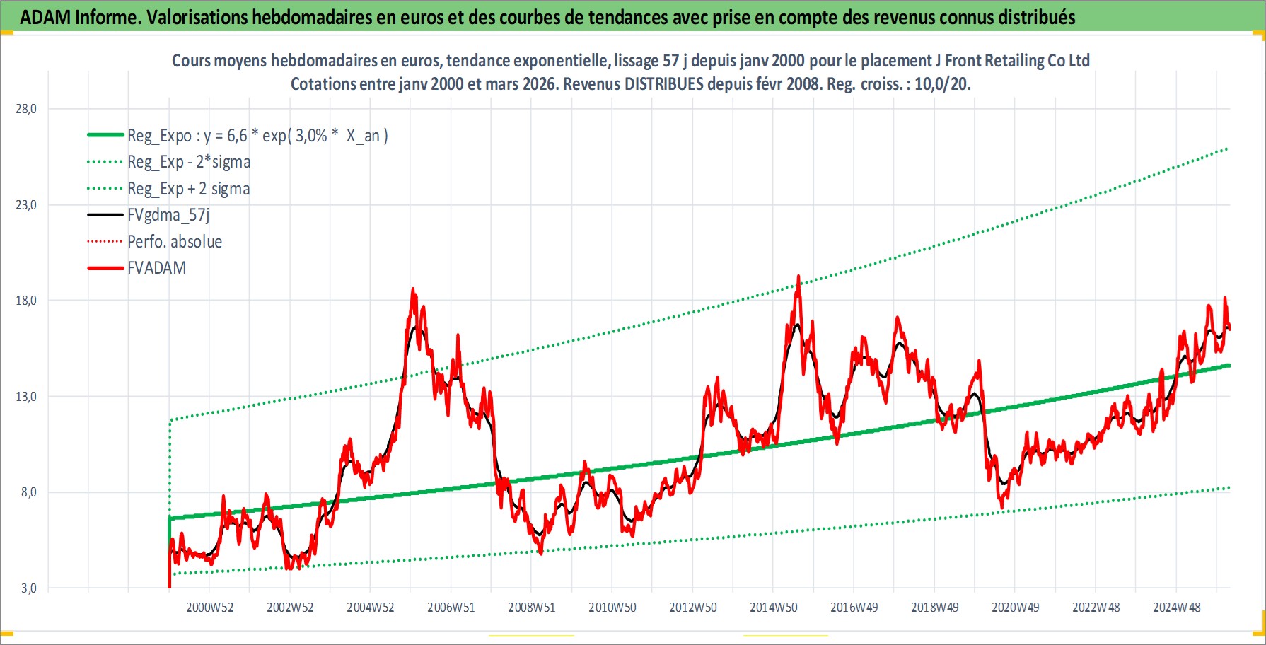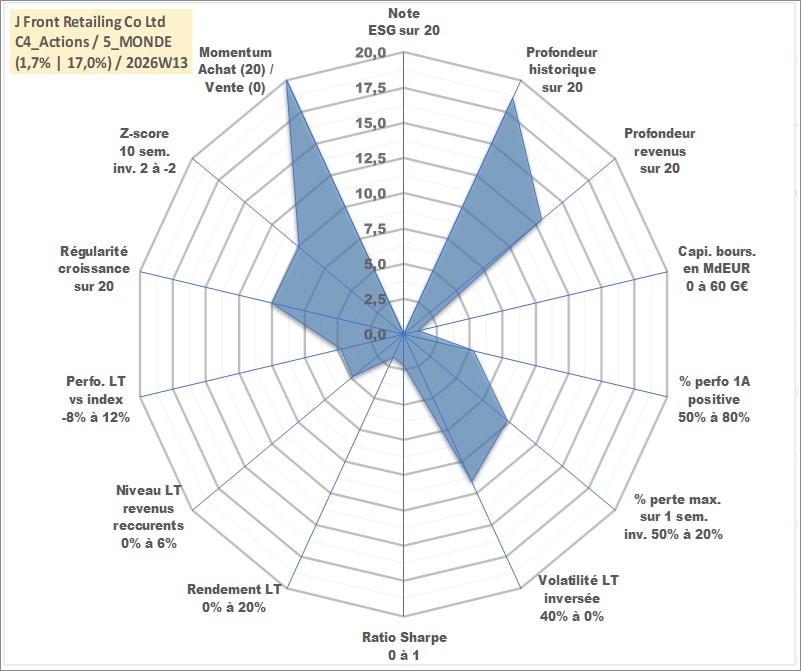 Site dédié aux investisseursPage dédiée sur site financeAnalyse des valorisations hebdomadaires de l'action J Front Retailing Co Ltd. Cet actif est cote en JPY. Les valorisations sont en contrevaleur EURO et couvrent les semaines 2000W01 a 2026W13. Les revenus de cet actif financier sont pris en compte depuis la semaine 2008W09. La note ESG de cet actif n'est pas connue.