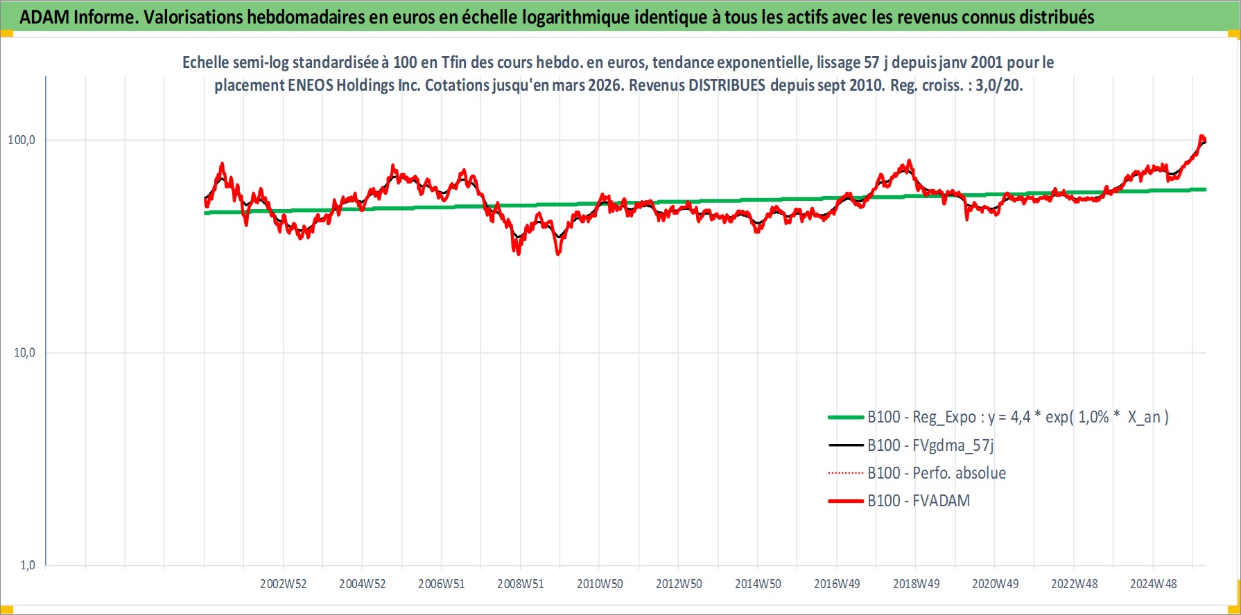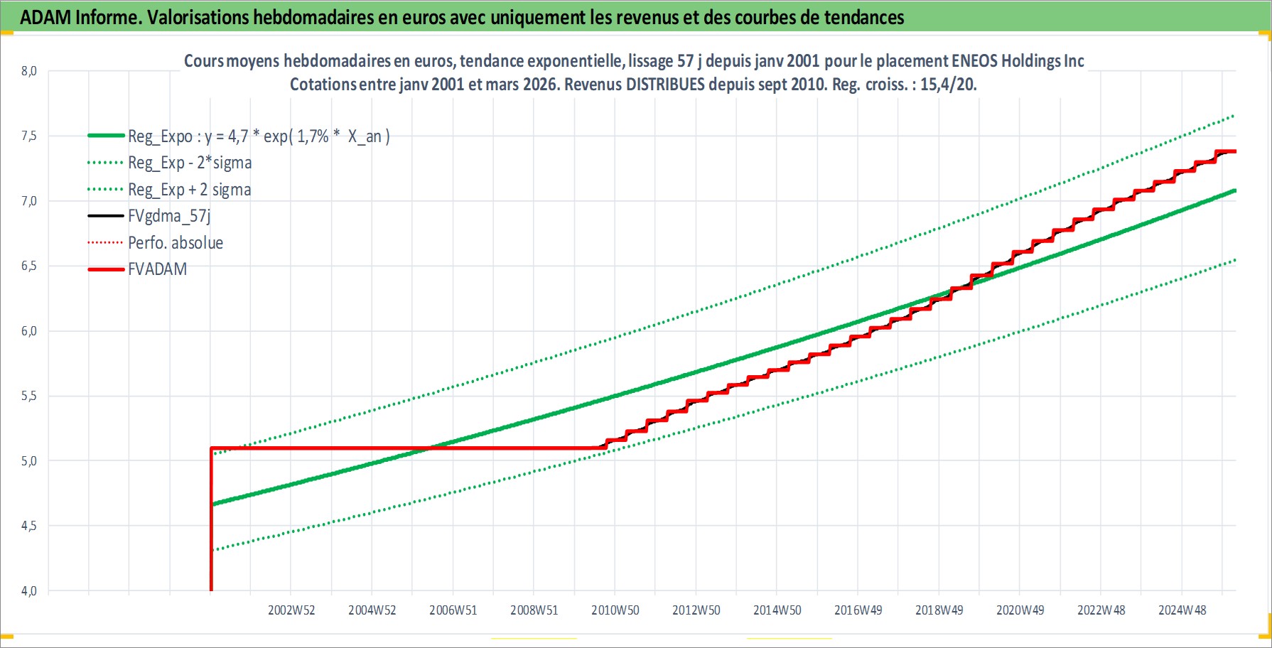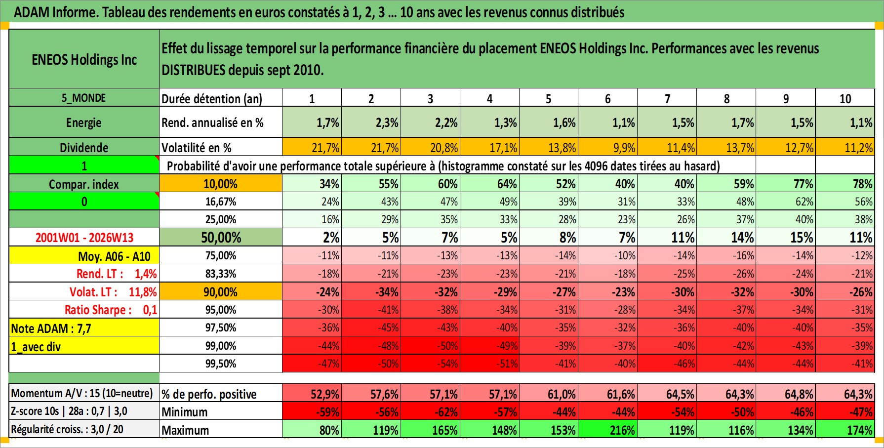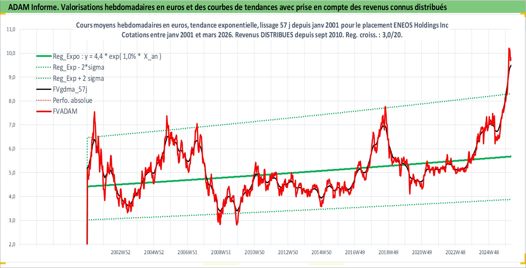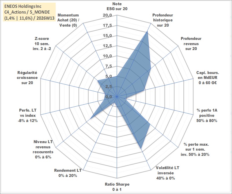 Site dédié aux investisseursPage dédiée sur site financeAnalyse des valorisations hebdomadaires de l'action ENEOS Holdings Inc. Cet actif est cote en JPY. Les valorisations sont en contrevaleur EURO et couvrent les semaines 2001W01 a 2026W13. Les revenus de cet actif financier sont pris en compte depuis la semaine 2010W39. La note globale ESG de cet actif est estimee a 5.0 (apres rebasage entre 0 et 20).
