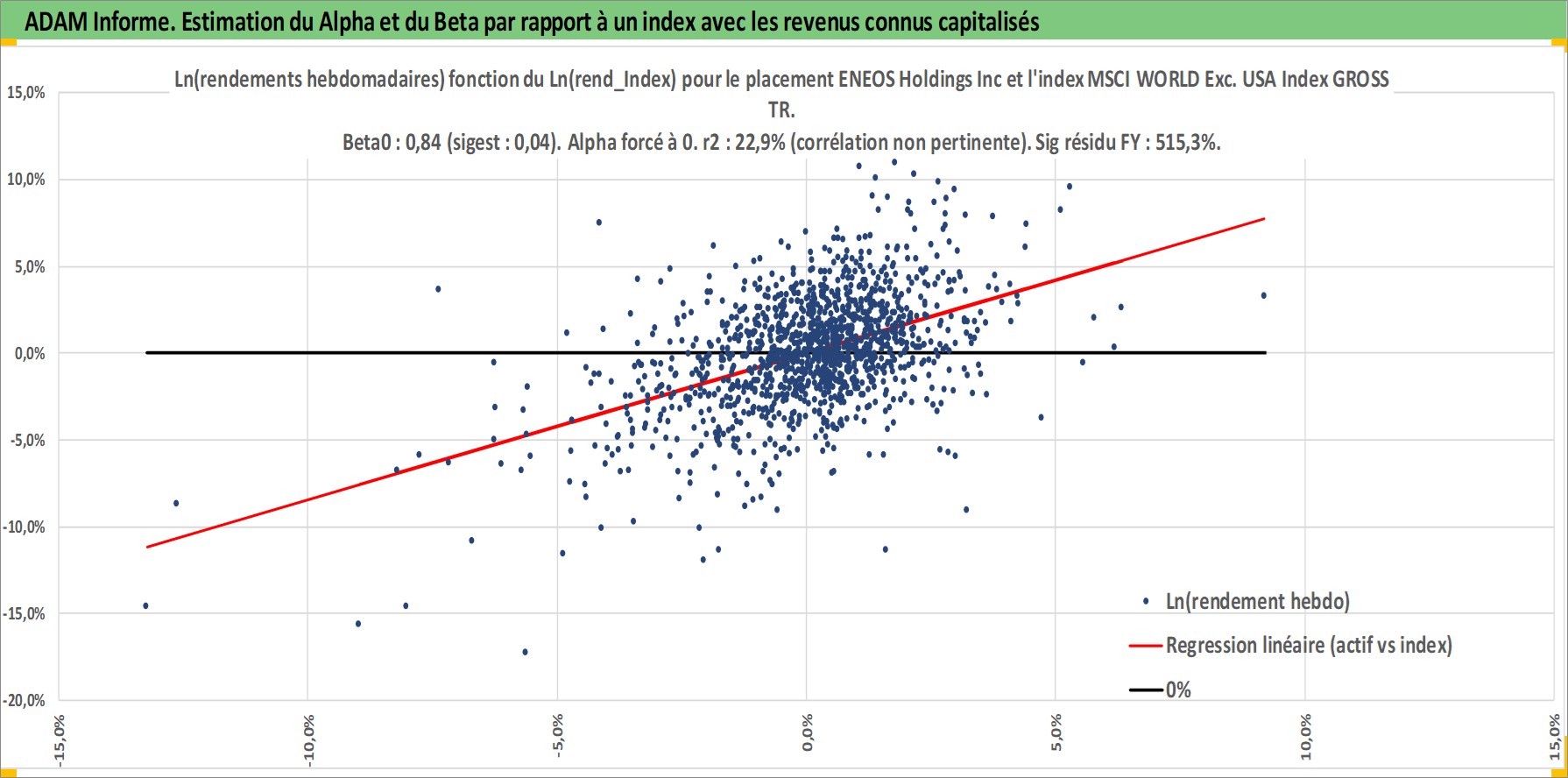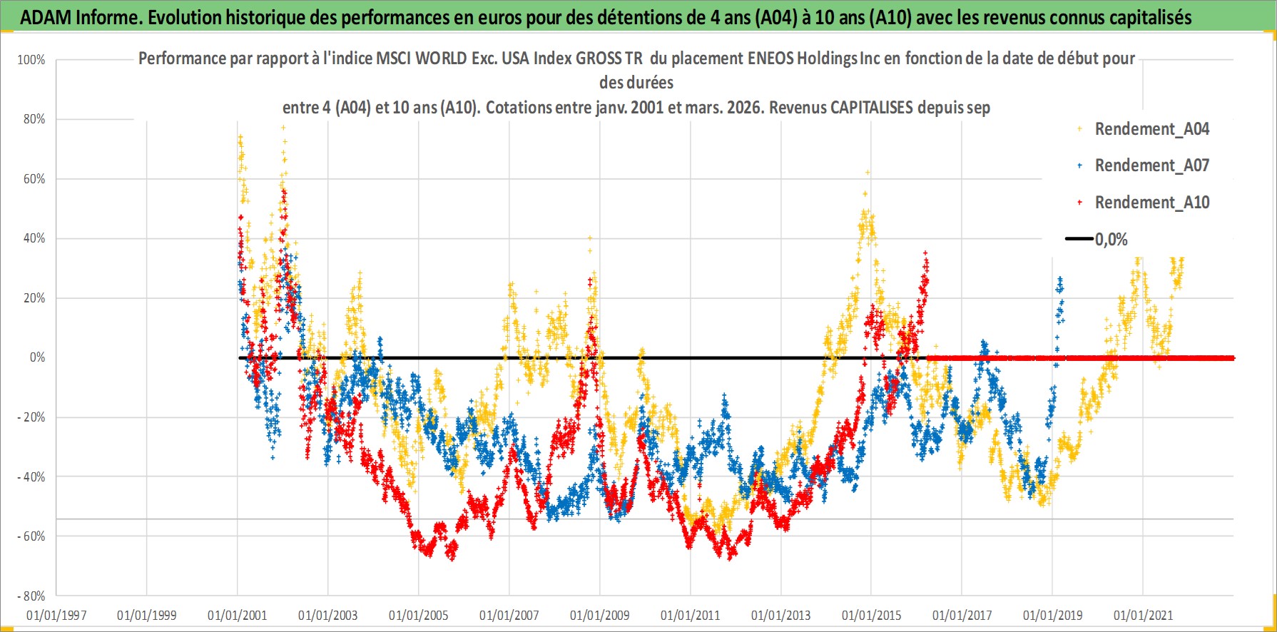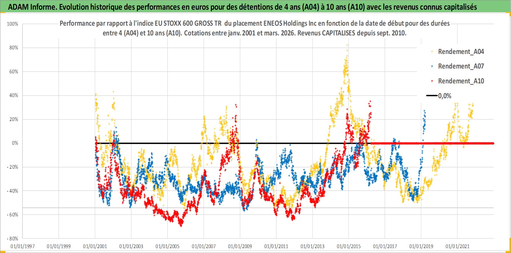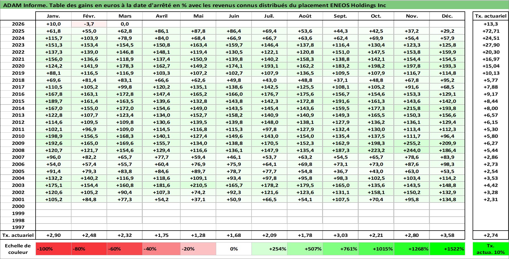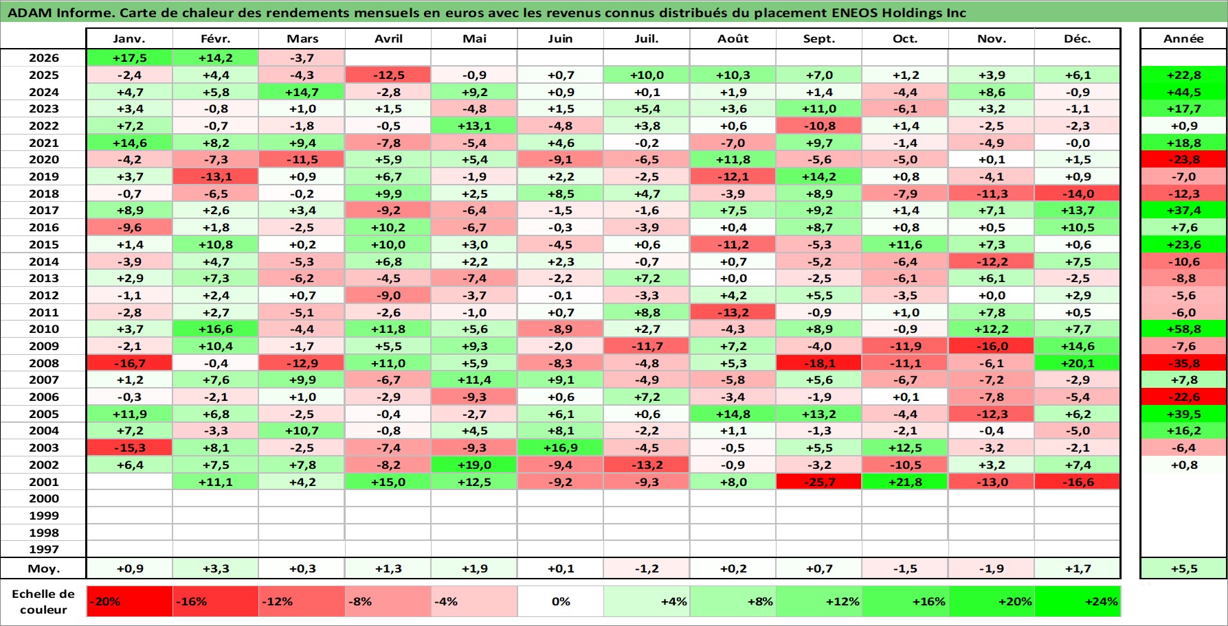 Site dédié aux investisseursPage dédiée sur site financeAnalyse des valorisations hebdomadaires de l'action ENEOS Holdings Inc. Cet actif est cote en JPY. Les valorisations sont en contrevaleur EURO et couvrent les semaines 2001W01 a 2026W13. Les revenus de cet actif financier sont pris en compte depuis la semaine 2010W39. La note globale ESG de cet actif est estimee a 5.0 (apres rebasage entre 0 et 20).