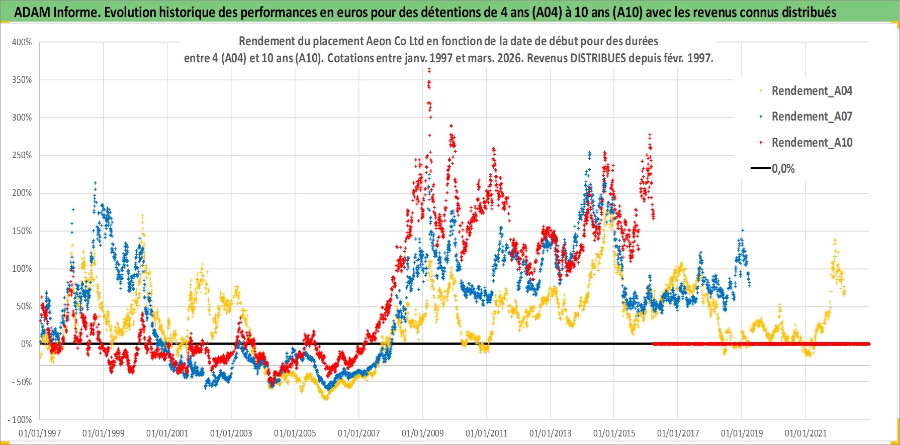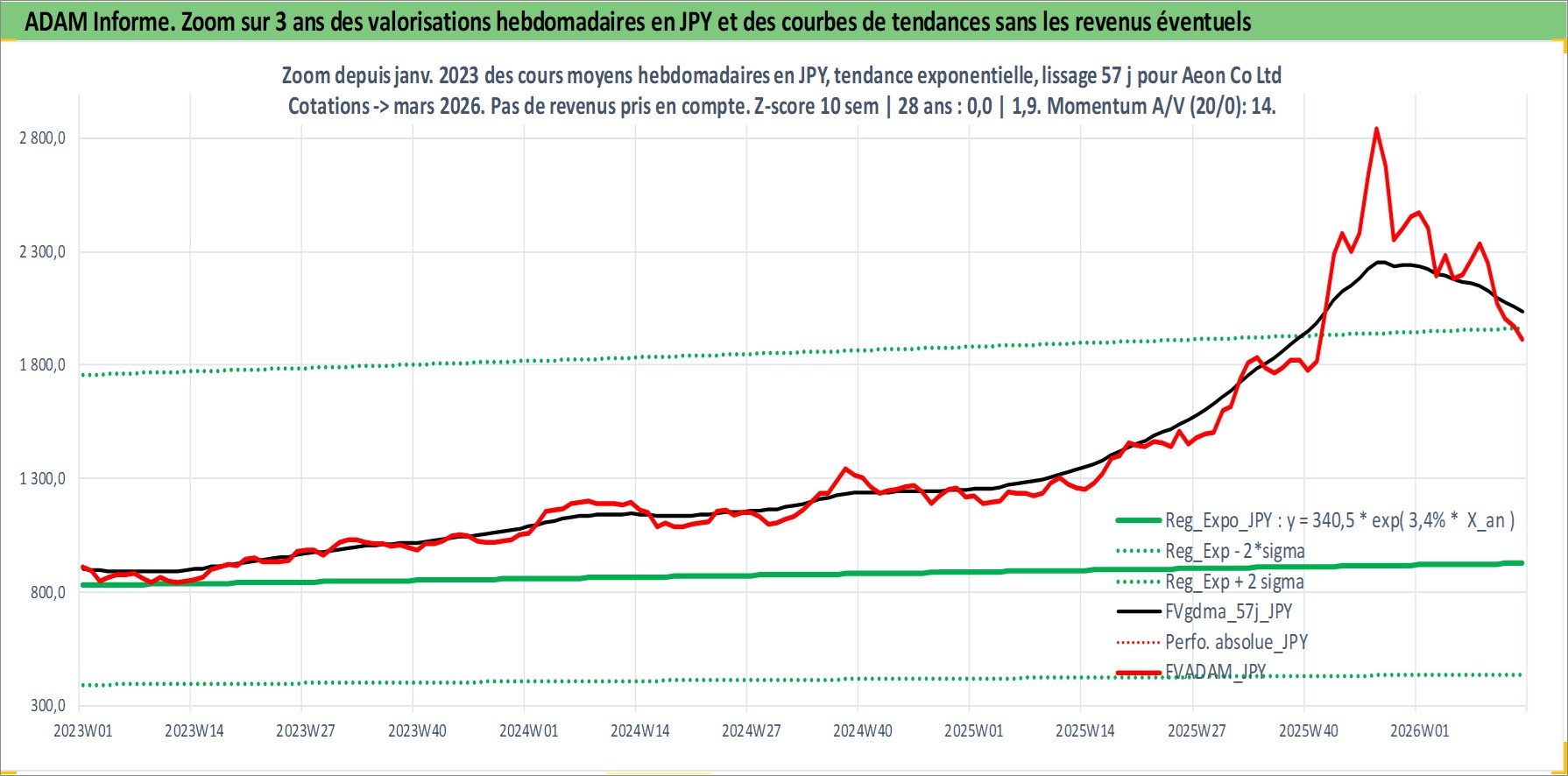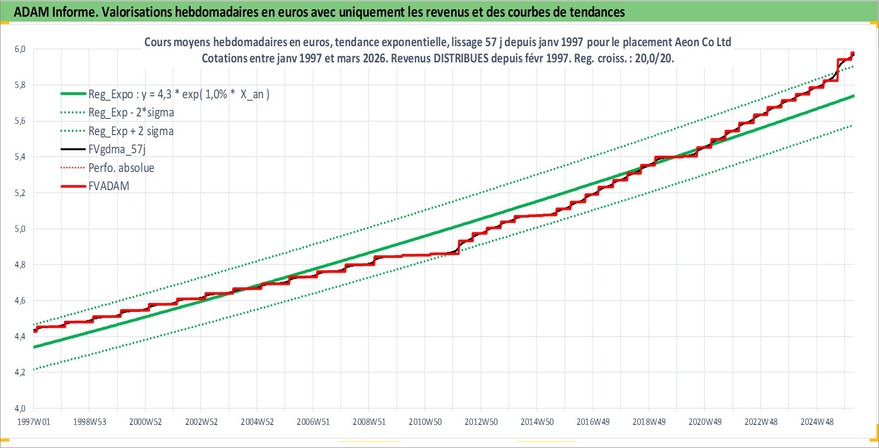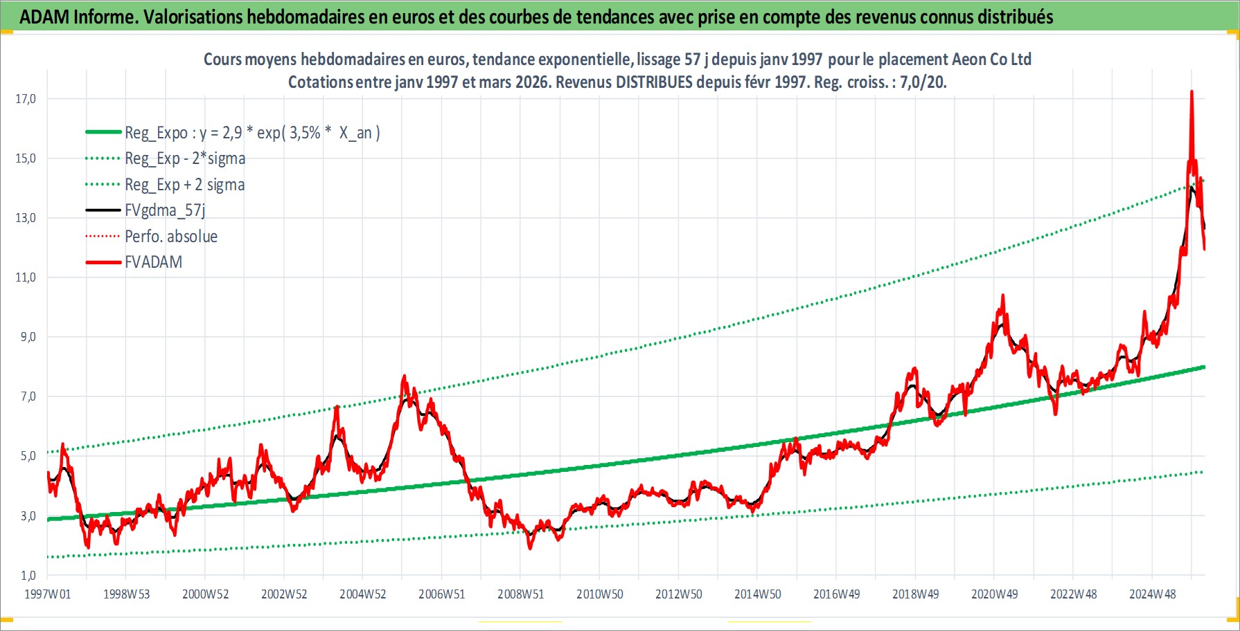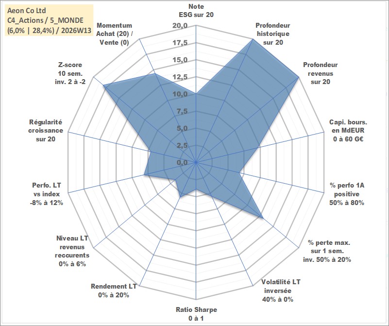 Site dédié aux investisseursPage dédiée sur site financeAnalyse des valorisations hebdomadaires de l'action Aeon Co Ltd. Cet actif est cote en JPY. Les valorisations sont en contrevaleur EURO et couvrent les semaines 1997W01 a 2026W13. Les revenus de cet actif financier sont pris en compte depuis la semaine 1997W08. La note globale ESG de cet actif est estimee a 10.0 (apres rebasage entre 0 et 20).