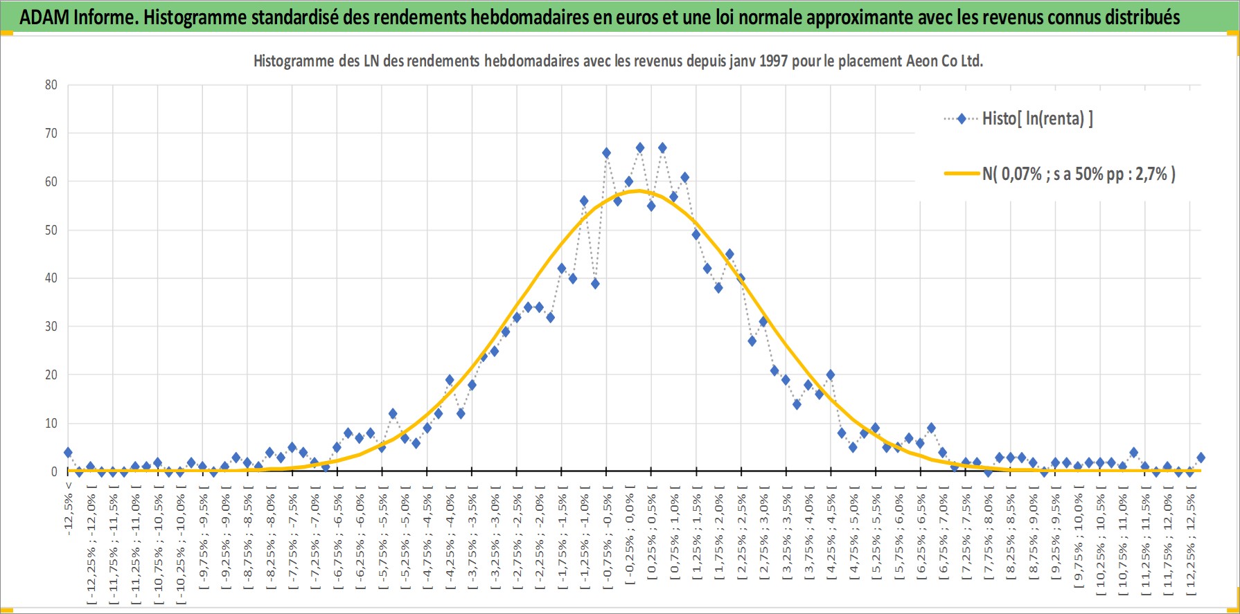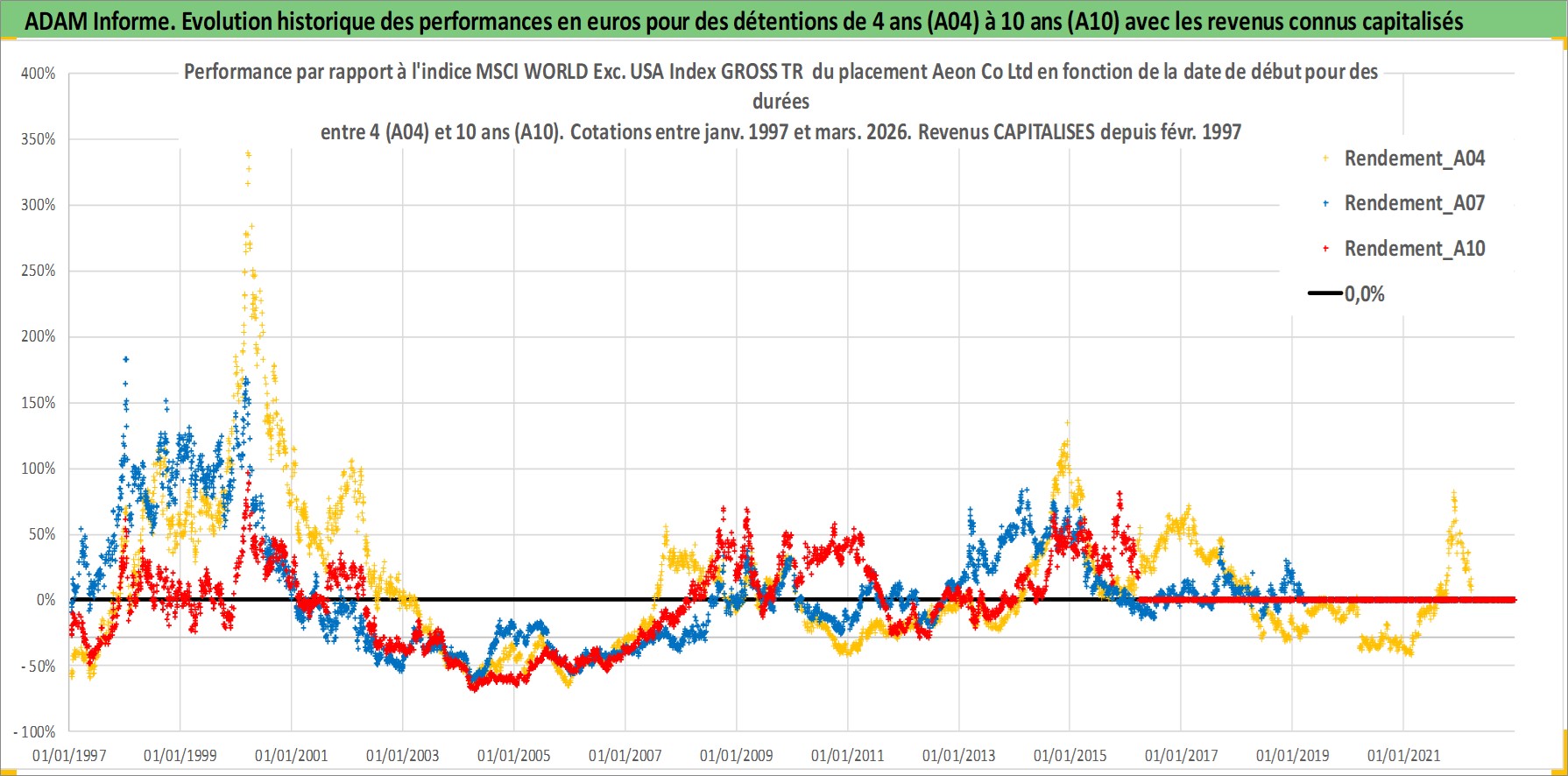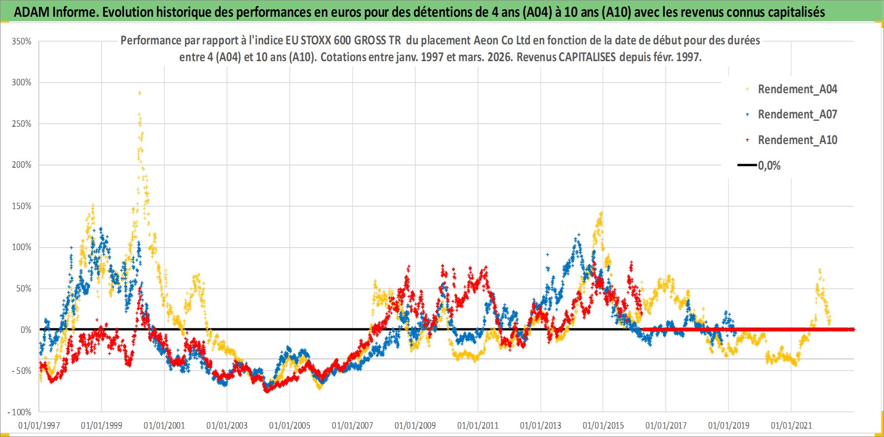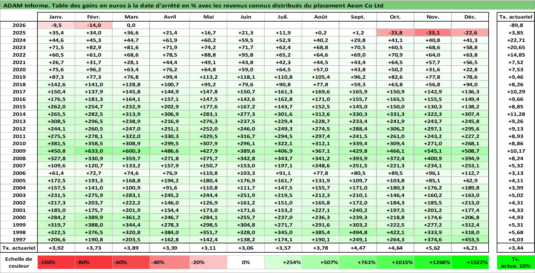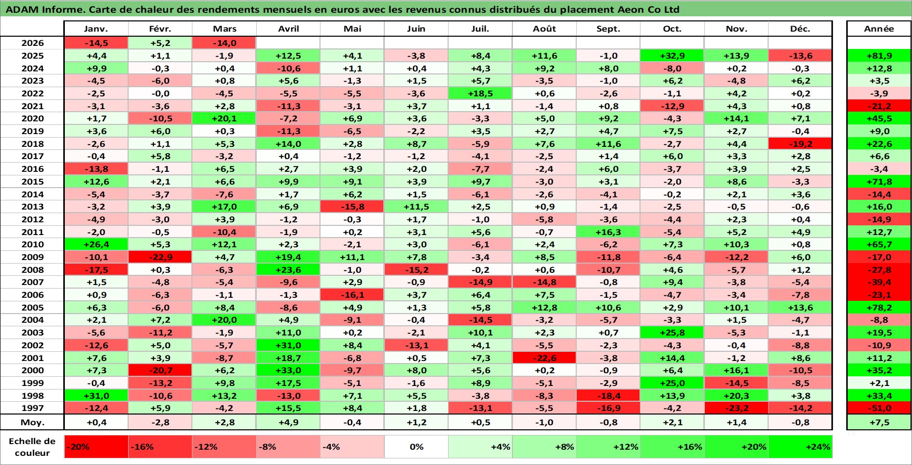 Site dédié aux investisseursPage dédiée sur site financeAnalyse des valorisations hebdomadaires de l'action Aeon Co Ltd. Cet actif est cote en JPY. Les valorisations sont en contrevaleur EURO et couvrent les semaines 1997W01 a 2026W13. Les revenus de cet actif financier sont pris en compte depuis la semaine 1997W08. La note globale ESG de cet actif est estimee a 10.0 (apres rebasage entre 0 et 20).