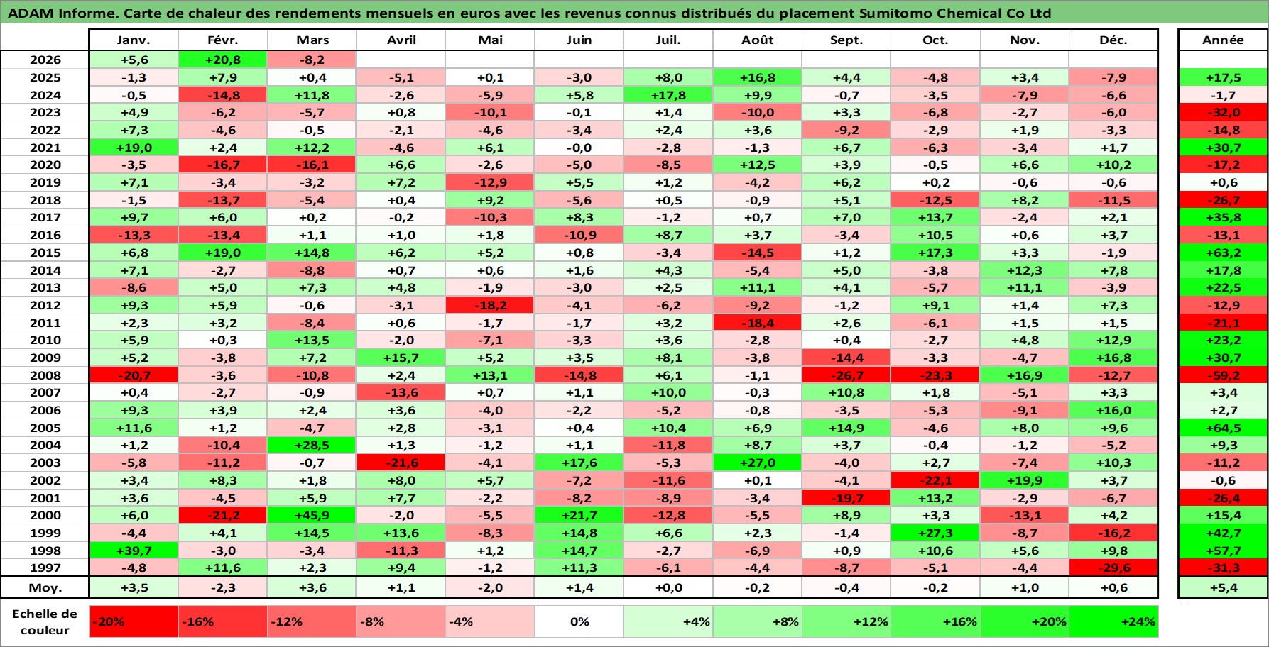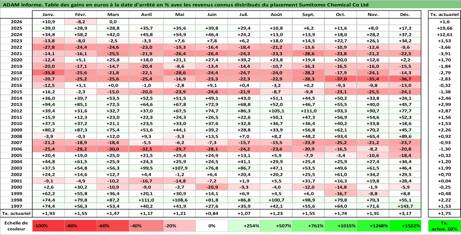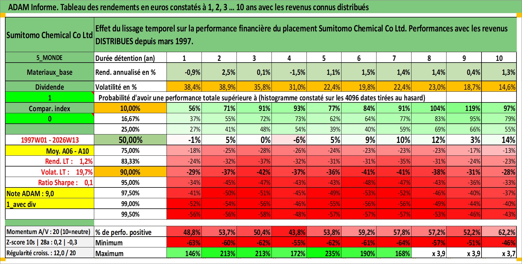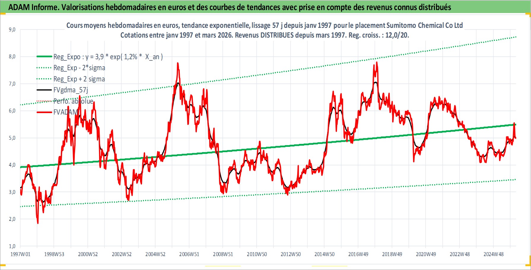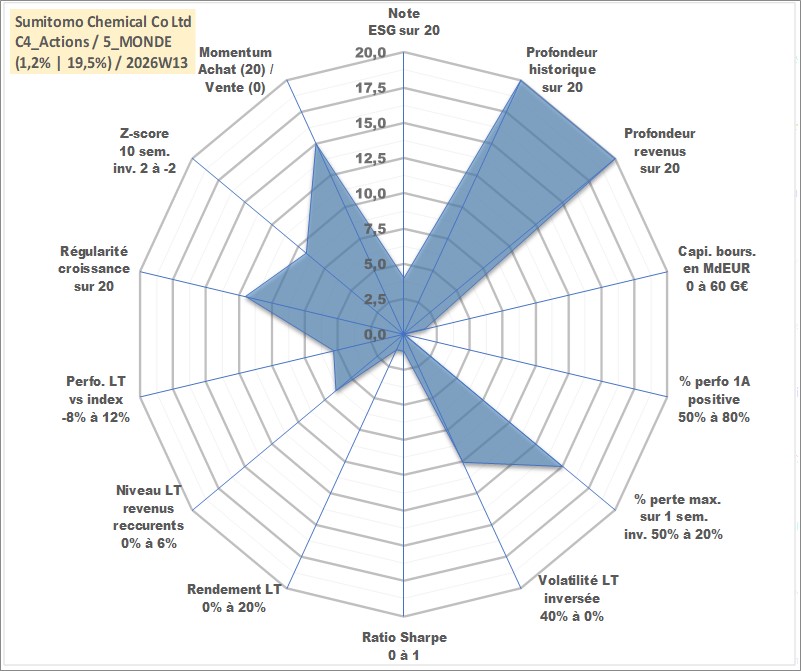 Site dédié aux investisseursPage dédiée sur site financeAnalyse des valorisations hebdomadaires de l'action Sumitomo Chemical Co Ltd. Cet actif est cote en JPY. Les valorisations sont en contrevaleur EURO et couvrent les semaines 1997W01 a 2026W13. Les revenus de cet actif financier sont pris en compte depuis la semaine 1997W13. La note globale ESG de cet actif est estimee a 4.0 (apres rebasage entre 0 et 20).