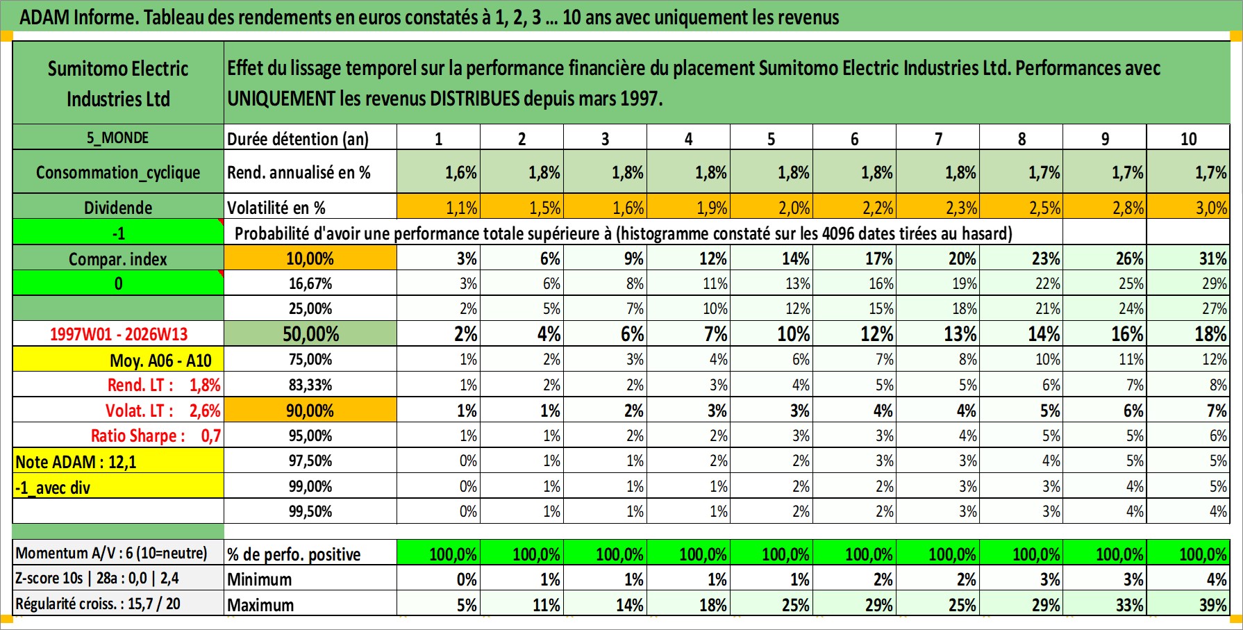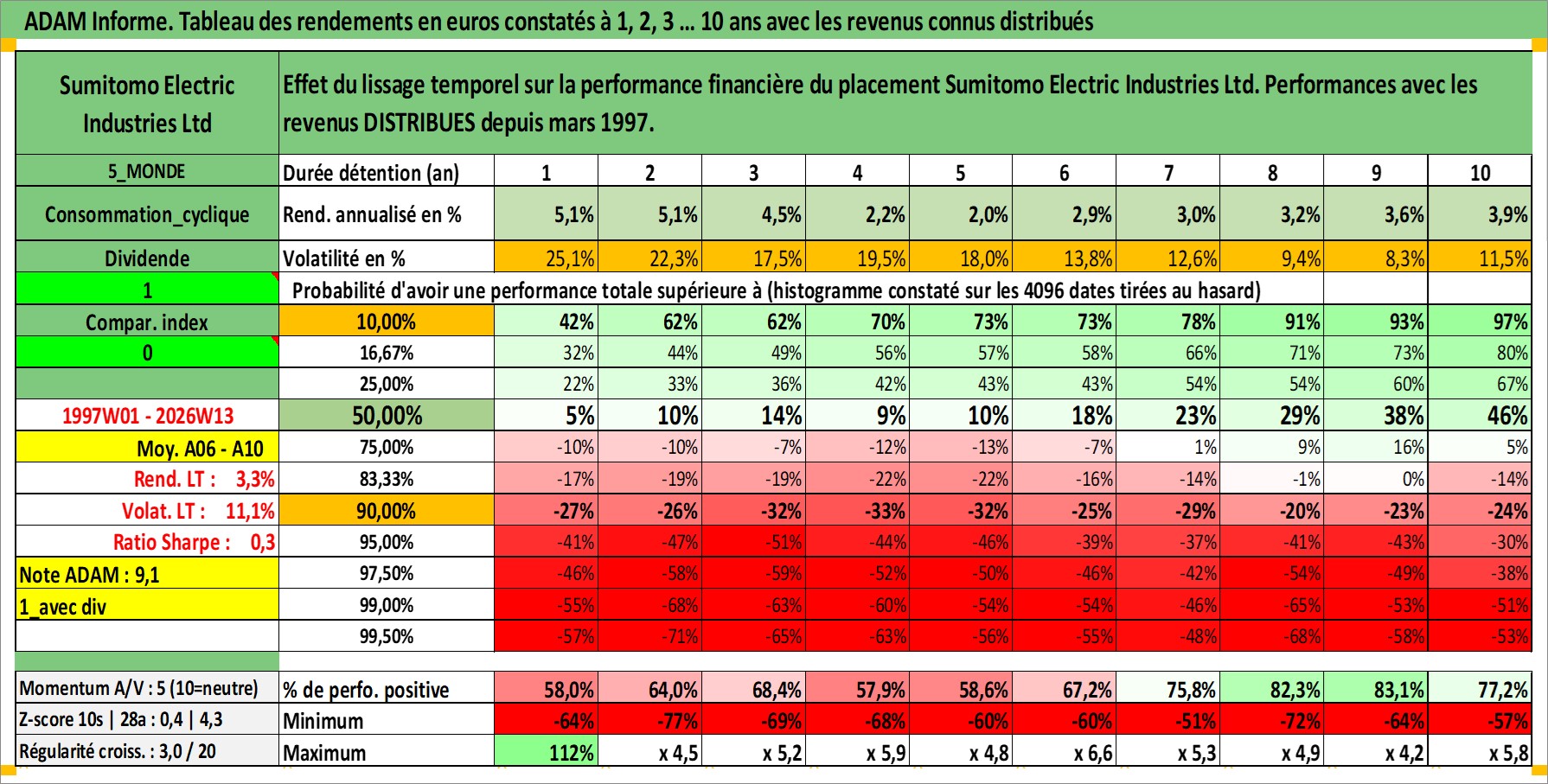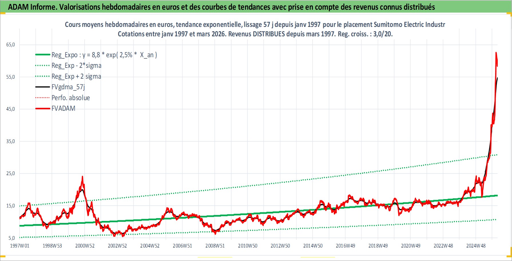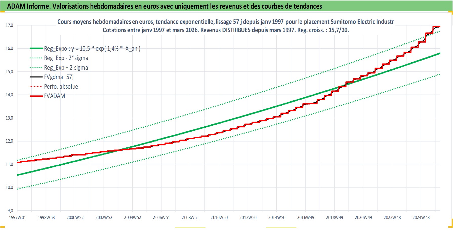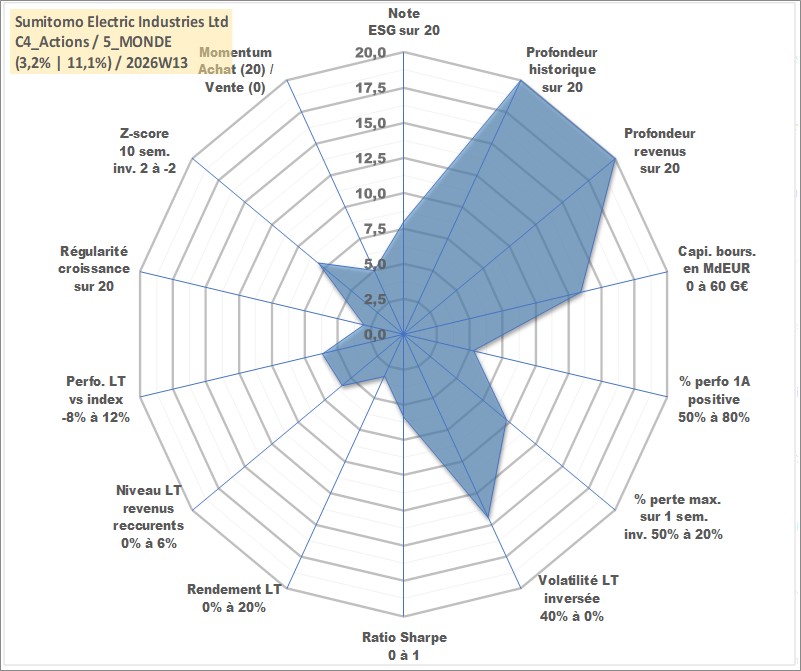 Site dédié aux investisseursPage dédiée sur site financeAnalyse des valorisations hebdomadaires de l'action Sumitomo Electric Industries Ltd. Cet actif est cote en JPY. Les valorisations sont en contrevaleur EURO et couvrent les semaines 1997W01 a 2026W13. Les revenus de cet actif financier sont pris en compte depuis la semaine 1997W13. La note globale ESG de cet actif est estimee a 8.0 (apres rebasage entre 0 et 20).