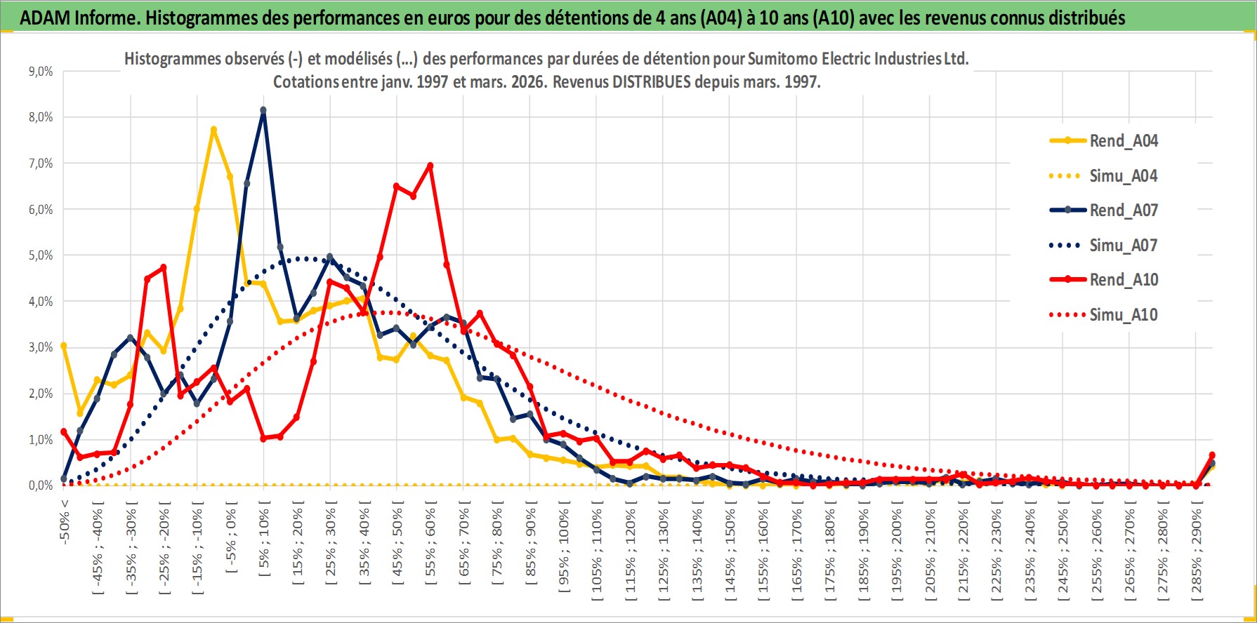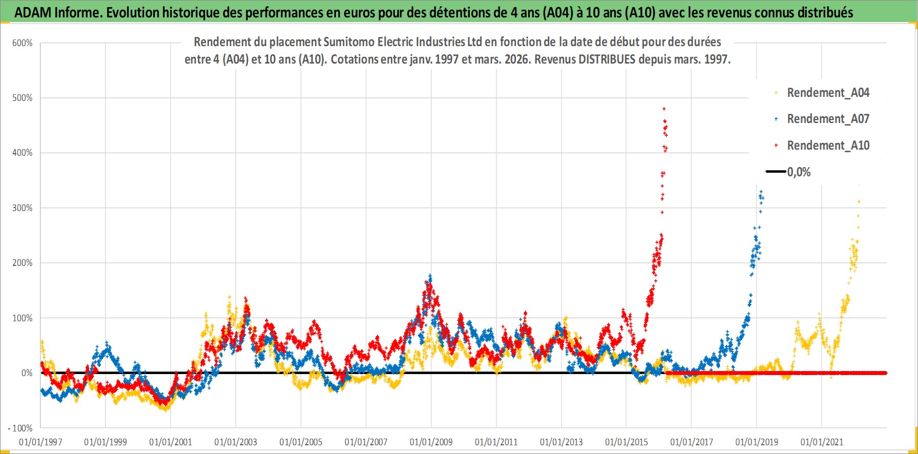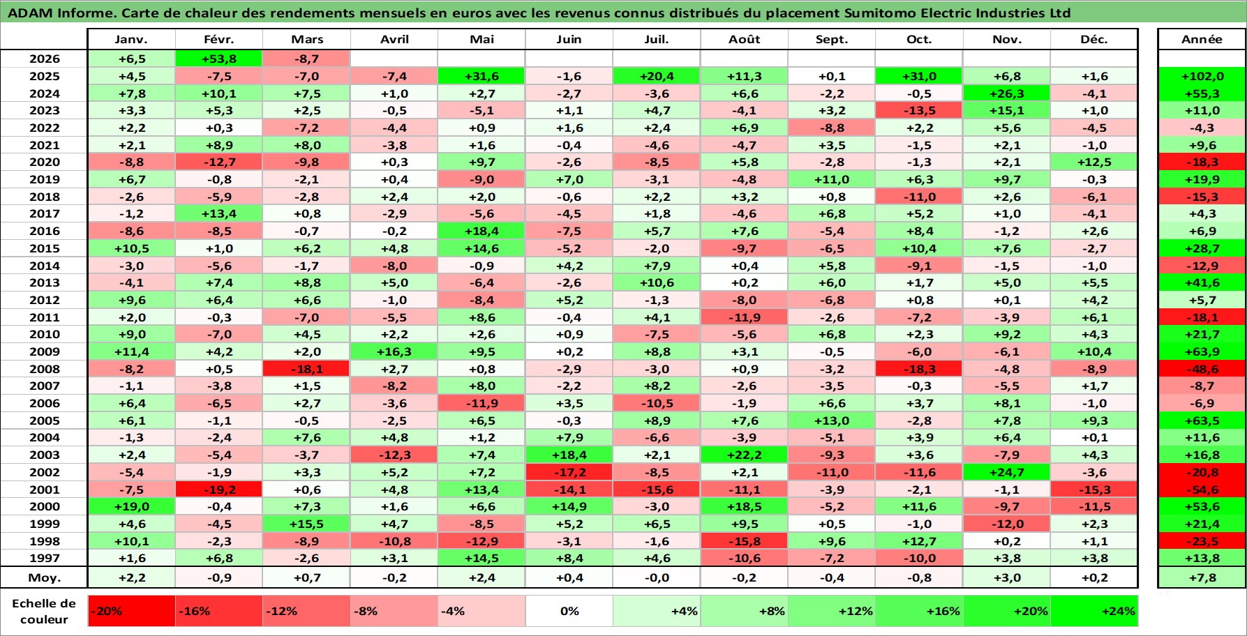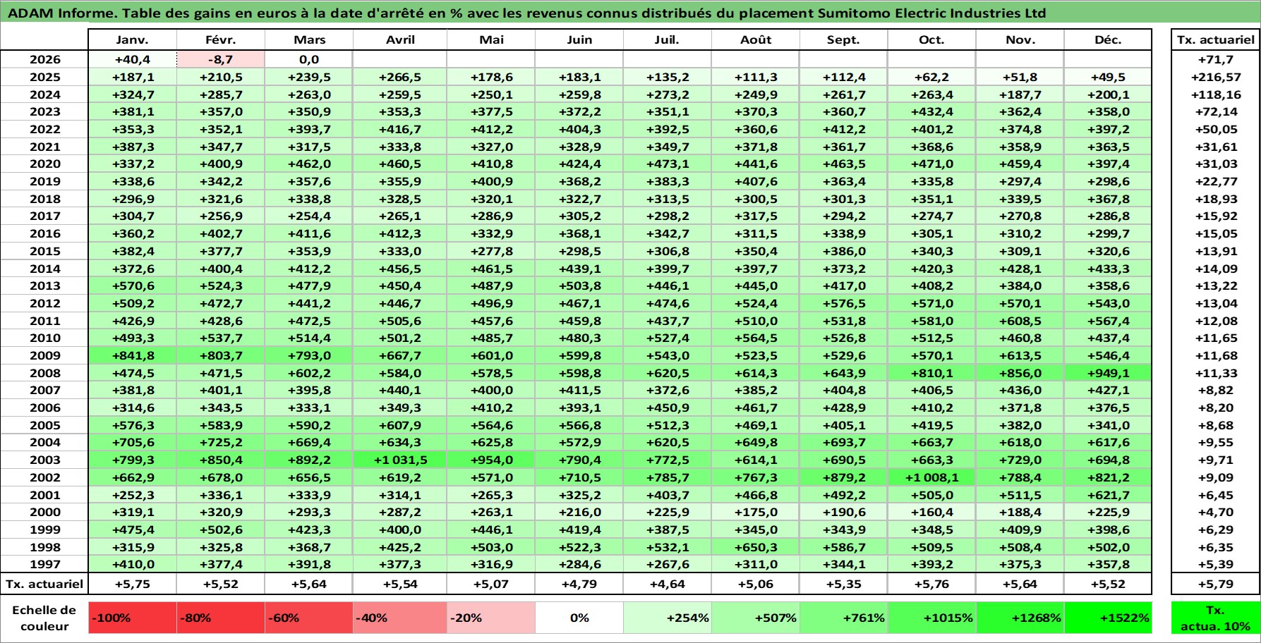 Site dédié aux investisseursPage dédiée sur site financeAnalyse des valorisations hebdomadaires de l'action Sumitomo Electric Industries Ltd. Cet actif est cote en JPY. Les valorisations sont en contrevaleur EURO et couvrent les semaines 1997W01 a 2026W13. Les revenus de cet actif financier sont pris en compte depuis la semaine 1997W13. La note globale ESG de cet actif est estimee a 8.0 (apres rebasage entre 0 et 20).