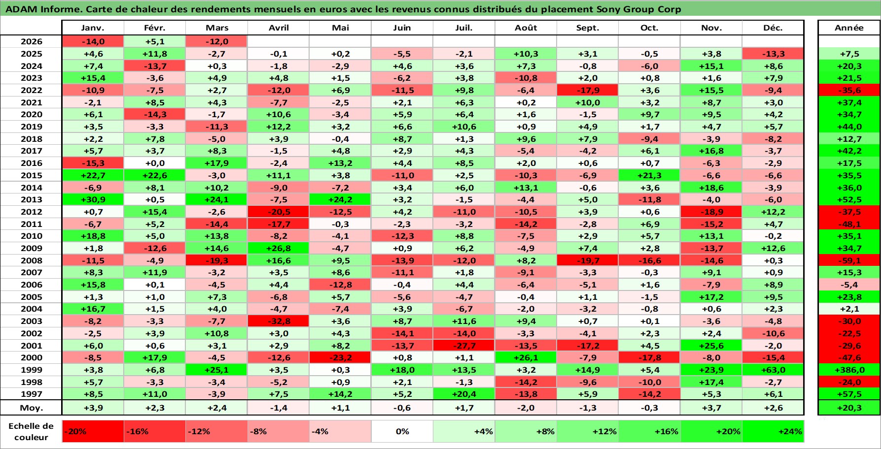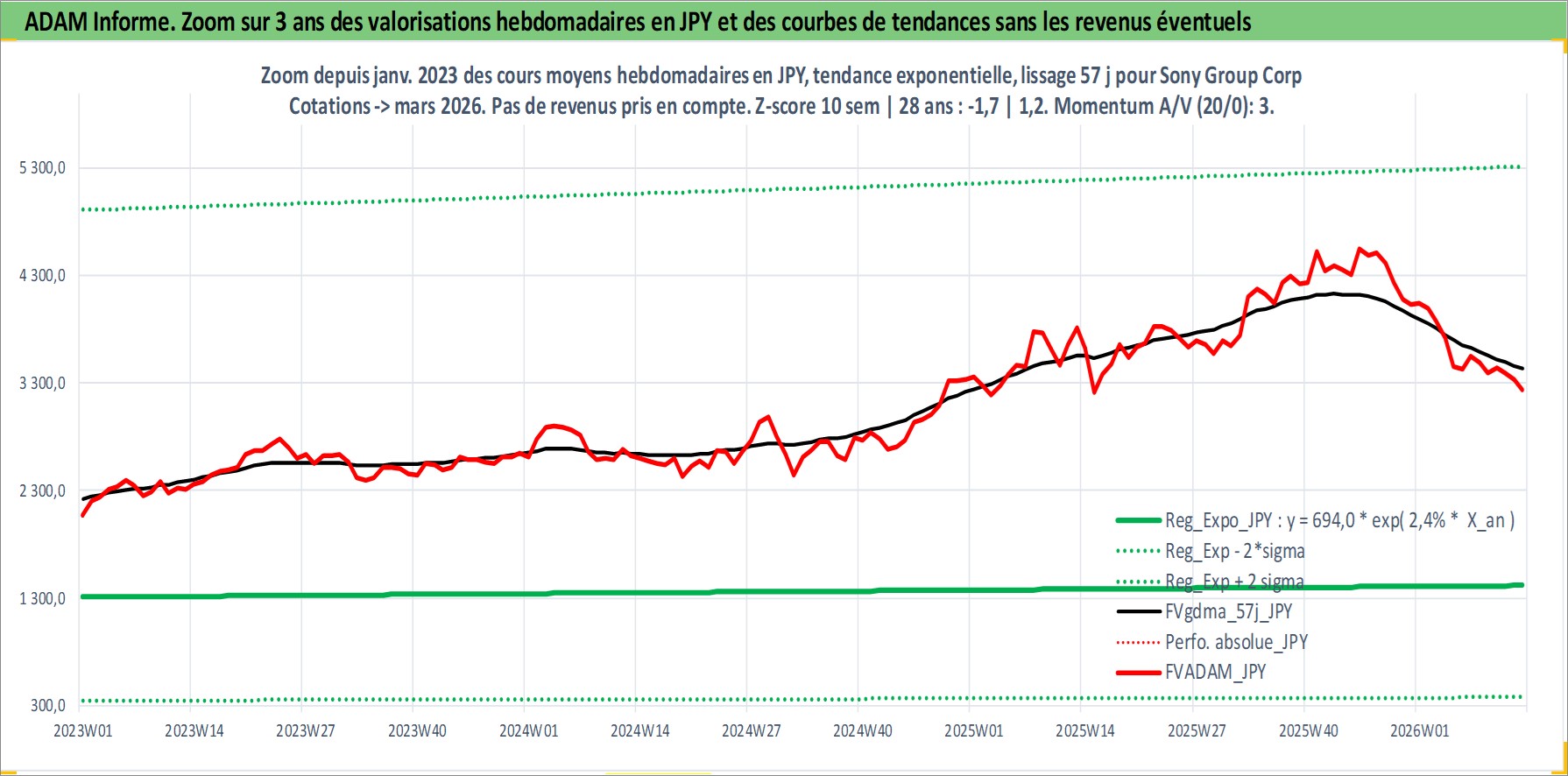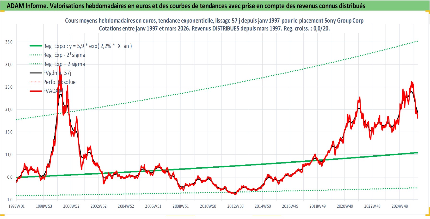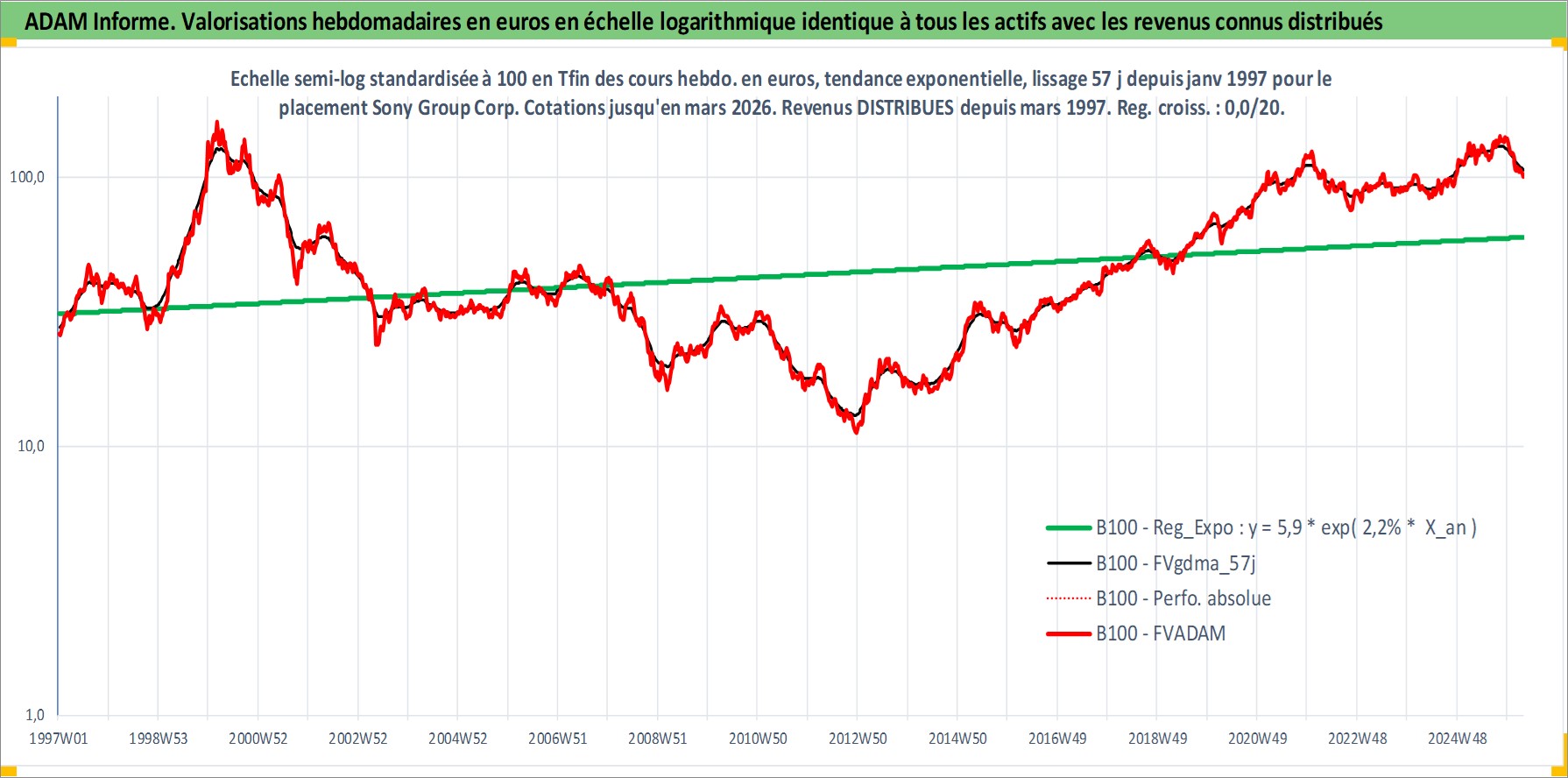 Site dédié aux investisseursPage dédiée sur site financeAnalyse des valorisations hebdomadaires de l'action Sony Group Corp. Cet actif est cote en JPY. Les valorisations sont en contrevaleur EURO et couvrent les semaines 1997W01 a 2026W13. Les revenus de cet actif financier sont pris en compte depuis la semaine 1997W13. La note globale ESG de cet actif est estimee a 14.0 (apres rebasage entre 0 et 20).
