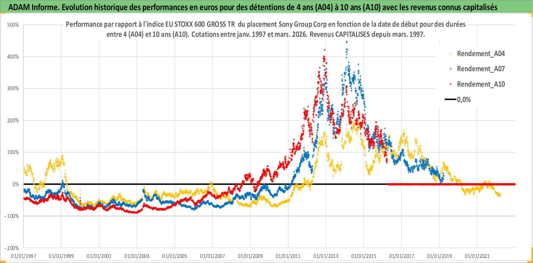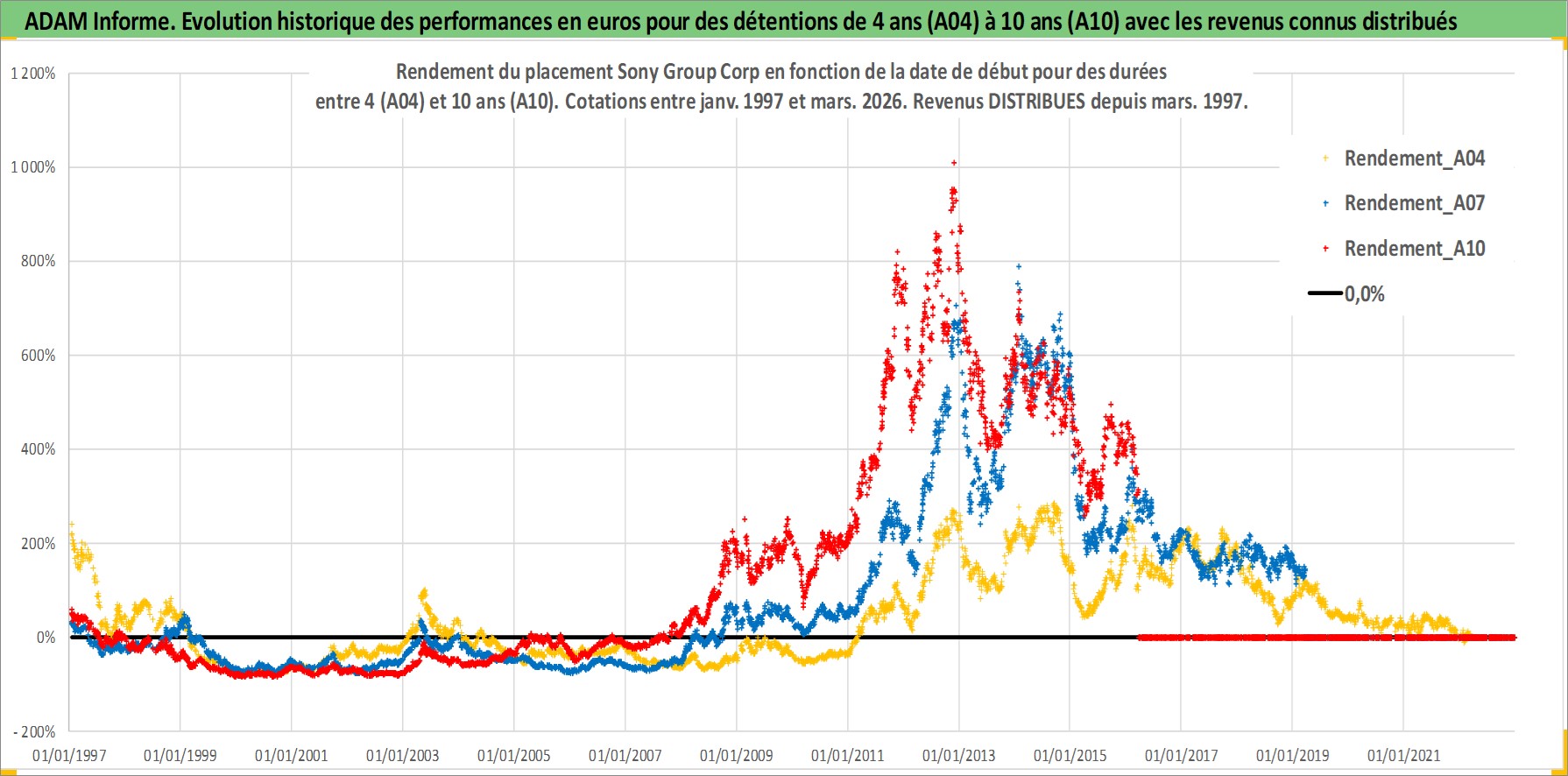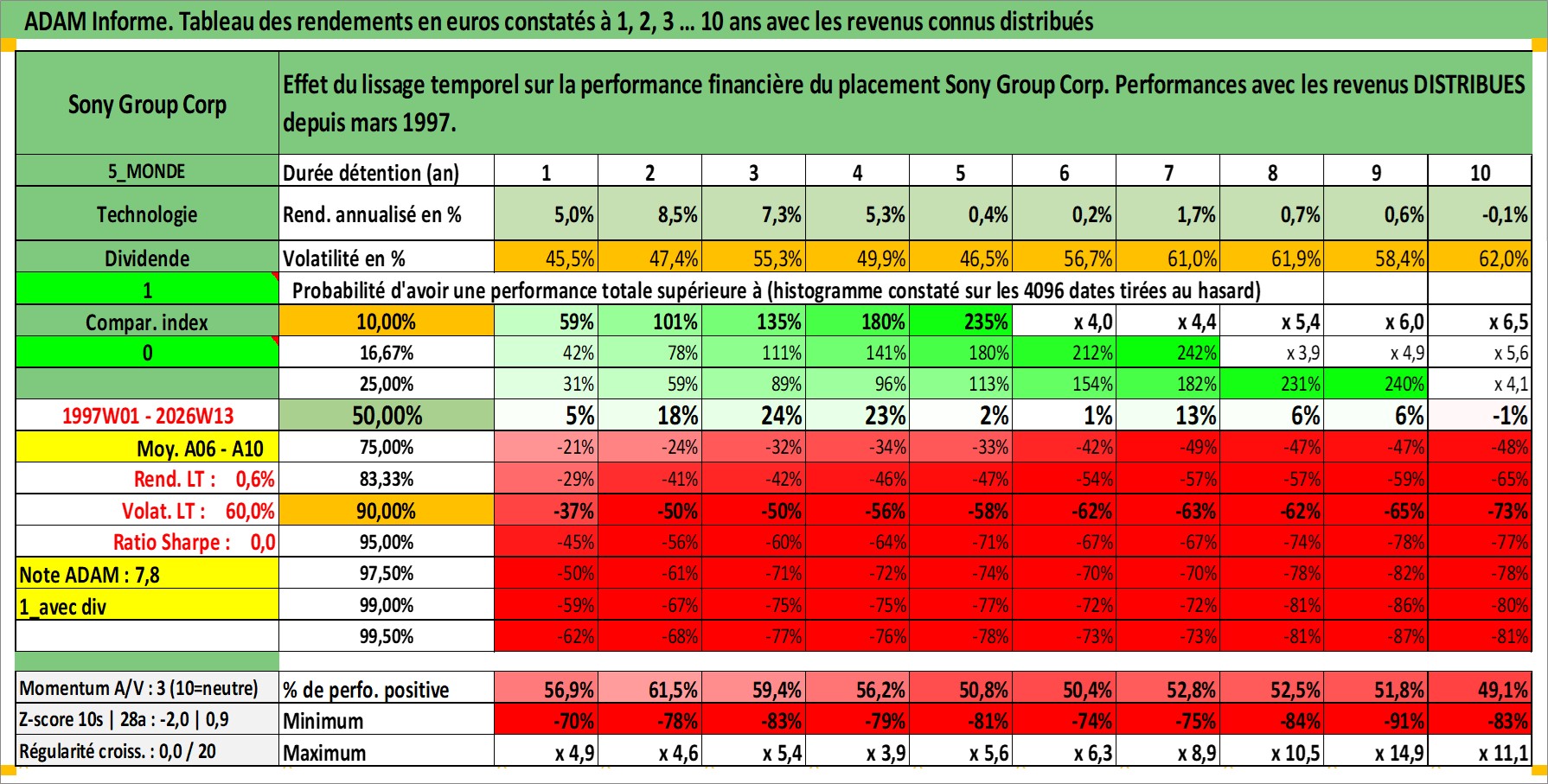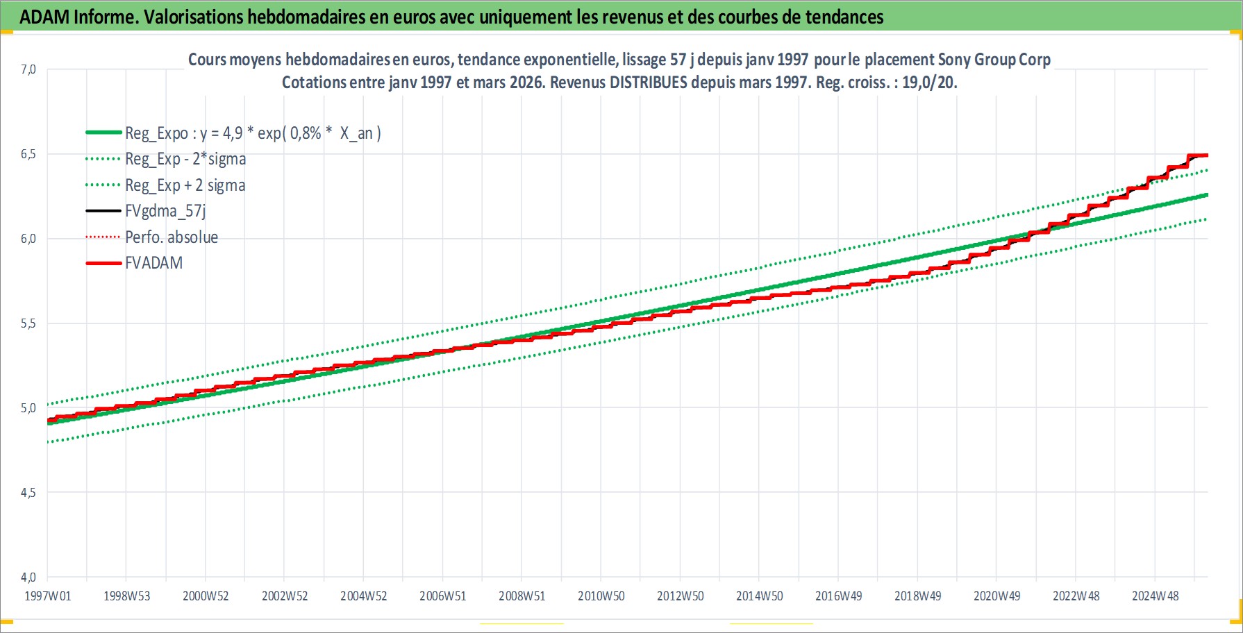 Site dédié aux investisseursPage dédiée sur site financeAnalyse des valorisations hebdomadaires de l'action Sony Group Corp. Cet actif est cote en JPY. Les valorisations sont en contrevaleur EURO et couvrent les semaines 1997W01 a 2026W13. Les revenus de cet actif financier sont pris en compte depuis la semaine 1997W13. La note globale ESG de cet actif est estimee a 14.0 (apres rebasage entre 0 et 20).