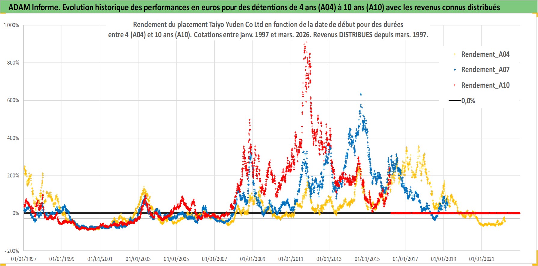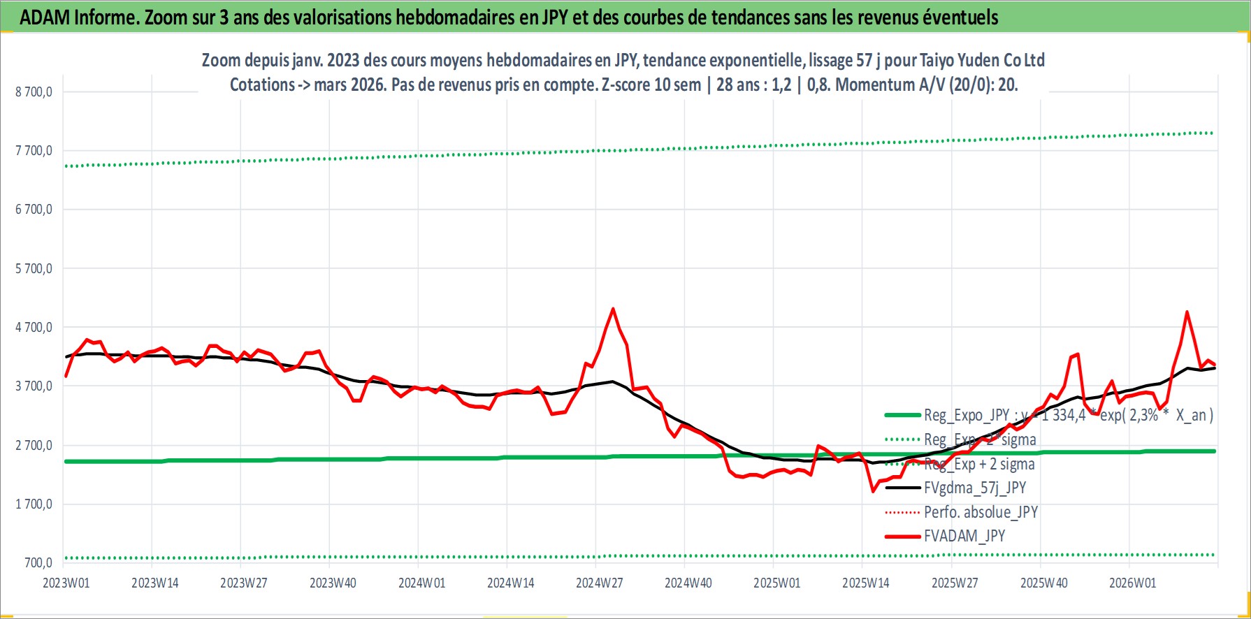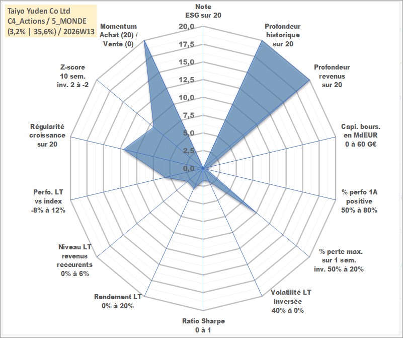 Site dédié aux investisseursPage dédiée sur site financeAnalyse des valorisations hebdomadaires de l'action Taiyo Yuden Co Ltd. Cet actif est cote en JPY. Les valorisations sont en contrevaleur EURO et couvrent les semaines 1997W01 a 2026W13. Les revenus de cet actif financier sont pris en compte depuis la semaine 1997W13. La note ESG de cet actif n'est pas connue.
