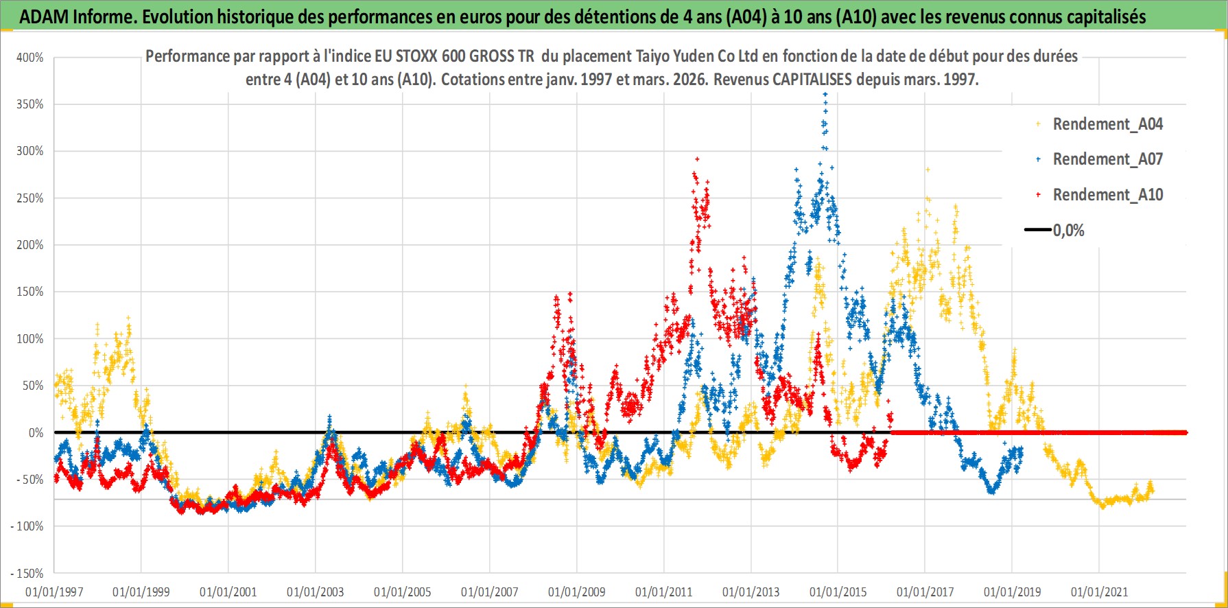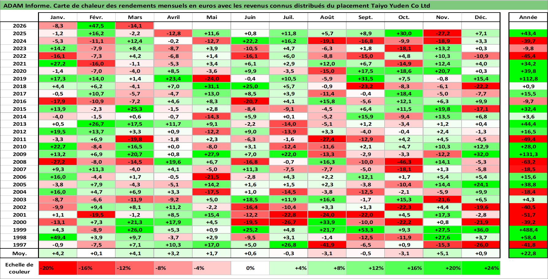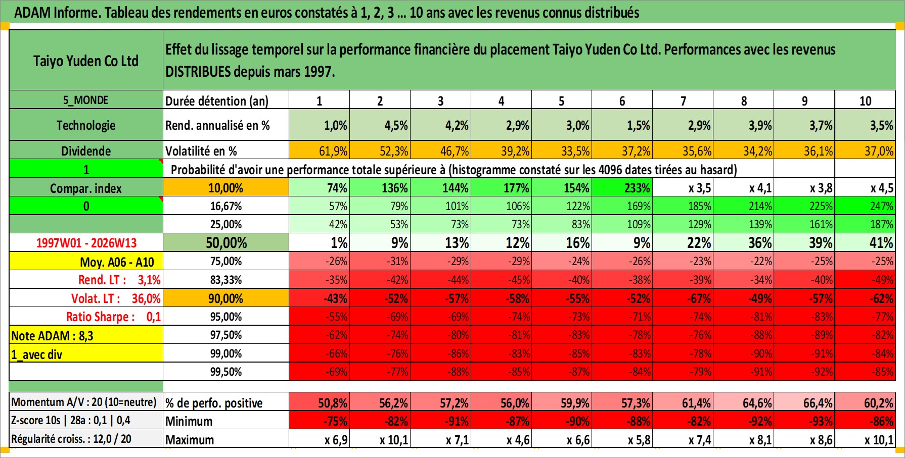 Site dédié aux investisseursPage dédiée sur site financeAnalyse des valorisations hebdomadaires de l'action Taiyo Yuden Co Ltd. Cet actif est cote en JPY. Les valorisations sont en contrevaleur EURO et couvrent les semaines 1997W01 a 2026W13. Les revenus de cet actif financier sont pris en compte depuis la semaine 1997W13. La note ESG de cet actif n'est pas connue.