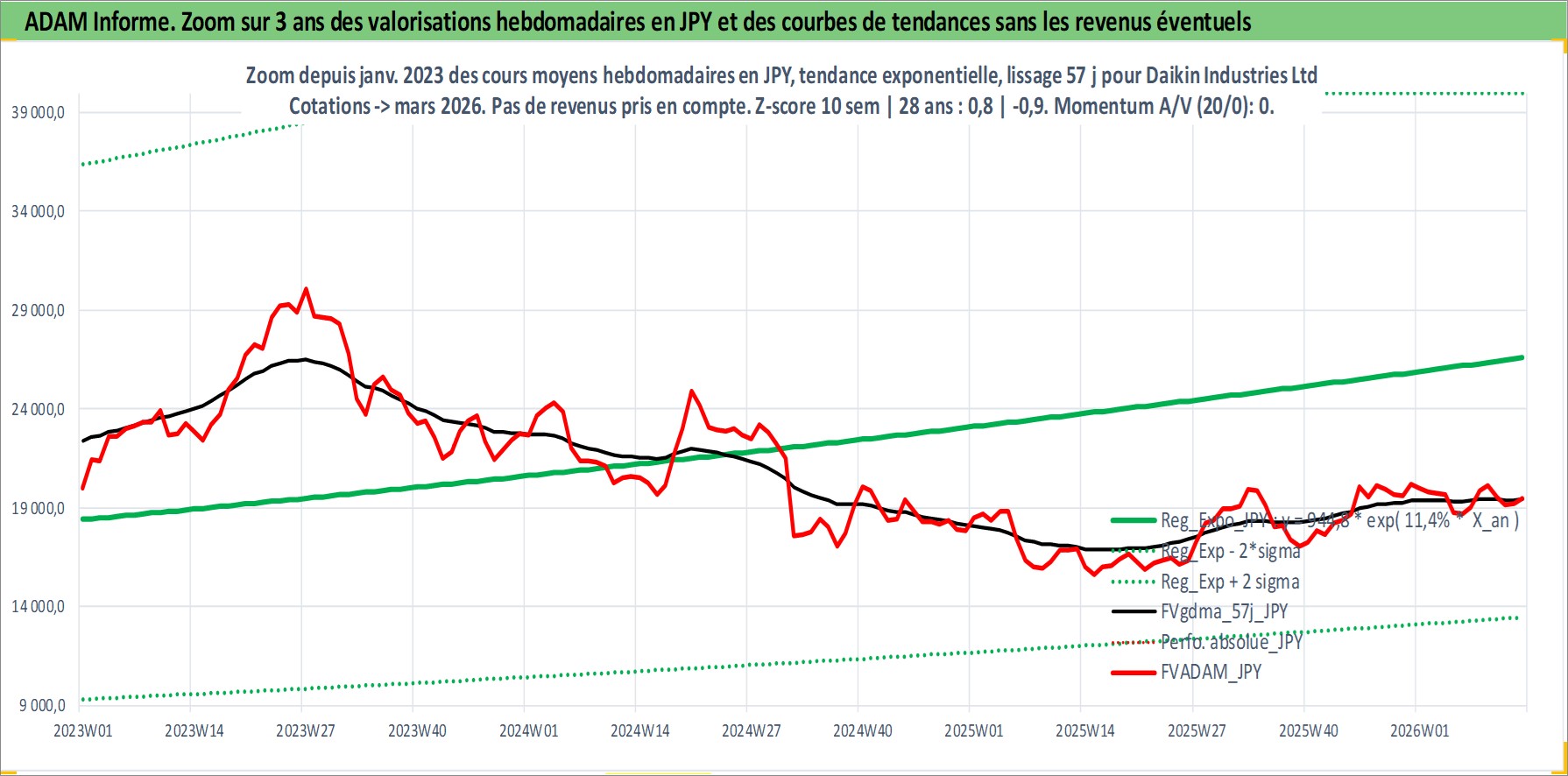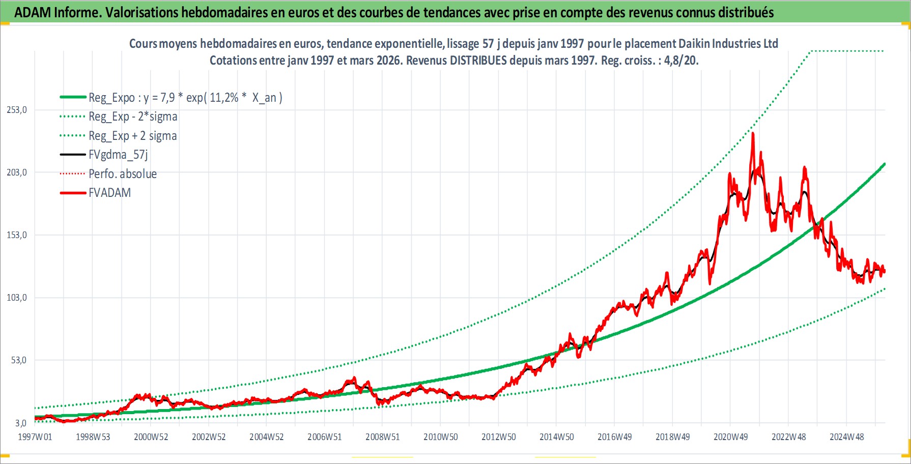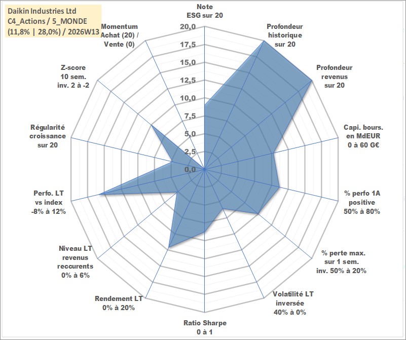 Site dédié aux investisseursPage dédiée sur site financeAnalyse des valorisations hebdomadaires de l'action Daikin Industries Ltd. Cet actif est cote en JPY. Les valorisations sont en contrevaleur EURO et couvrent les semaines 1997W01 a 2026W13. Les revenus de cet actif financier sont pris en compte depuis la semaine 1997W13. La note globale ESG de cet actif est estimee a 9.0 (apres rebasage entre 0 et 20).
