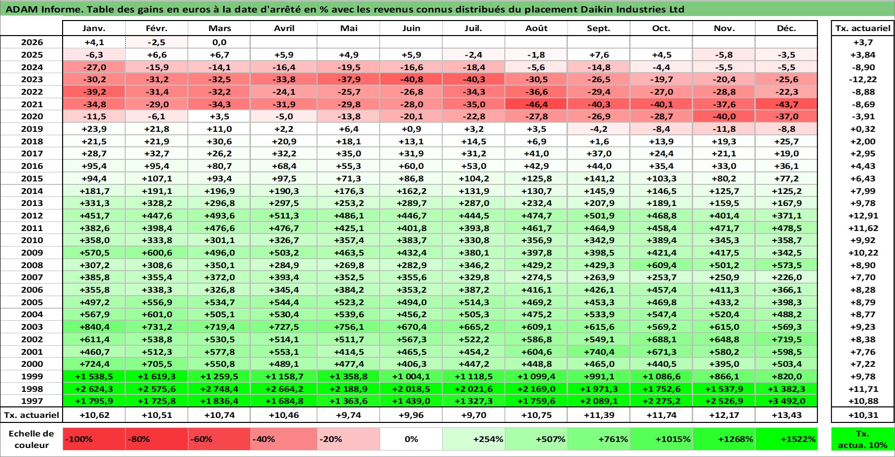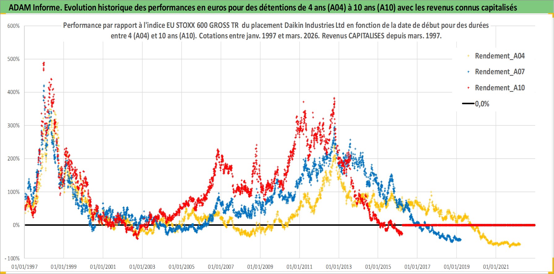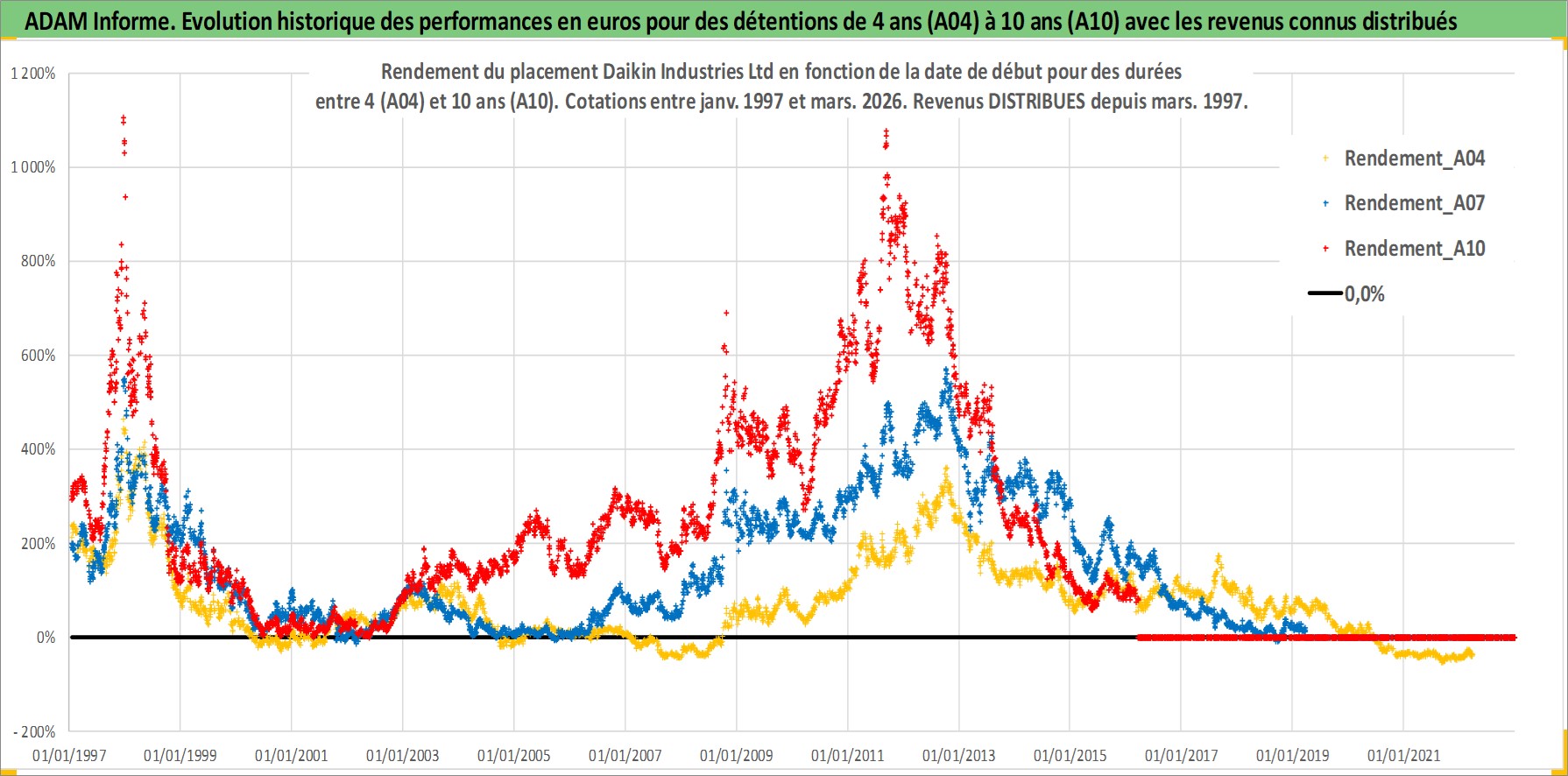 Site dédié aux investisseursPage dédiée sur site financeAnalyse des valorisations hebdomadaires de l'action Daikin Industries Ltd. Cet actif est cote en JPY. Les valorisations sont en contrevaleur EURO et couvrent les semaines 1997W01 a 2026W13. Les revenus de cet actif financier sont pris en compte depuis la semaine 1997W13. La note globale ESG de cet actif est estimee a 9.0 (apres rebasage entre 0 et 20).