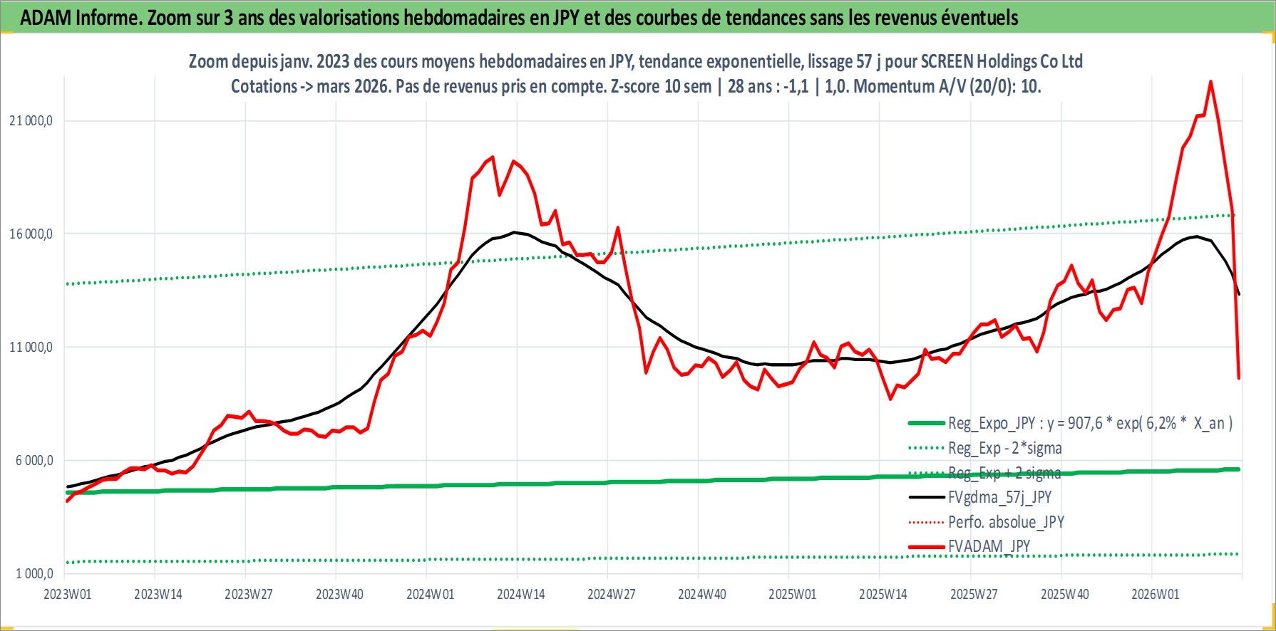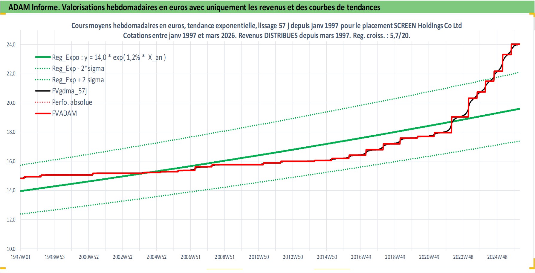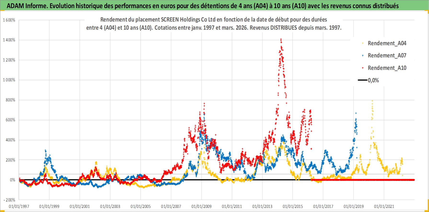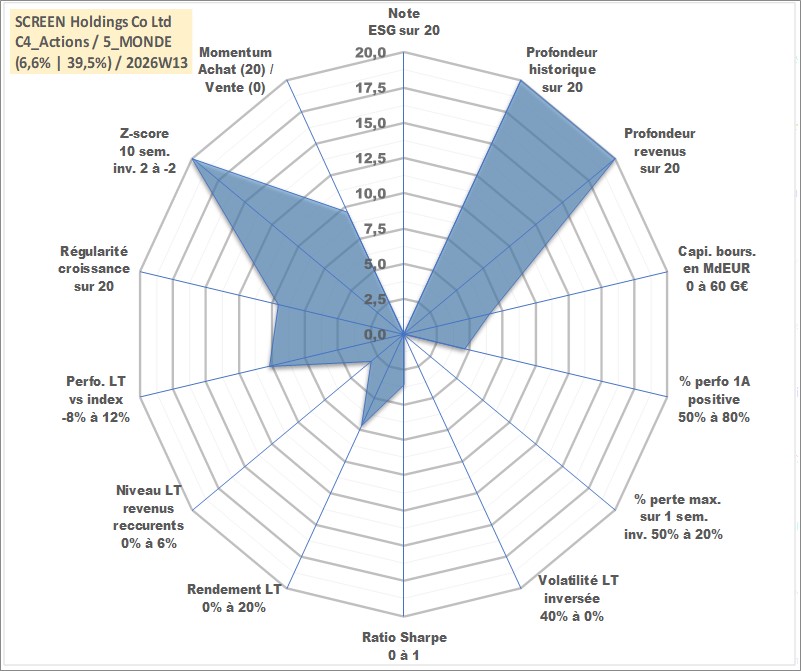 Site dédié aux investisseursPage dédiée sur site financeAnalyse des valorisations hebdomadaires de l'action SCREEN Holdings Co Ltd. Cet actif est cote en JPY. Les valorisations sont en contrevaleur EURO et couvrent les semaines 1997W01 a 2026W13. Les revenus de cet actif financier sont pris en compte depuis la semaine 1997W13. La note ESG de cet actif n'est pas connue.