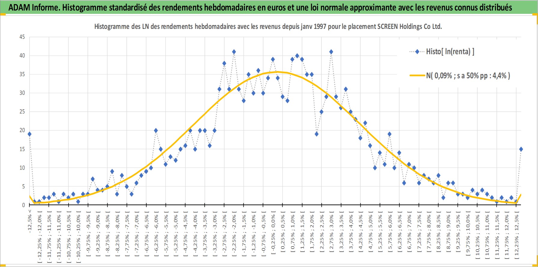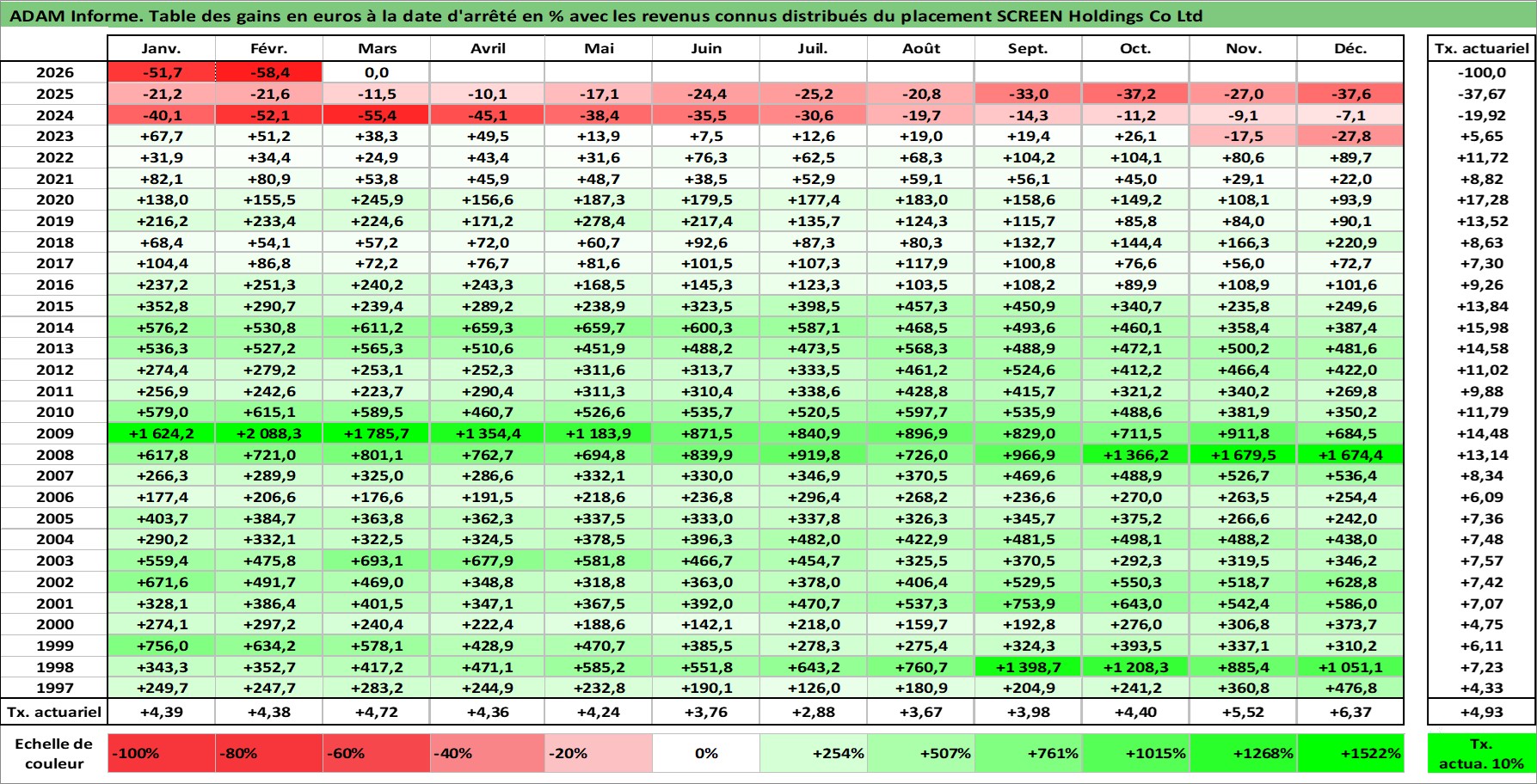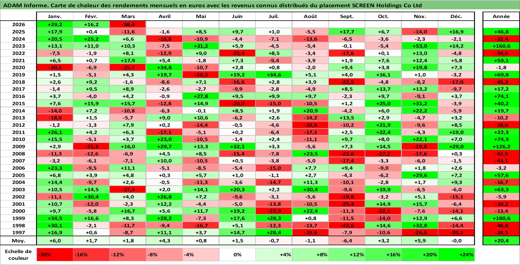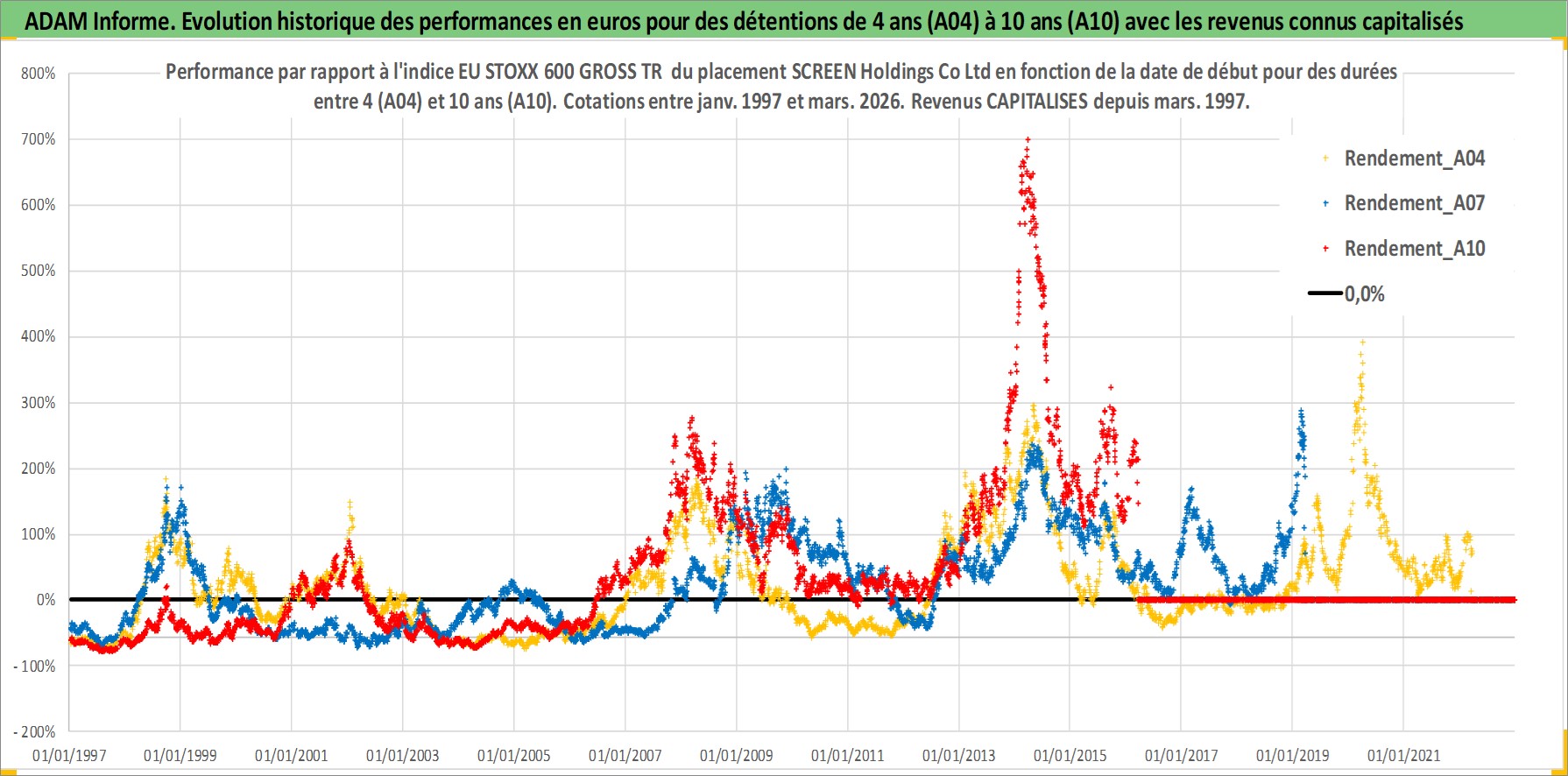 Site dédié aux investisseursPage dédiée sur site financeAnalyse des valorisations hebdomadaires de l'action SCREEN Holdings Co Ltd. Cet actif est cote en JPY. Les valorisations sont en contrevaleur EURO et couvrent les semaines 1997W01 a 2026W13. Les revenus de cet actif financier sont pris en compte depuis la semaine 1997W13. La note ESG de cet actif n'est pas connue.