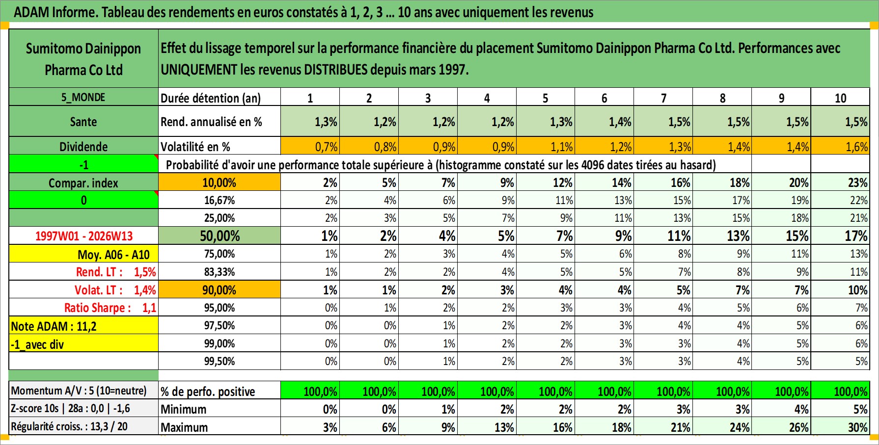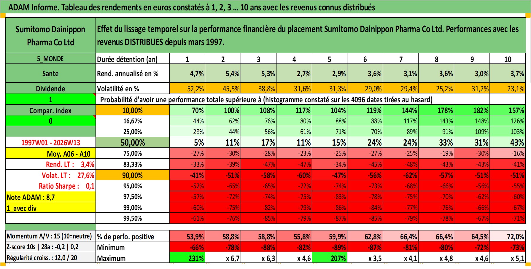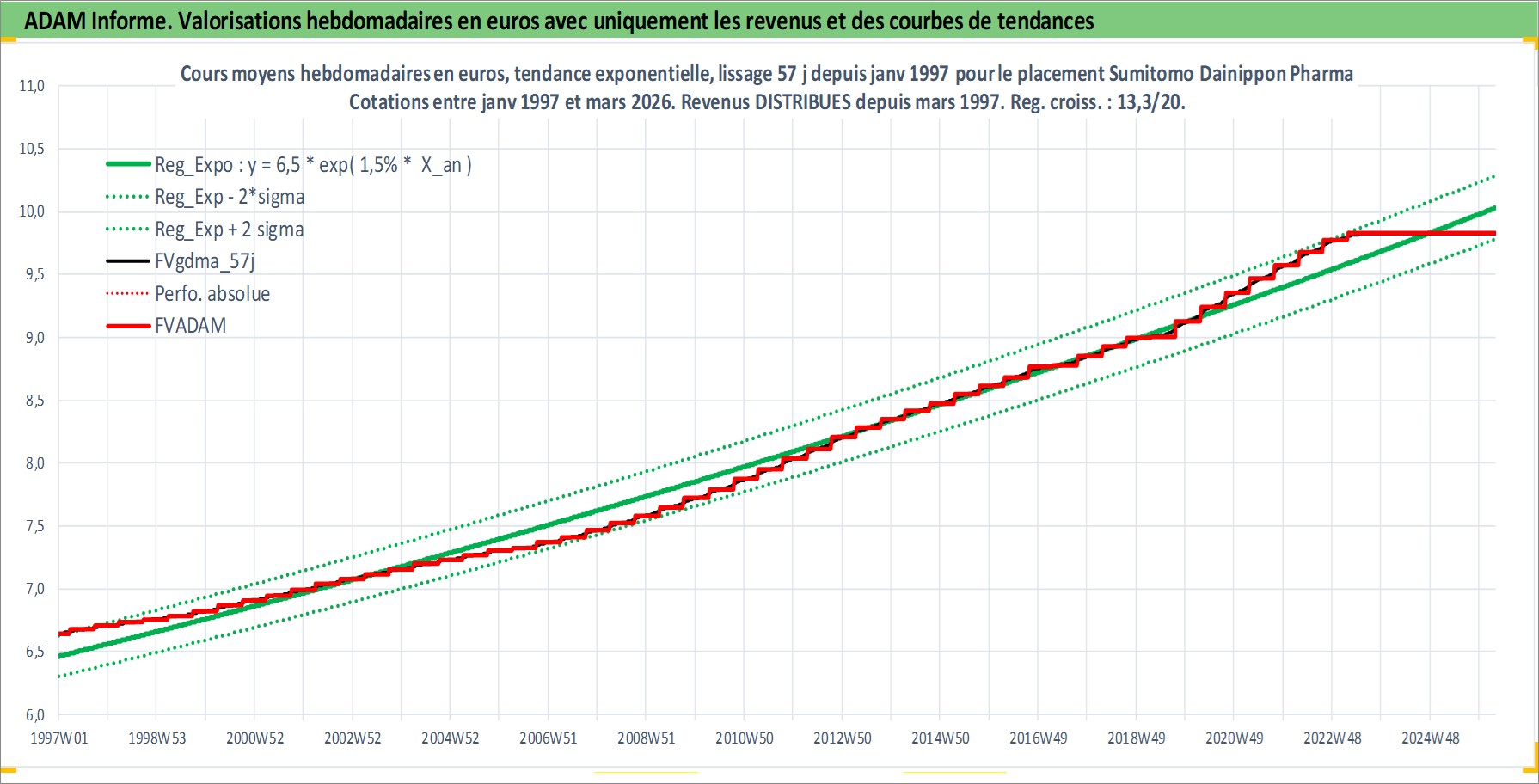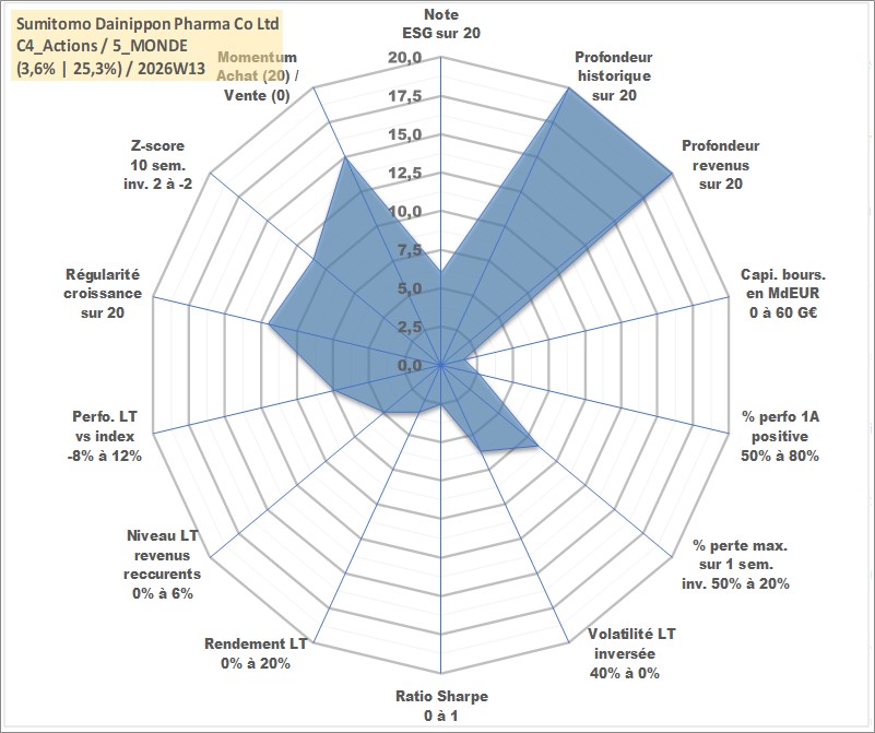 Site dédié aux investisseursPage dédiée sur site financeAnalyse des valorisations hebdomadaires de l'action Sumitomo Dainippon Pharma Co Ltd. Cet actif est cote en JPY. Les valorisations sont en contrevaleur EURO et couvrent les semaines 1997W01 a 2026W13. Les revenus de cet actif financier sont pris en compte depuis la semaine 1997W13. La note globale ESG de cet actif est estimee a 6.0 (apres rebasage entre 0 et 20).