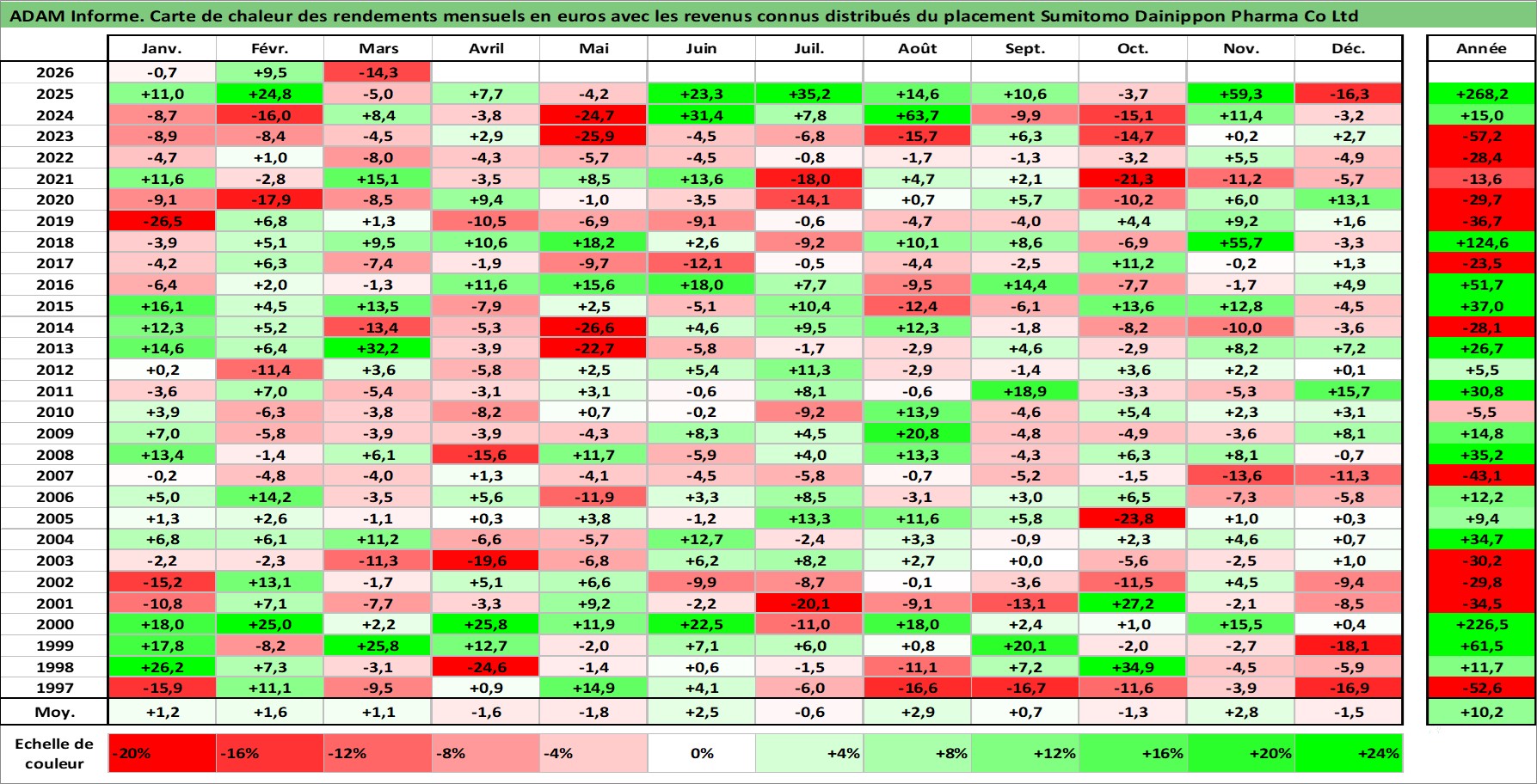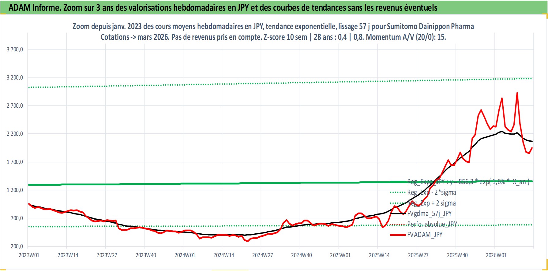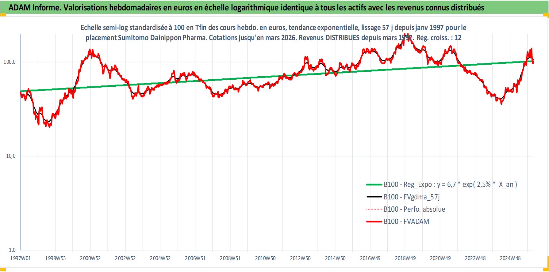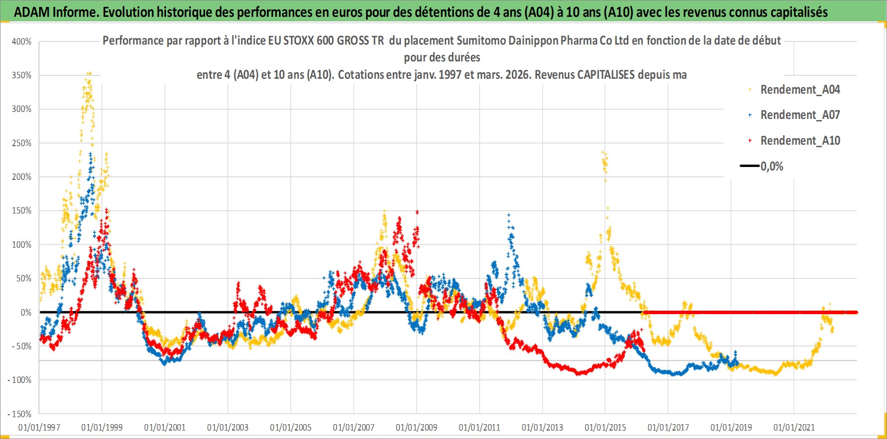 Site dédié aux investisseursPage dédiée sur site financeAnalyse des valorisations hebdomadaires de l'action Sumitomo Dainippon Pharma Co Ltd. Cet actif est cote en JPY. Les valorisations sont en contrevaleur EURO et couvrent les semaines 1997W01 a 2026W13. Les revenus de cet actif financier sont pris en compte depuis la semaine 1997W13. La note globale ESG de cet actif est estimee a 6.0 (apres rebasage entre 0 et 20).