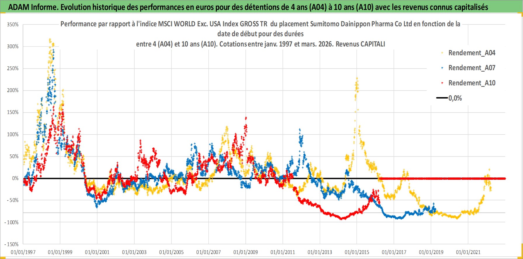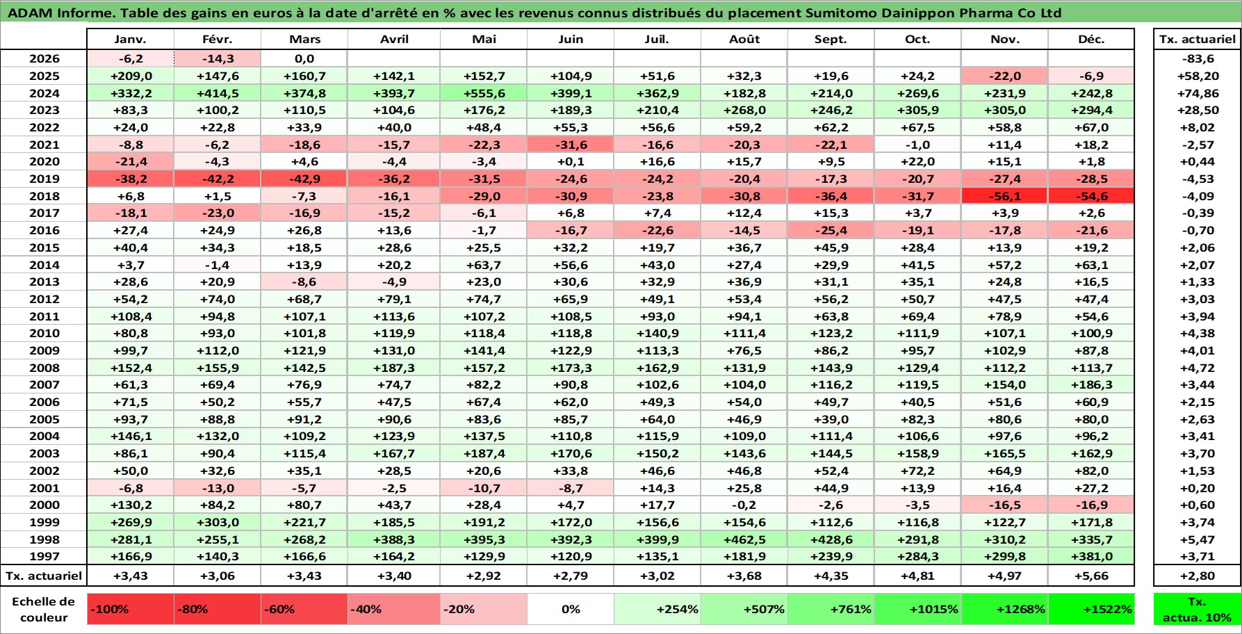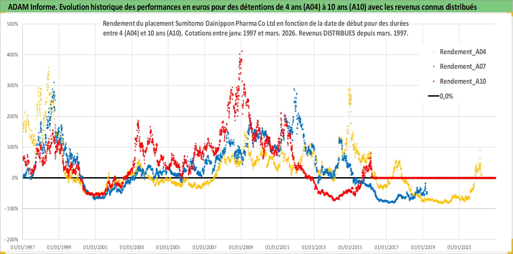 Site dédié aux investisseursPage dédiée sur site financeAnalyse des valorisations hebdomadaires de l'action Sumitomo Dainippon Pharma Co Ltd. Cet actif est cote en JPY. Les valorisations sont en contrevaleur EURO et couvrent les semaines 1997W01 a 2026W13. Les revenus de cet actif financier sont pris en compte depuis la semaine 1997W13. La note globale ESG de cet actif est estimee a 6.0 (apres rebasage entre 0 et 20).
