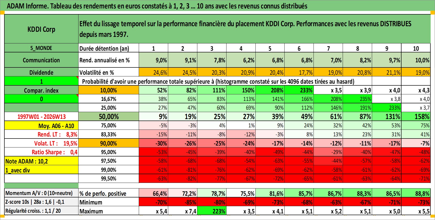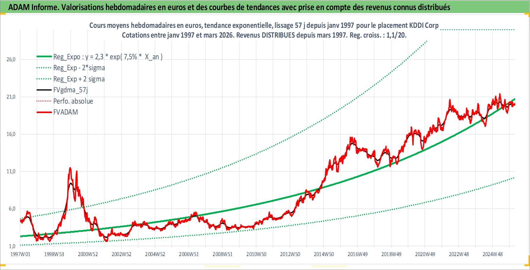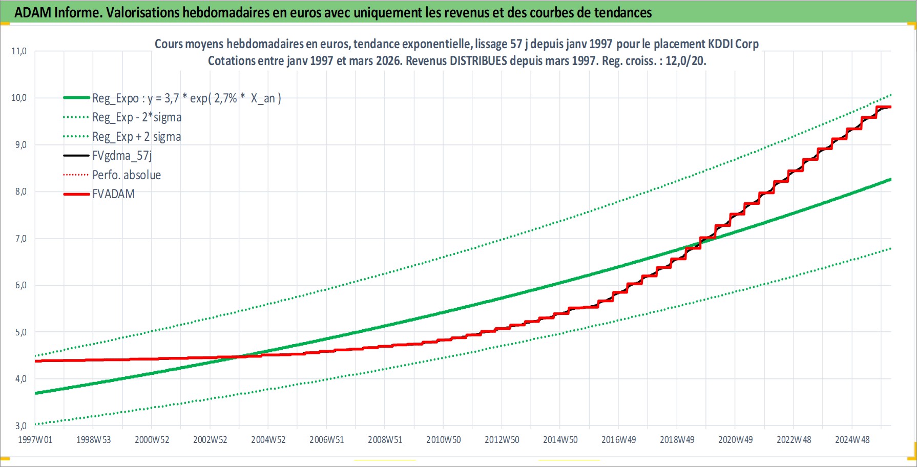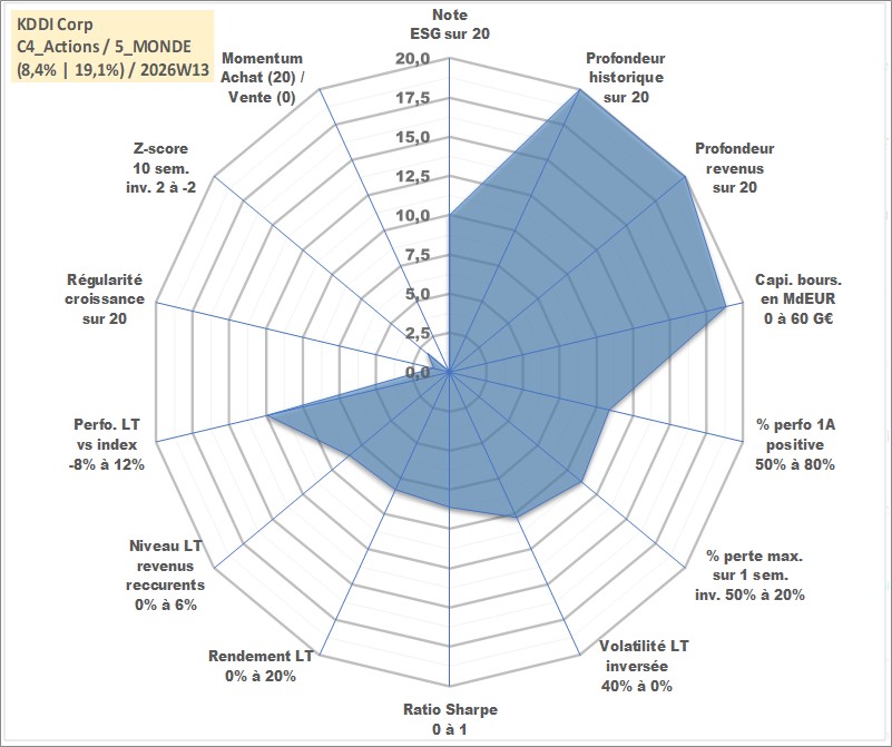 Site dédié aux investisseursPage dédiée sur site financeAnalyse des valorisations hebdomadaires de l'action KDDI Corp. Cet actif est cote en JPY. Les valorisations sont en contrevaleur EURO et couvrent les semaines 1997W01 a 2026W13. Les revenus de cet actif financier sont pris en compte depuis la semaine 1997W13. La note globale ESG de cet actif est estimee a 10.0 (apres rebasage entre 0 et 20).