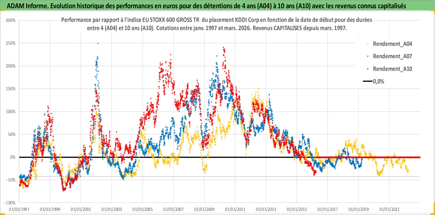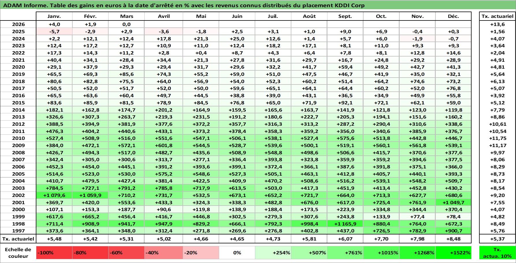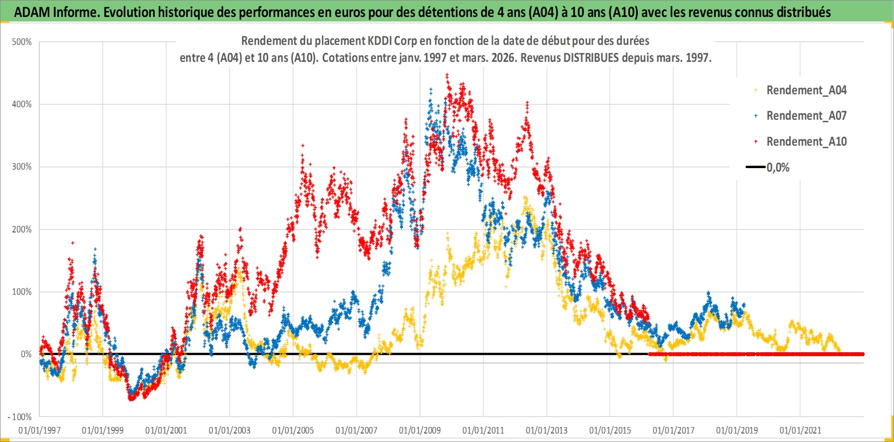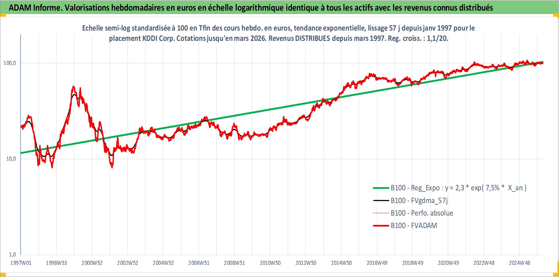 Site dédié aux investisseursPage dédiée sur site financeAnalyse des valorisations hebdomadaires de l'action KDDI Corp. Cet actif est cote en JPY. Les valorisations sont en contrevaleur EURO et couvrent les semaines 1997W01 a 2026W13. Les revenus de cet actif financier sont pris en compte depuis la semaine 1997W13. La note globale ESG de cet actif est estimee a 10.0 (apres rebasage entre 0 et 20).