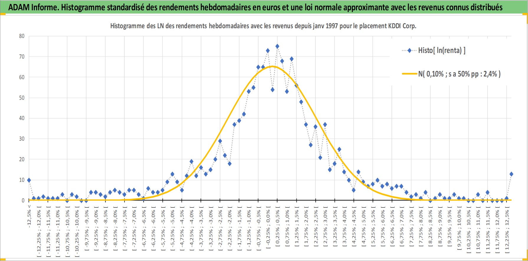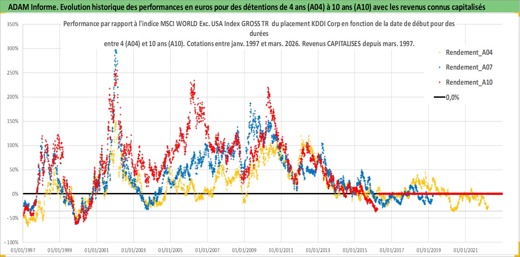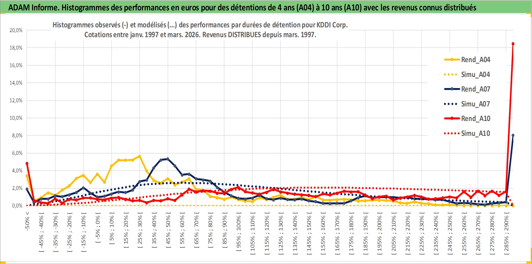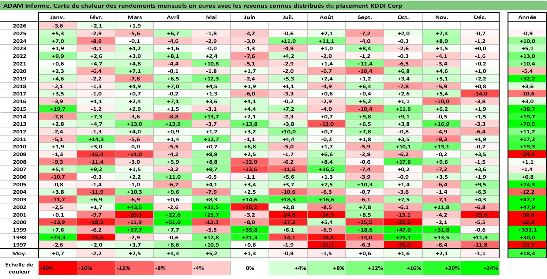 Site dédié aux investisseursPage dédiée sur site financeAnalyse des valorisations hebdomadaires de l'action KDDI Corp. Cet actif est cote en JPY. Les valorisations sont en contrevaleur EURO et couvrent les semaines 1997W01 a 2026W13. Les revenus de cet actif financier sont pris en compte depuis la semaine 1997W13. La note globale ESG de cet actif est estimee a 10.0 (apres rebasage entre 0 et 20).