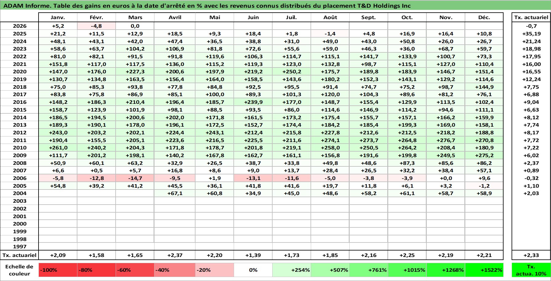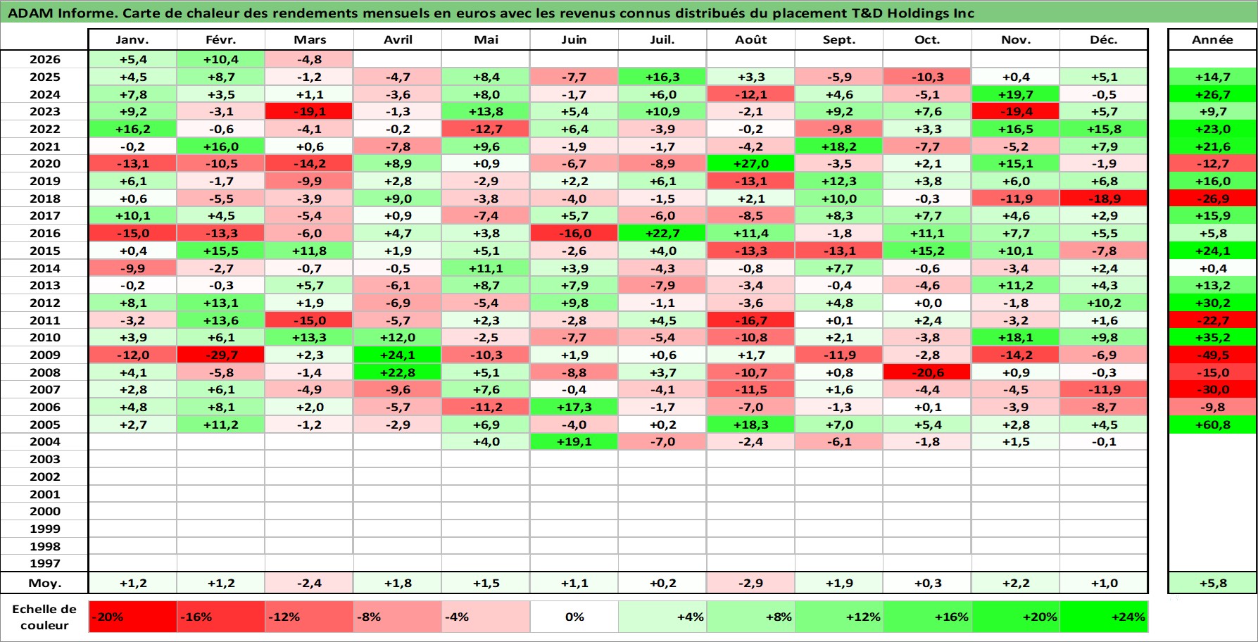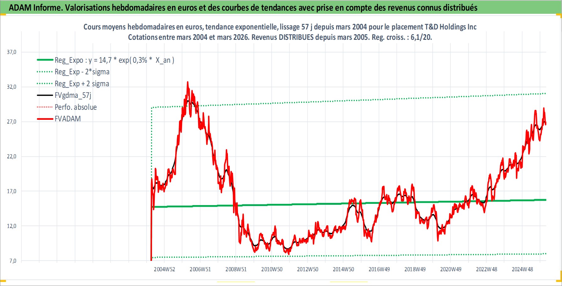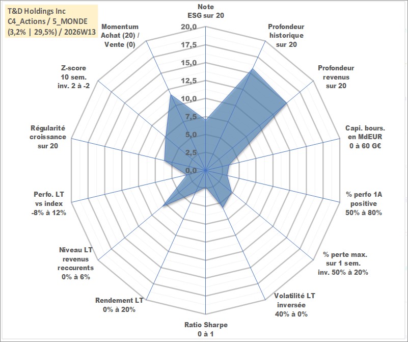 Site dédié aux investisseursPage dédiée sur site financeAnalyse des valorisations hebdomadaires de l'action T&D Holdings Inc. Cet actif est cote en JPY. Les valorisations sont en contrevaleur EURO et couvrent les semaines 2004W14 a 2026W13. Les revenus de cet actif financier sont pris en compte depuis la semaine 2005W13. La note globale ESG de cet actif est estimee a 7.0 (apres rebasage entre 0 et 20).