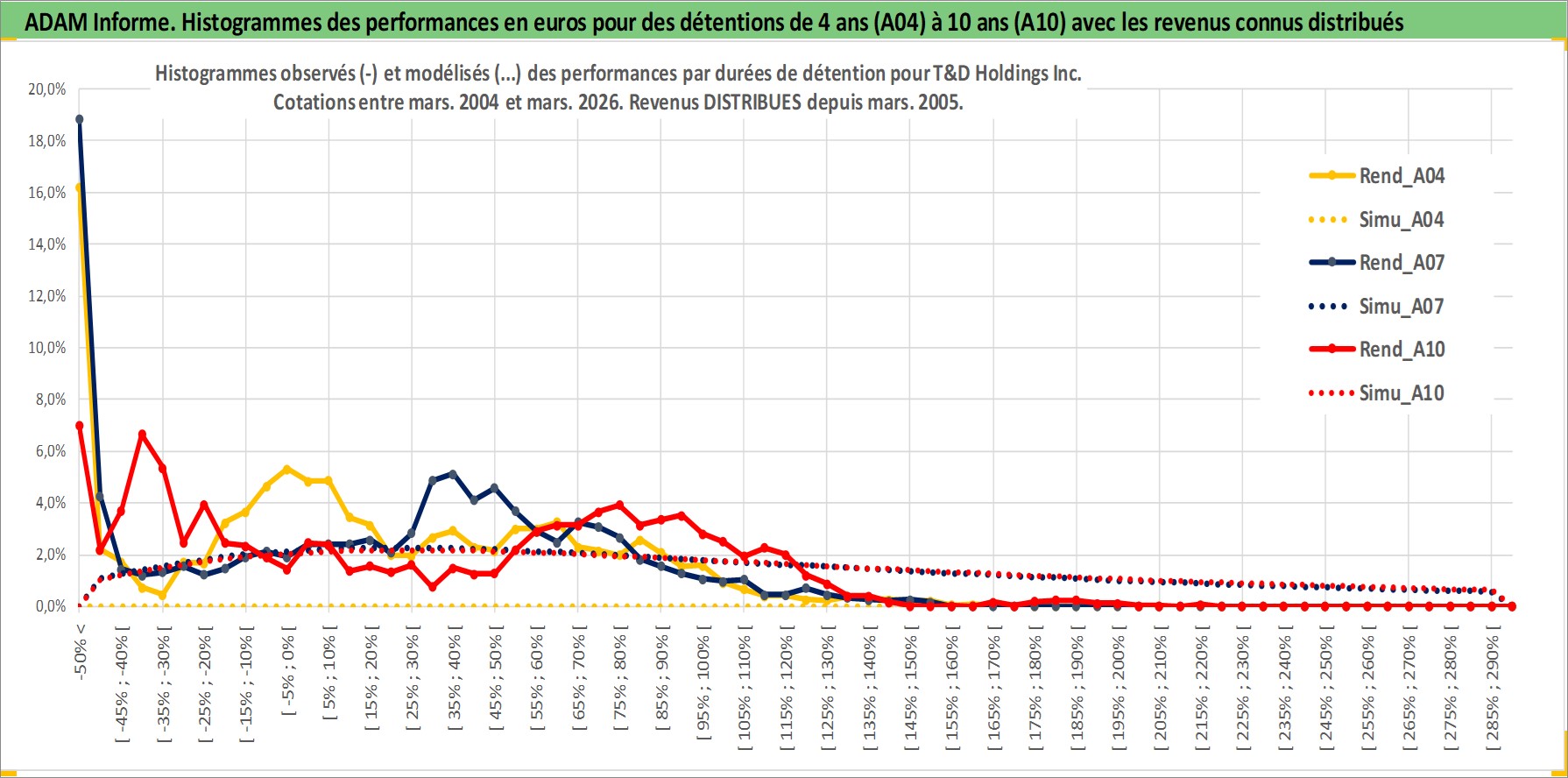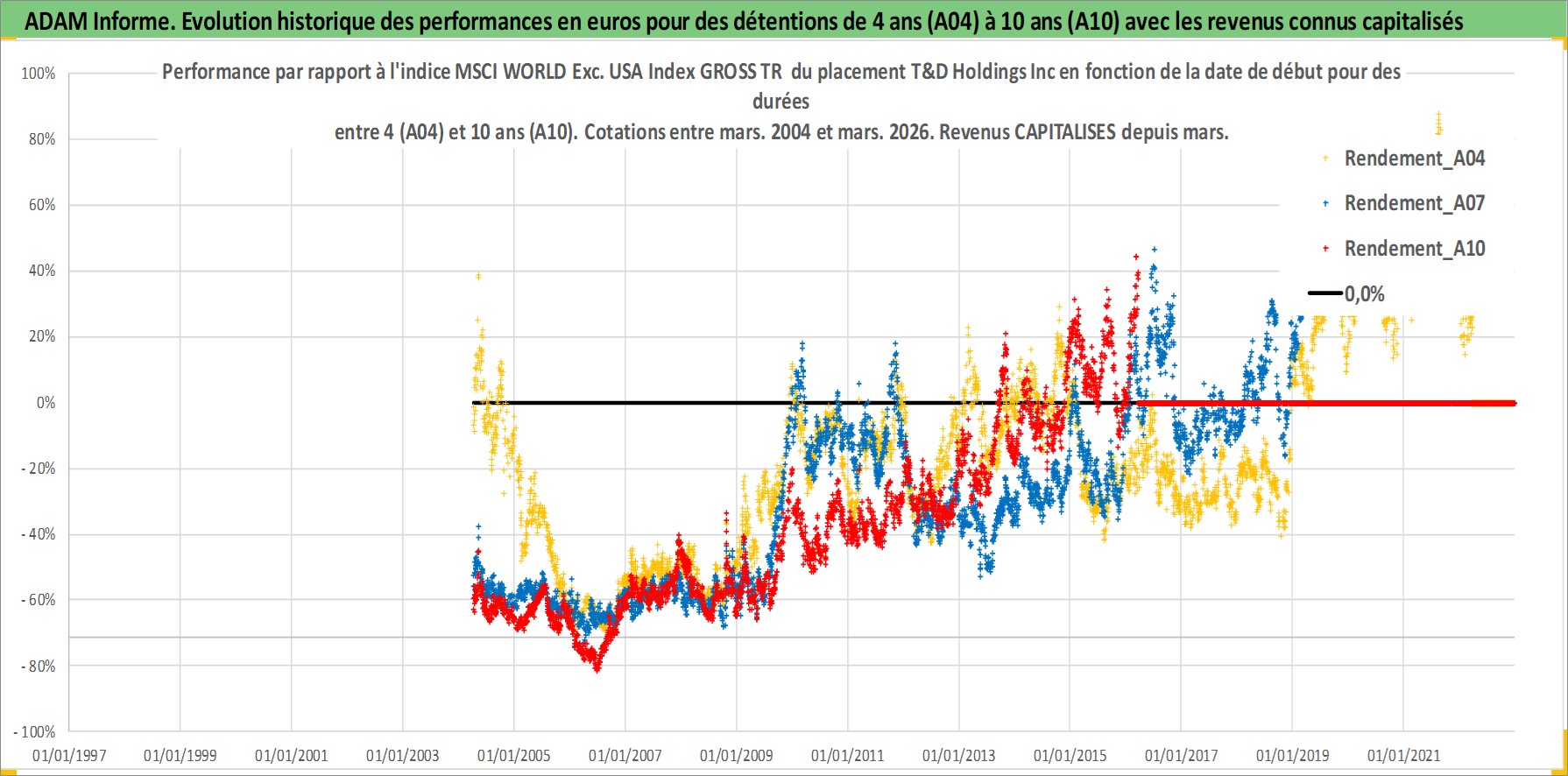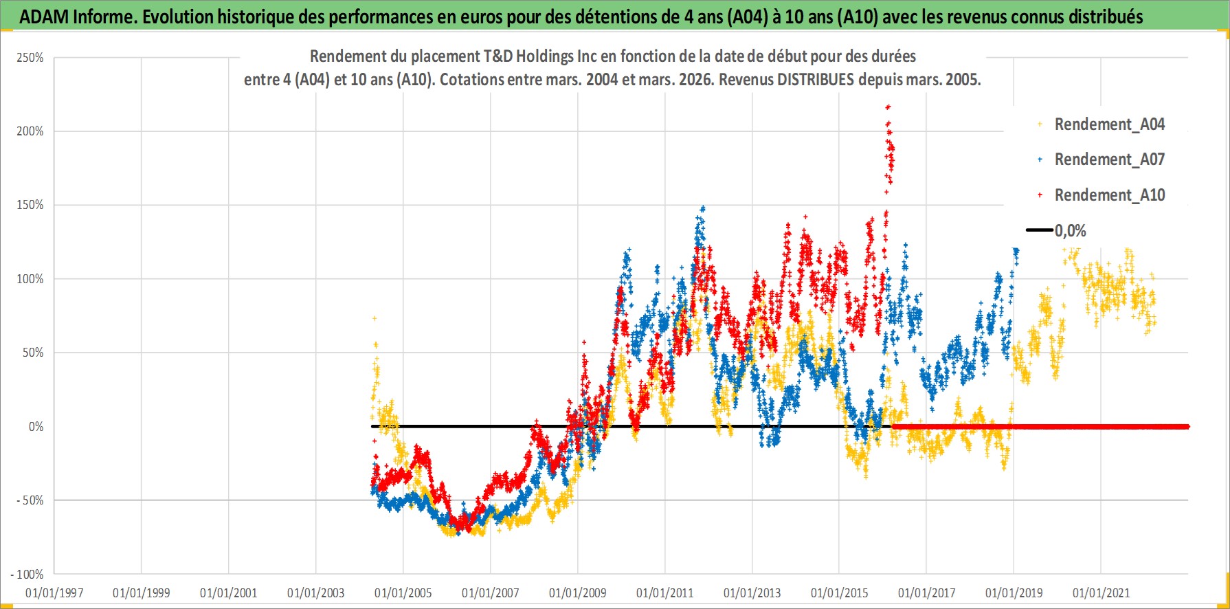 Site dédié aux investisseursPage dédiée sur site financeAnalyse des valorisations hebdomadaires de l'action T&D Holdings Inc. Cet actif est cote en JPY. Les valorisations sont en contrevaleur EURO et couvrent les semaines 2004W14 a 2026W13. Les revenus de cet actif financier sont pris en compte depuis la semaine 2005W13. La note globale ESG de cet actif est estimee a 7.0 (apres rebasage entre 0 et 20).
