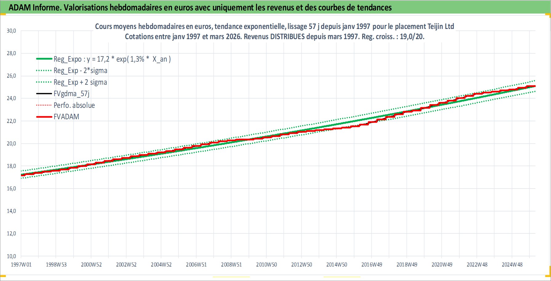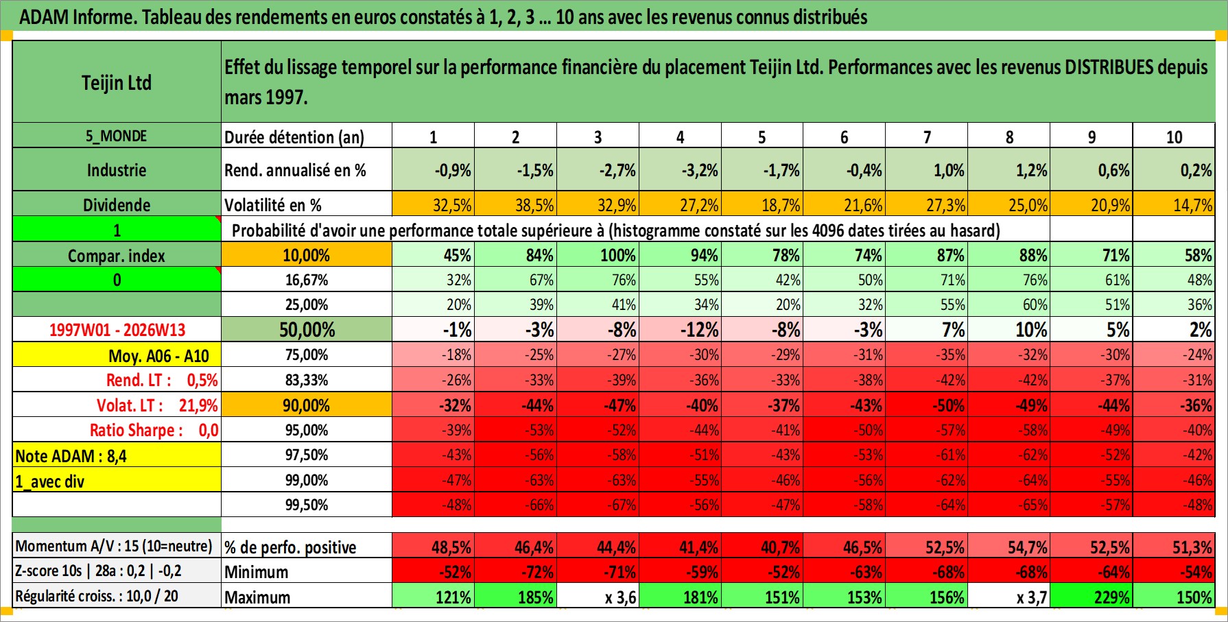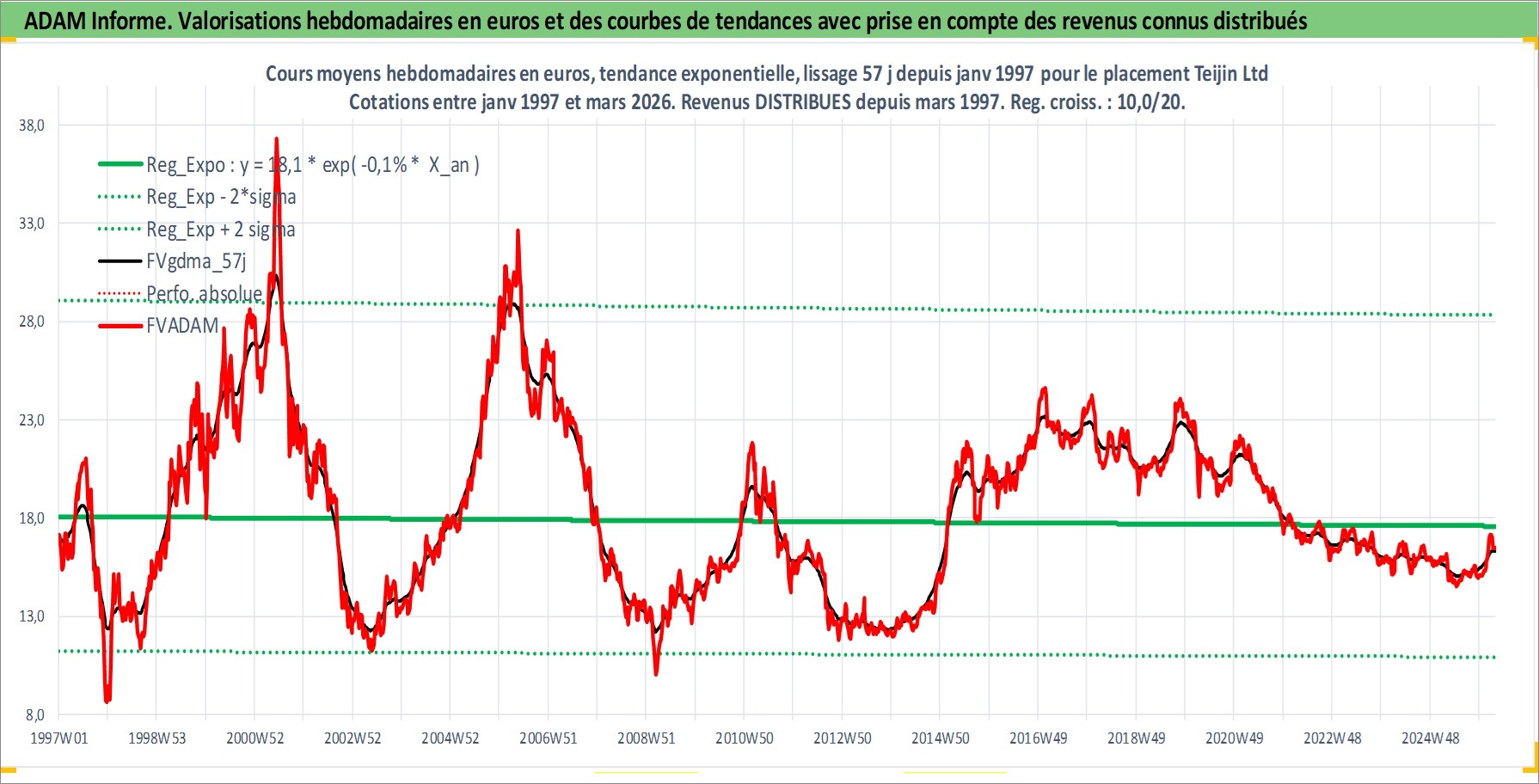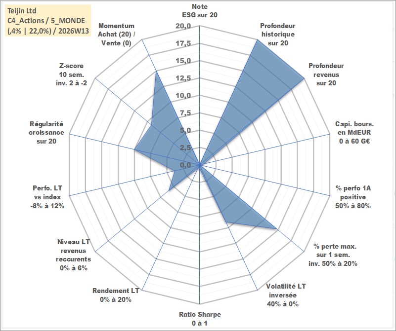 Site dédié aux investisseursPage dédiée sur site financeAnalyse des valorisations hebdomadaires de l'action Teijin Ltd. Cet actif est cote en JPY. Les valorisations sont en contrevaleur EURO et couvrent les semaines 1997W01 a 2026W13. Les revenus de cet actif financier sont pris en compte depuis la semaine 1997W13. La note ESG de cet actif n'est pas connue.