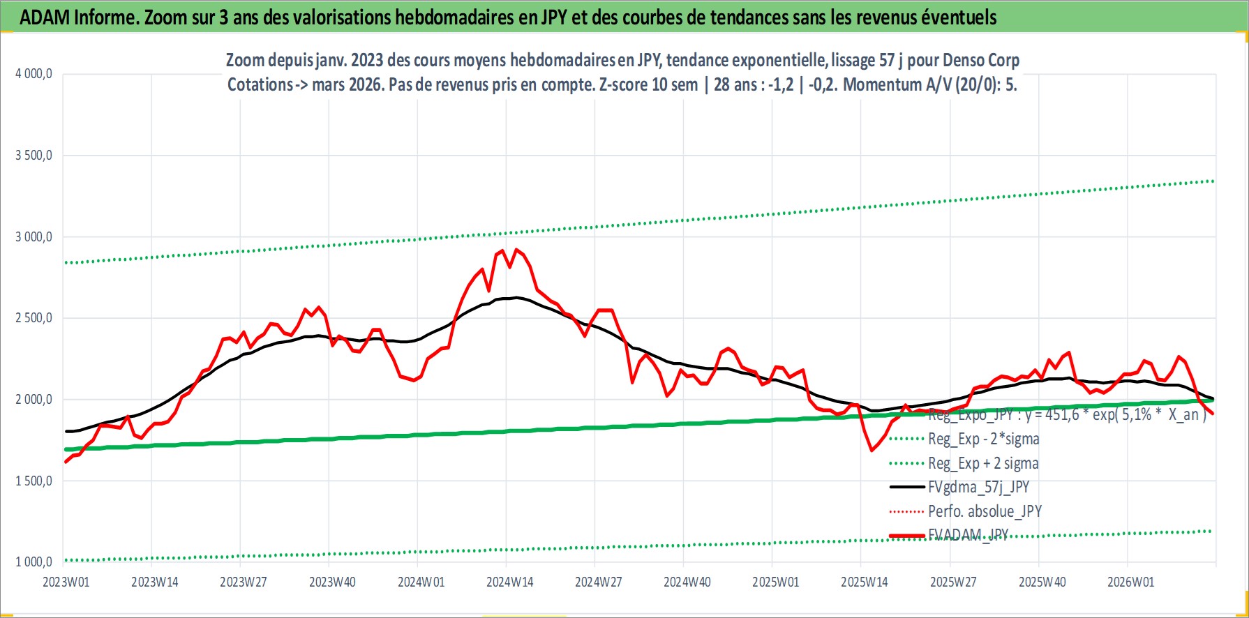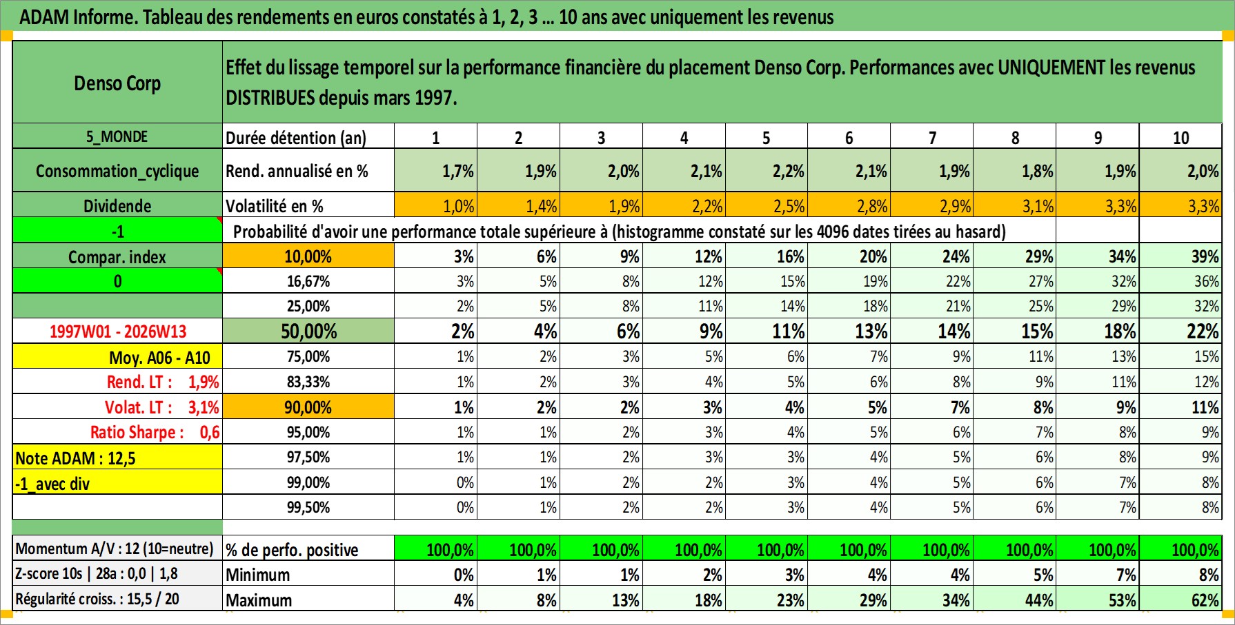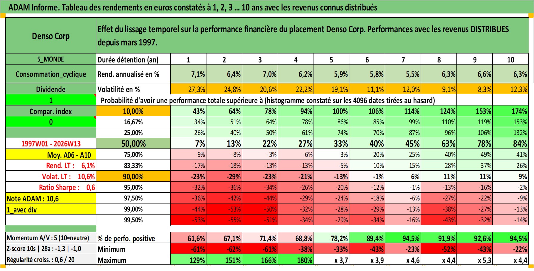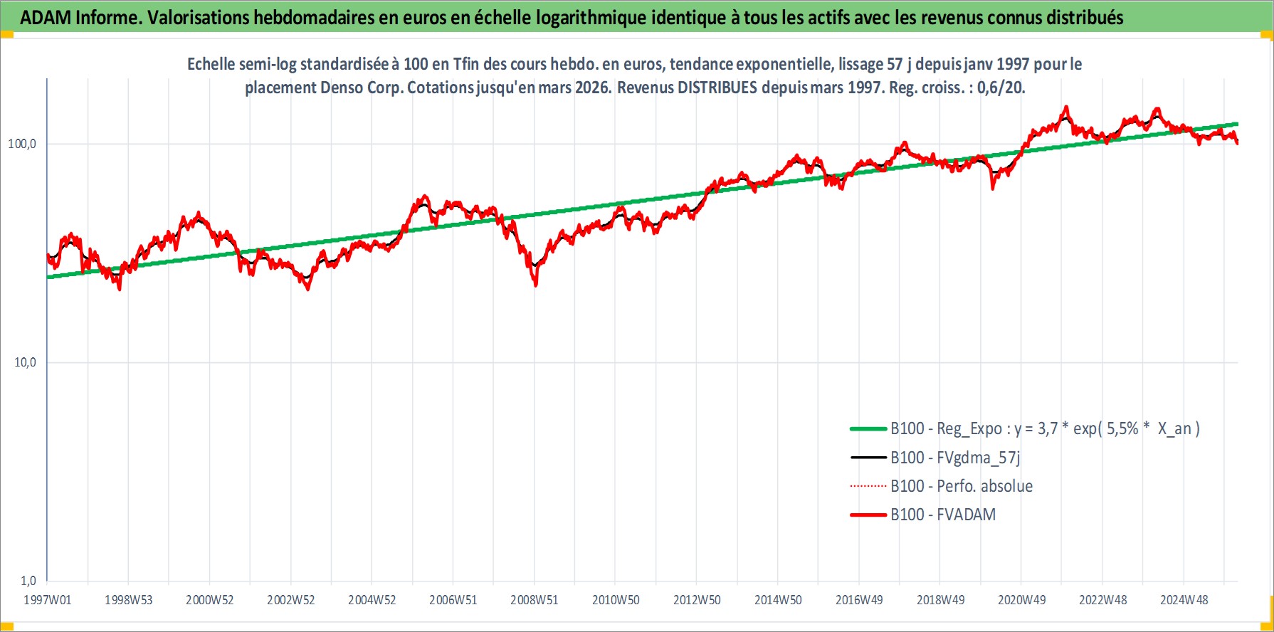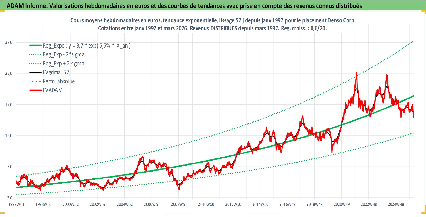 Site dédié aux investisseursPage dédiée sur site financeAnalyse des valorisations hebdomadaires de l'action Denso Corp. Cet actif est cote en JPY. Les valorisations sont en contrevaleur EURO et couvrent les semaines 1997W01 a 2026W13. Les revenus de cet actif financier sont pris en compte depuis la semaine 1997W13. La note globale ESG de cet actif est estimee a 10.0 (apres rebasage entre 0 et 20).