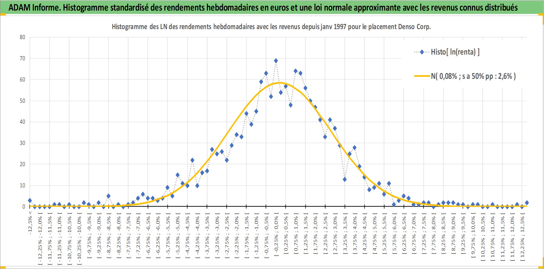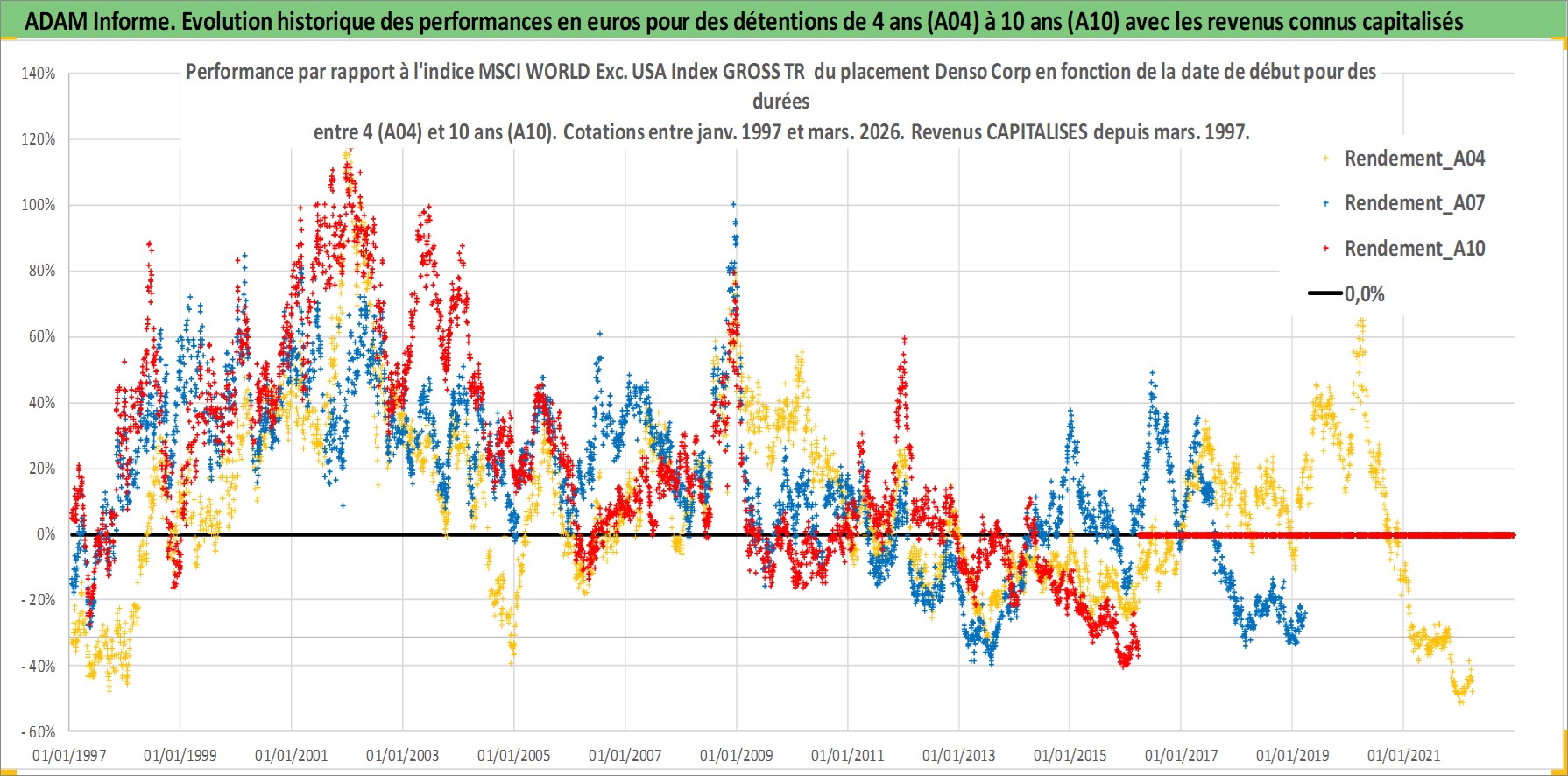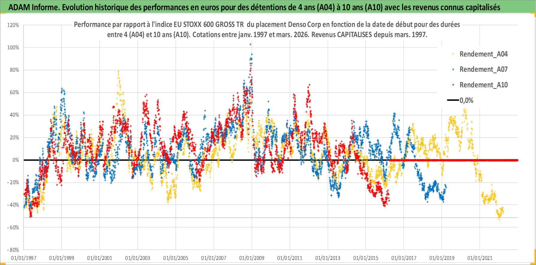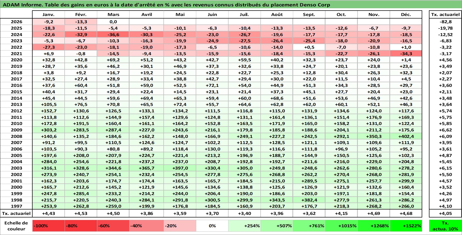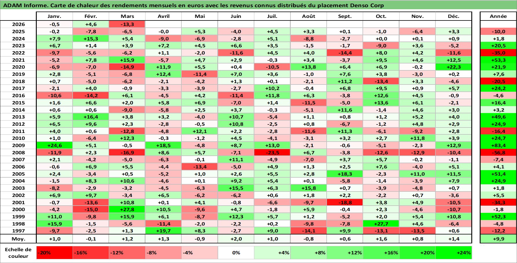Site dédié aux investisseursPage dédiée sur site financeAnalyse des valorisations hebdomadaires de l'action Denso Corp. Cet actif est cote en JPY. Les valorisations sont en contrevaleur EURO et couvrent les semaines 1997W01 a 2026W13. Les revenus de cet actif financier sont pris en compte depuis la semaine 1997W13. La note globale ESG de cet actif est estimee a 10.0 (apres rebasage entre 0 et 20).