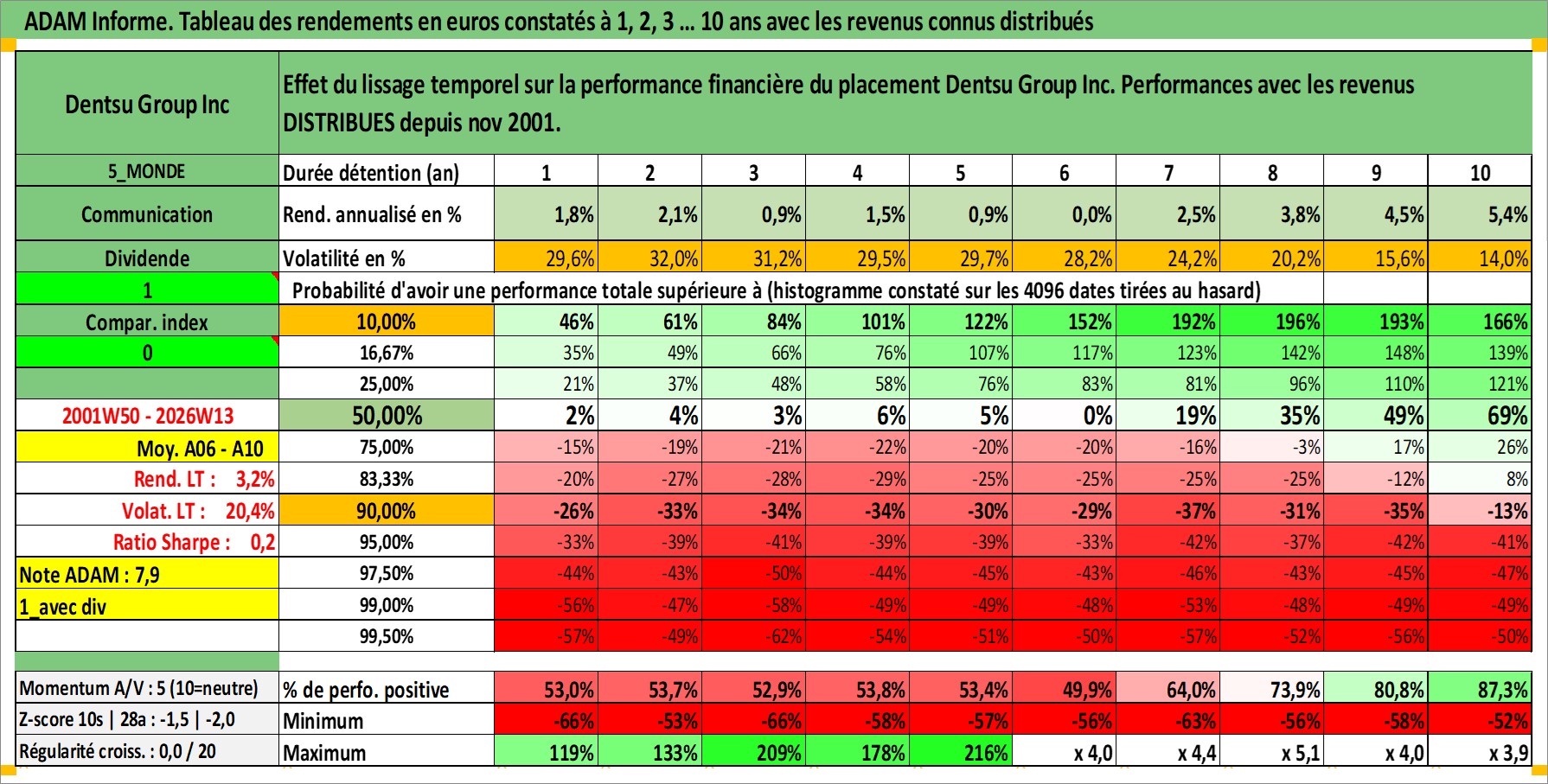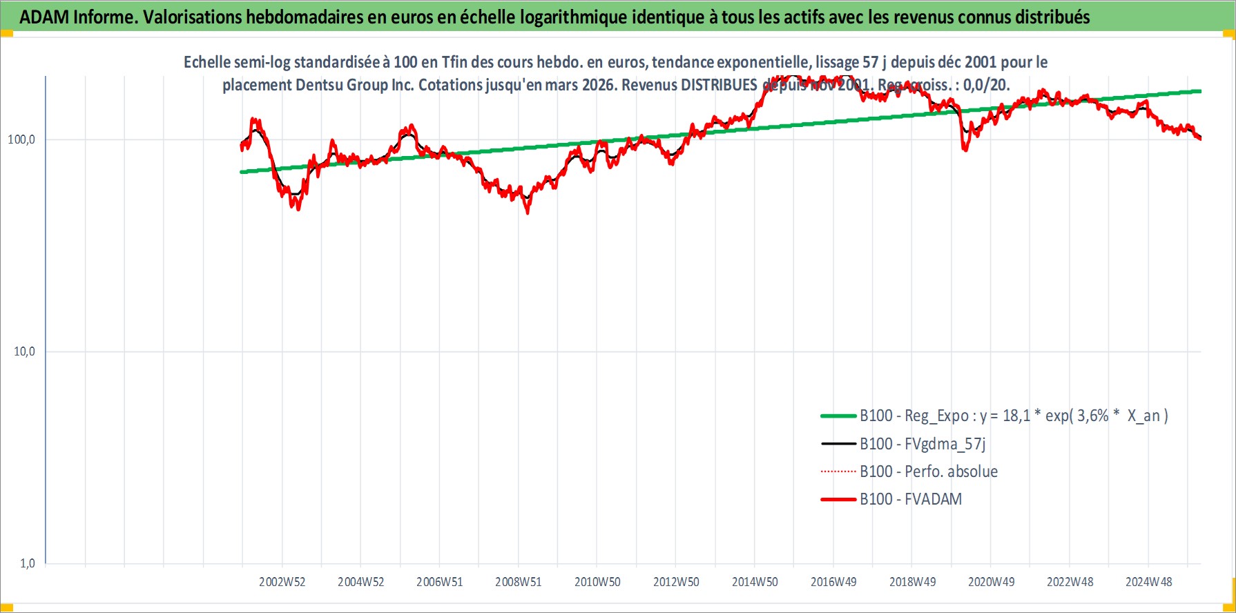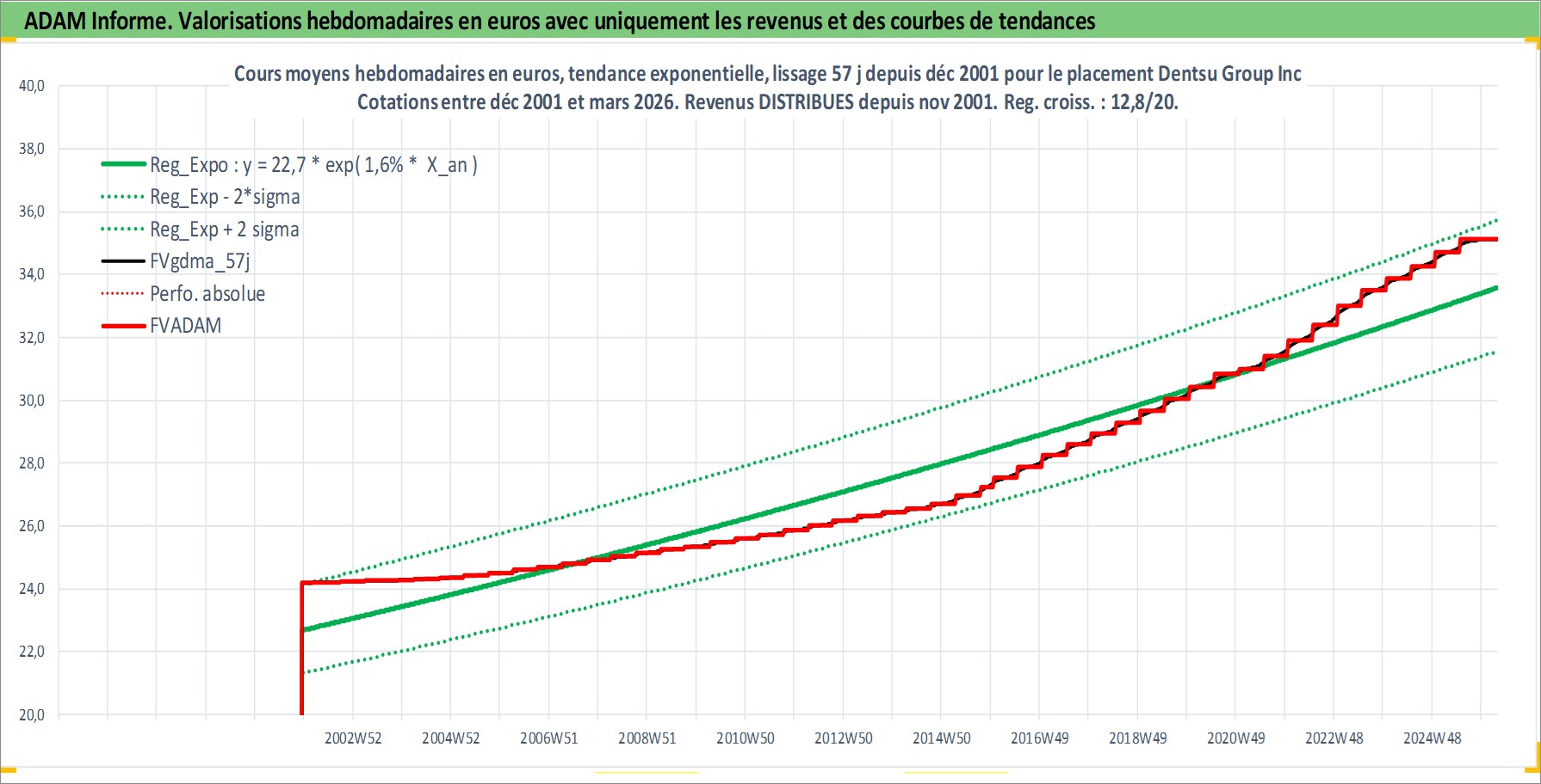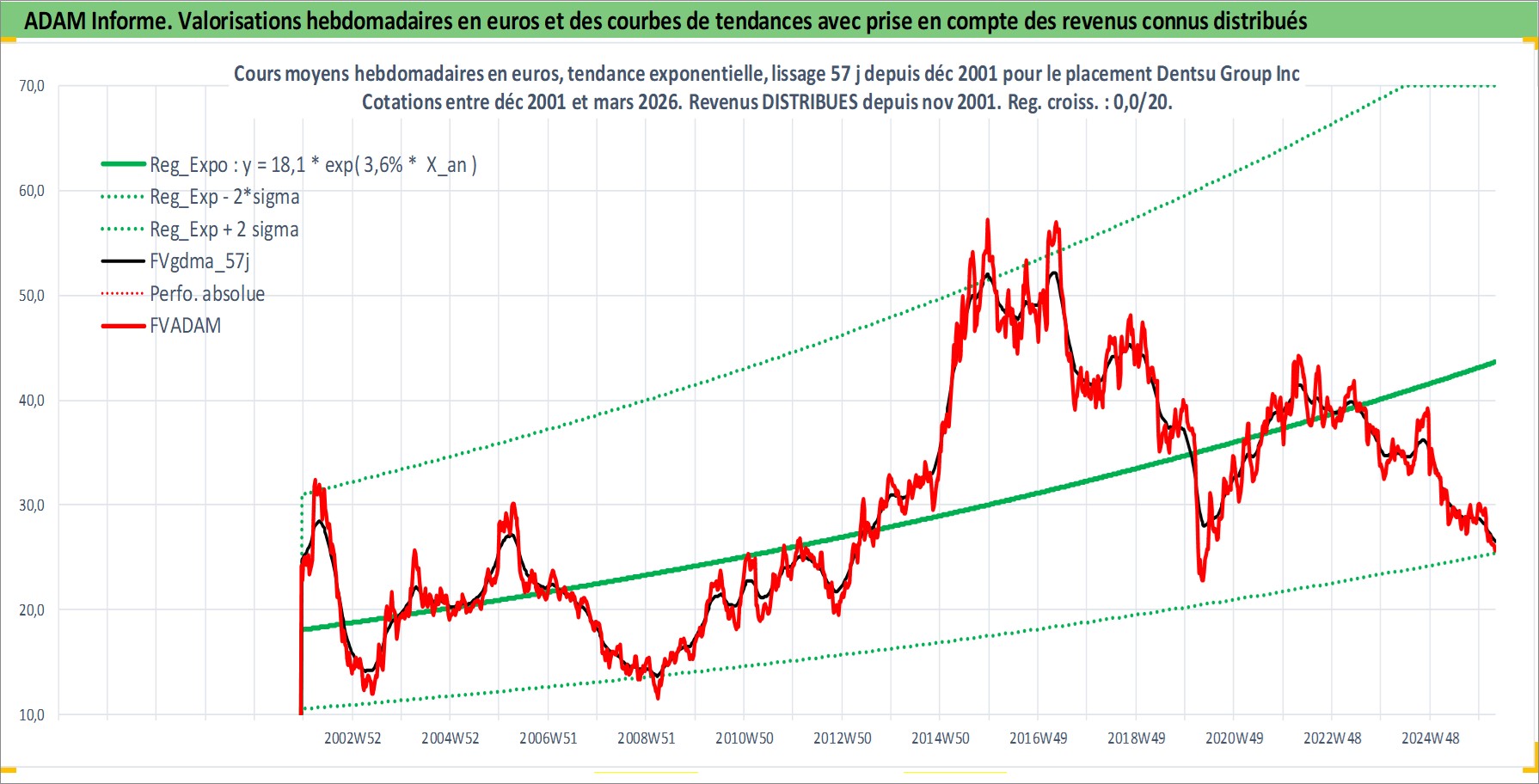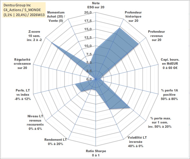 Site dédié aux investisseursPage dédiée sur site financeAnalyse des valorisations hebdomadaires de l'action Dentsu Group Inc. Cet actif est cote en JPY. Les valorisations sont en contrevaleur EURO et couvrent les semaines 2001W50 a 2026W13. Les revenus de cet actif financier sont pris en compte depuis la semaine 2001W48. La note globale ESG de cet actif est estimee a 9.0 (apres rebasage entre 0 et 20).