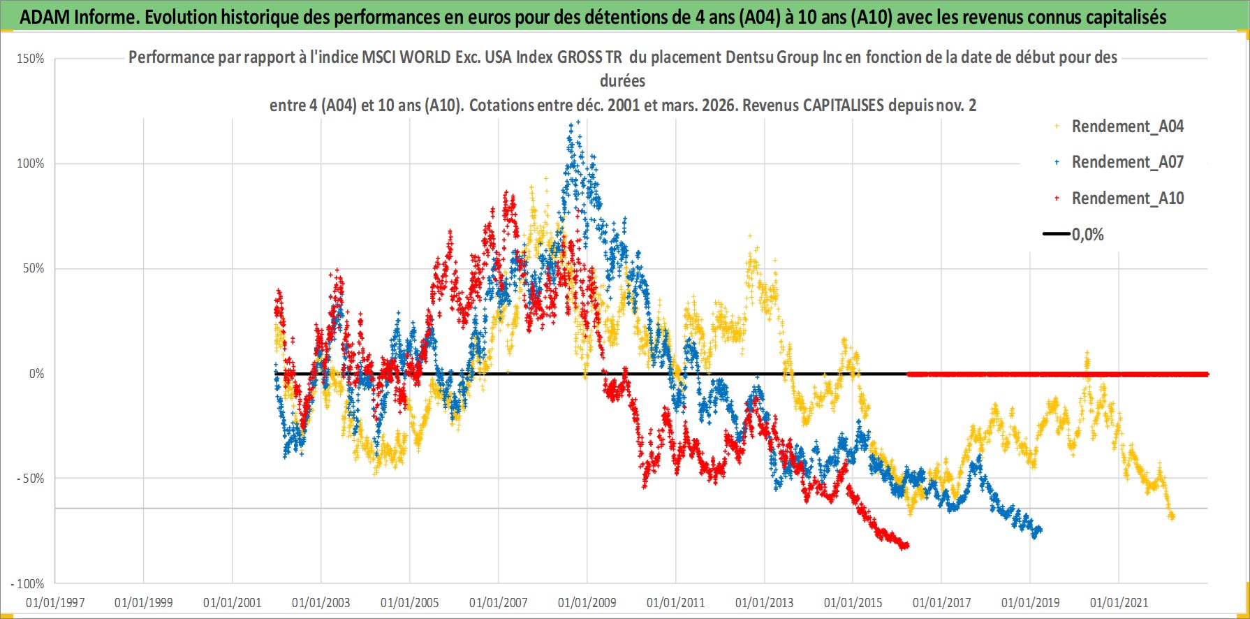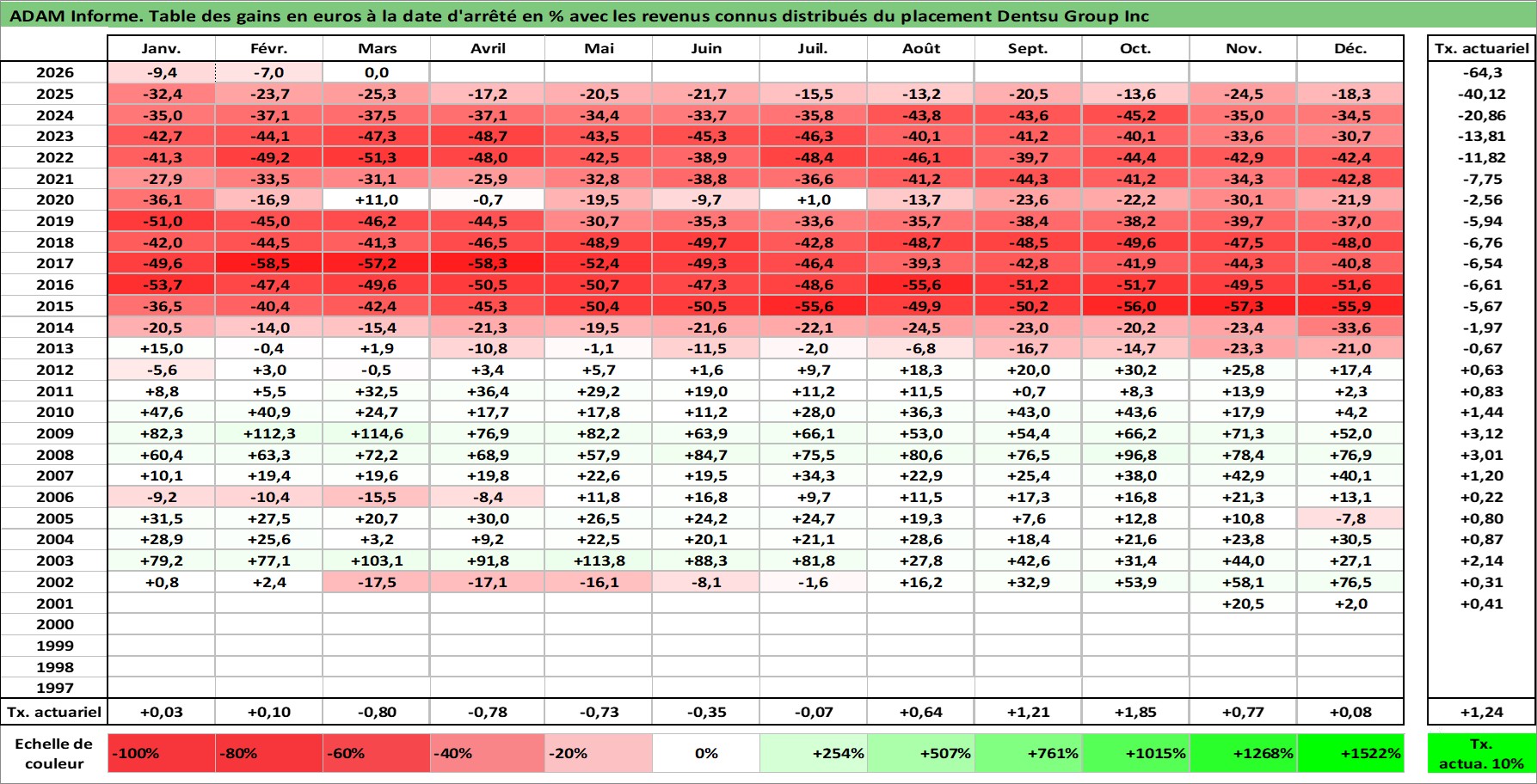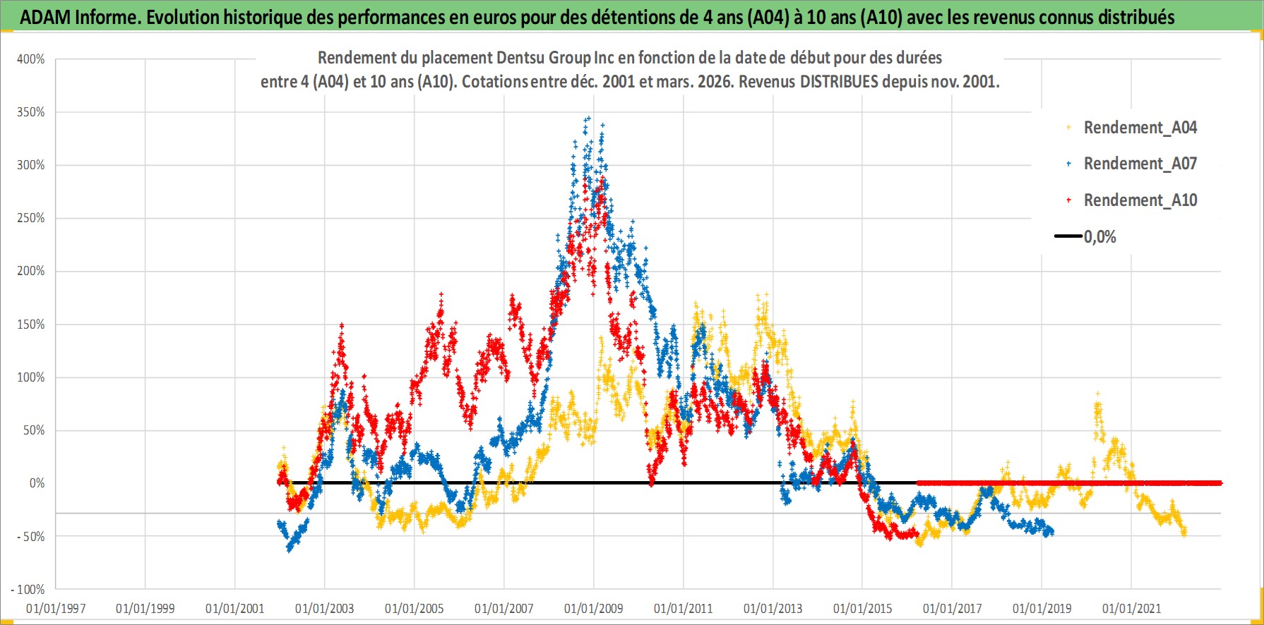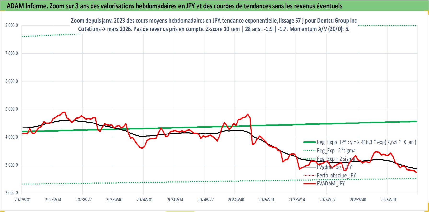 Site dédié aux investisseursPage dédiée sur site financeAnalyse des valorisations hebdomadaires de l'action Dentsu Group Inc. Cet actif est cote en JPY. Les valorisations sont en contrevaleur EURO et couvrent les semaines 2001W50 a 2026W13. Les revenus de cet actif financier sont pris en compte depuis la semaine 2001W48. La note globale ESG de cet actif est estimee a 9.0 (apres rebasage entre 0 et 20).