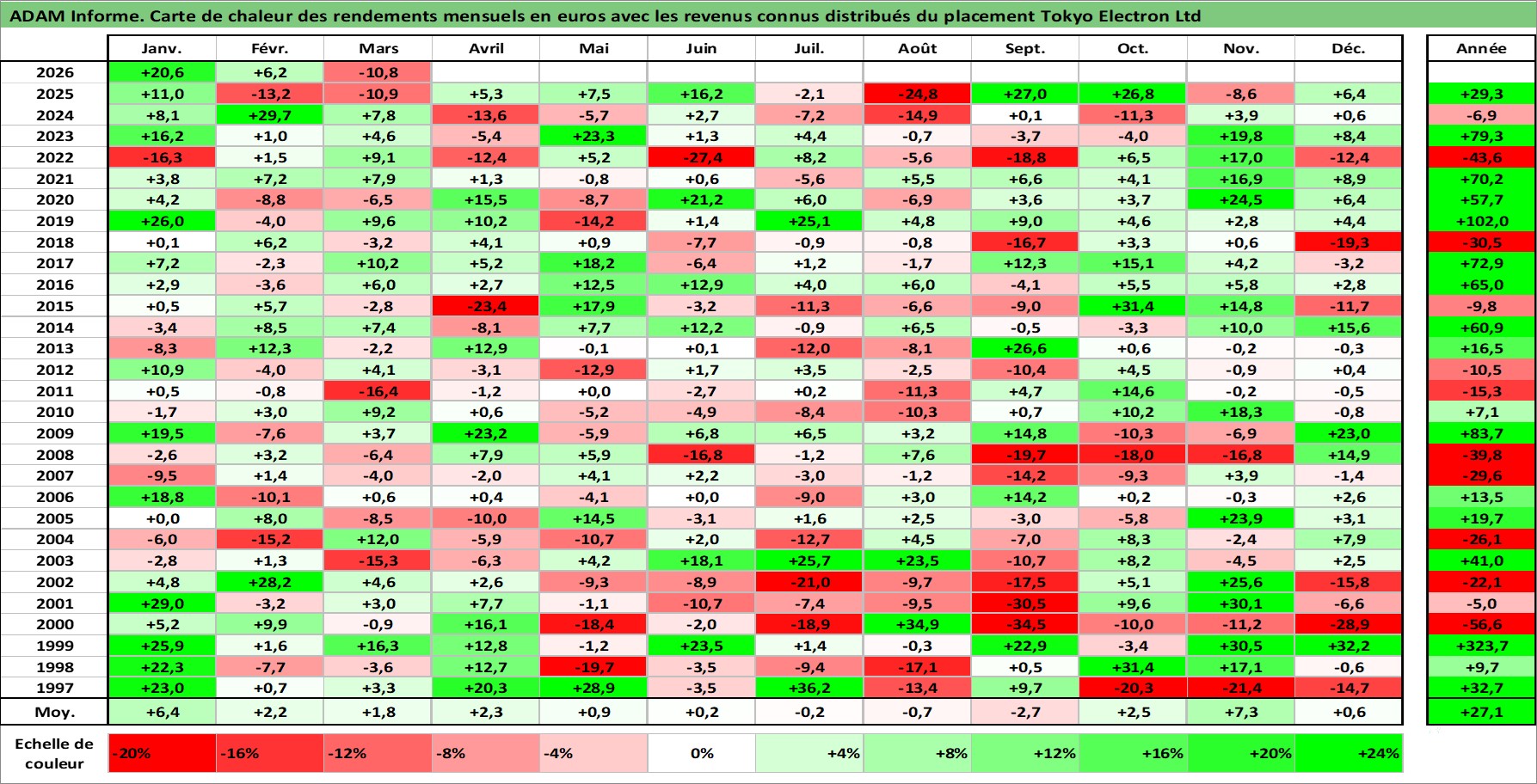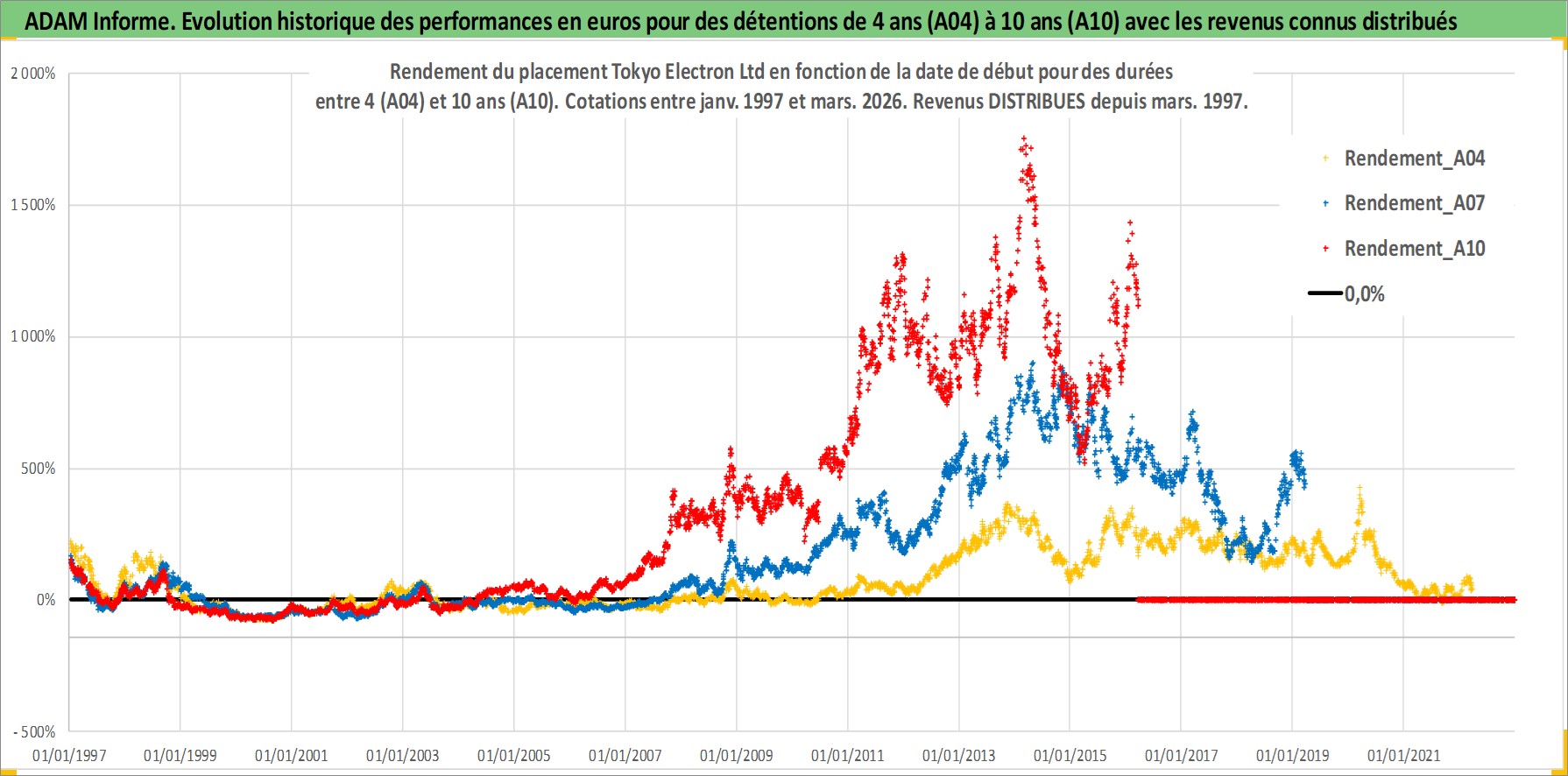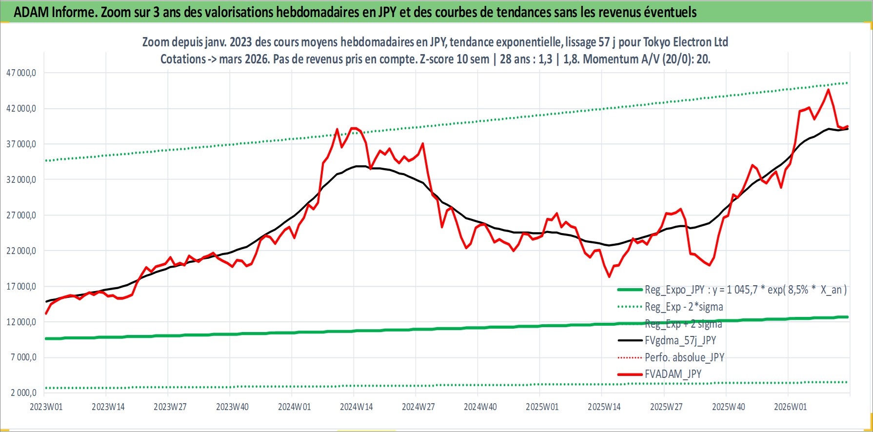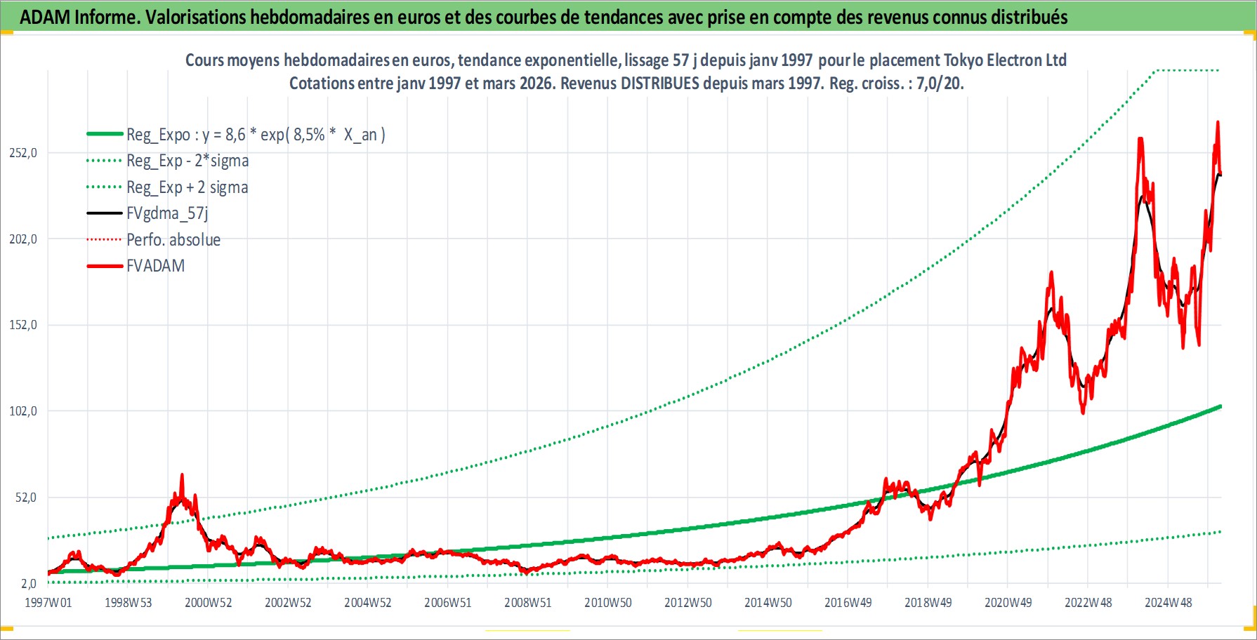 Site dédié aux investisseursPage dédiée sur site financeAnalyse des valorisations hebdomadaires de l'action Tokyo Electron Ltd. Cet actif est cote en JPY. Les valorisations sont en contrevaleur EURO et couvrent les semaines 1997W01 a 2026W13. Les revenus de cet actif financier sont pris en compte depuis la semaine 1997W13. La note globale ESG de cet actif est estimee a 13.0 (apres rebasage entre 0 et 20).