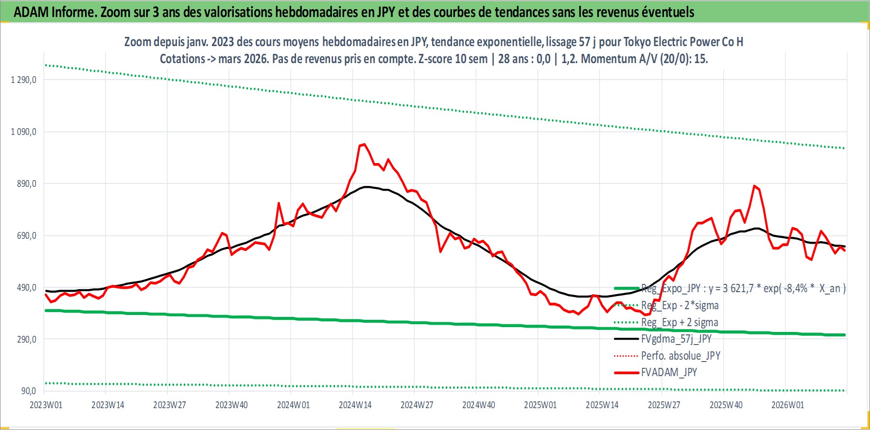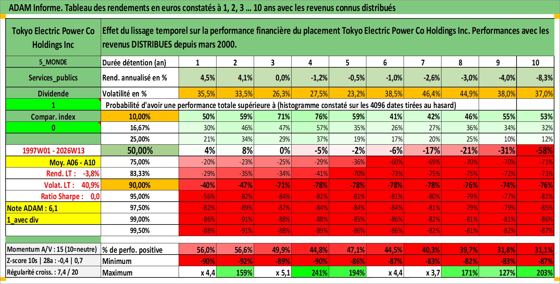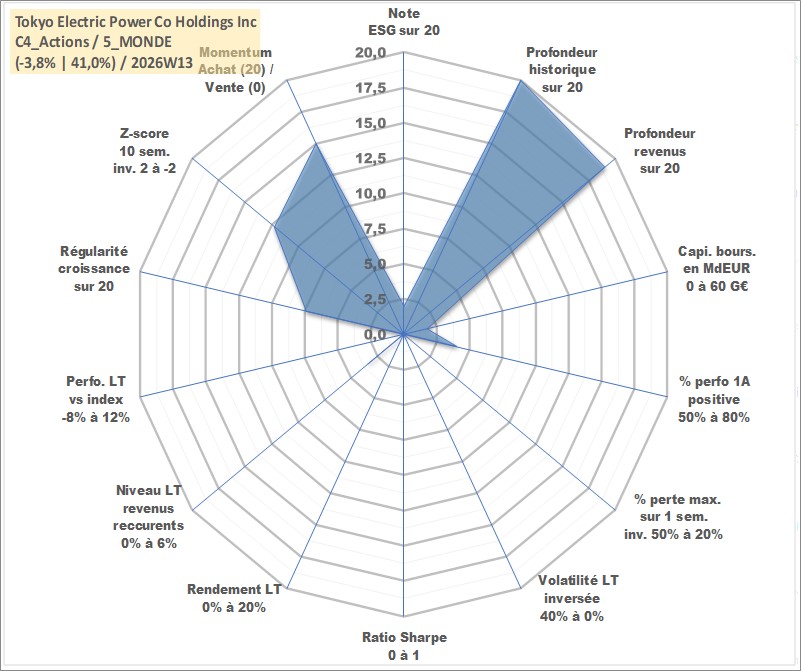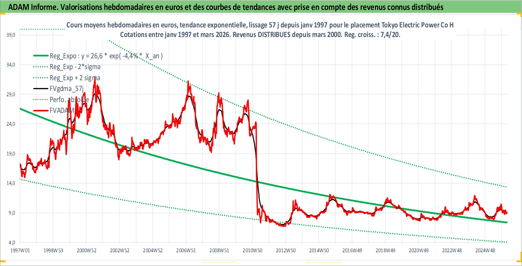 Site dédié aux investisseursPage dédiée sur site financeAnalyse des valorisations hebdomadaires de l'action Tokyo Electric Power Co Holdings Inc. Cet actif est cote en JPY. Les valorisations sont en contrevaleur EURO et couvrent les semaines 1997W01 a 2026W13. Les revenus de cet actif financier sont pris en compte depuis la semaine 2000W13. La note globale ESG de cet actif est estimee a 2.0 (apres rebasage entre 0 et 20).