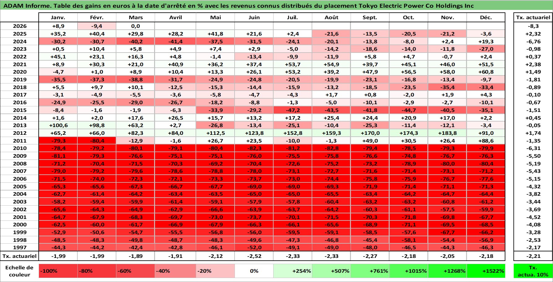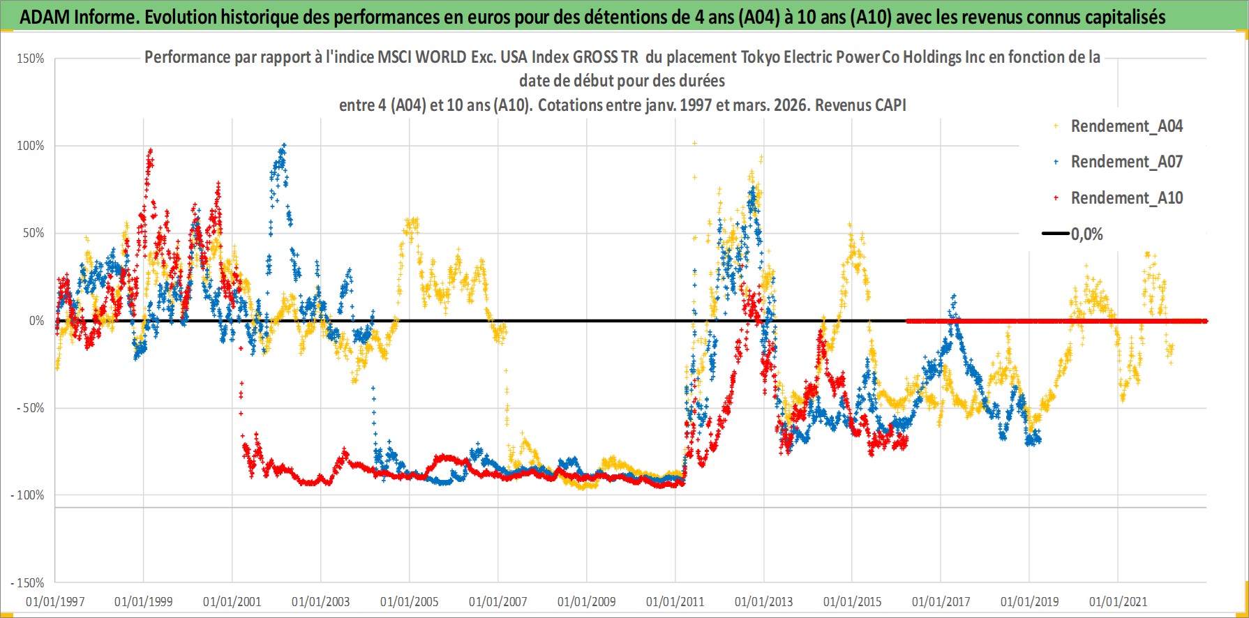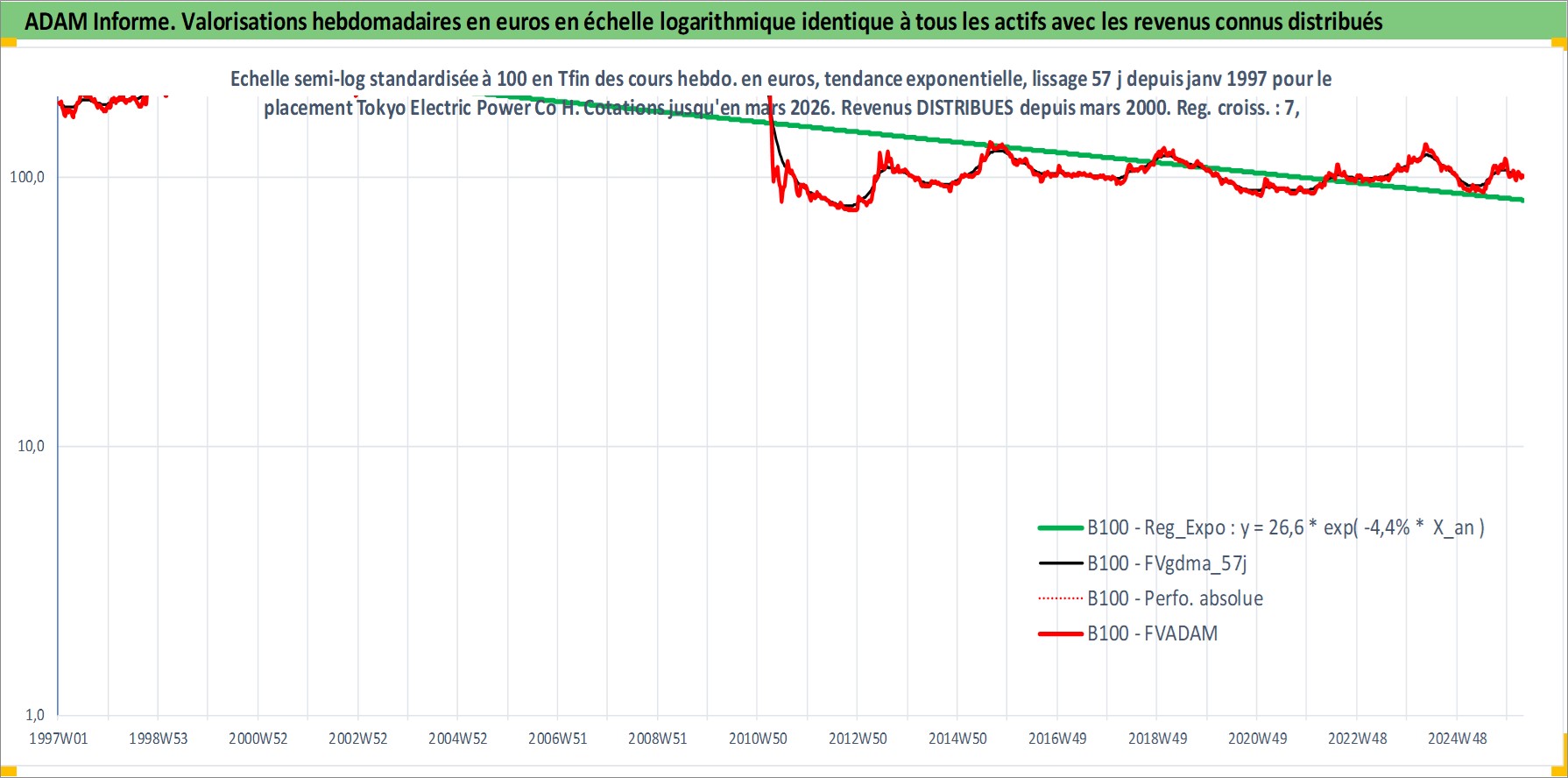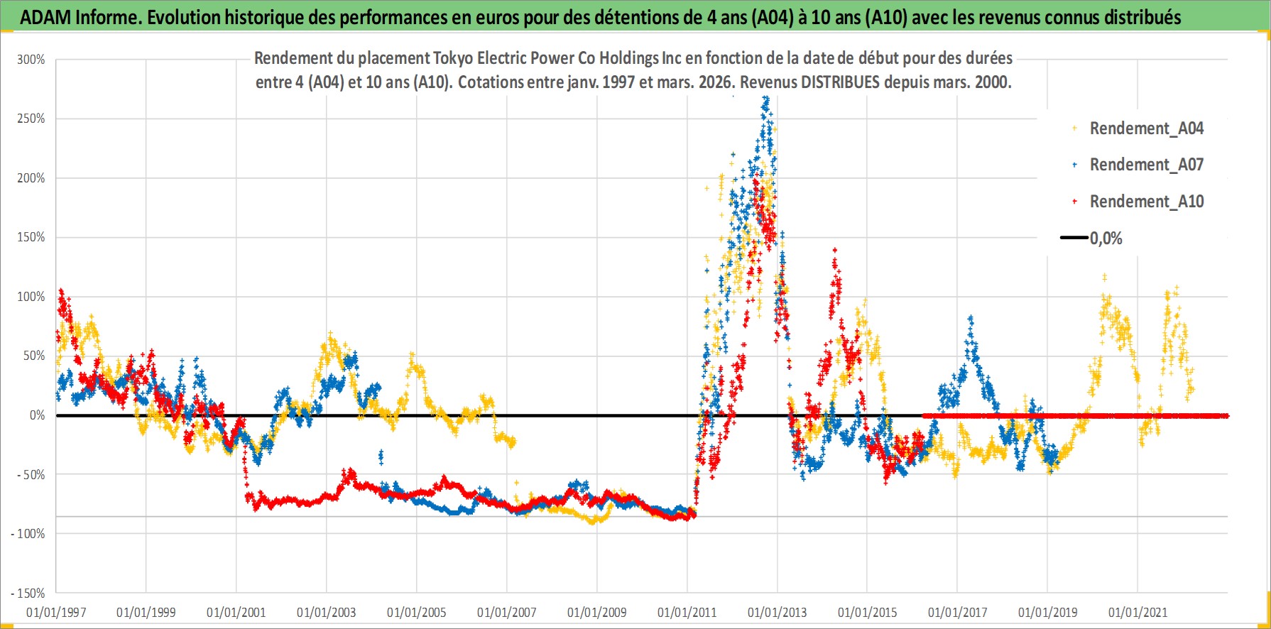 Site dédié aux investisseursPage dédiée sur site financeAnalyse des valorisations hebdomadaires de l'action Tokyo Electric Power Co Holdings Inc. Cet actif est cote en JPY. Les valorisations sont en contrevaleur EURO et couvrent les semaines 1997W01 a 2026W13. Les revenus de cet actif financier sont pris en compte depuis la semaine 2000W13. La note globale ESG de cet actif est estimee a 2.0 (apres rebasage entre 0 et 20).