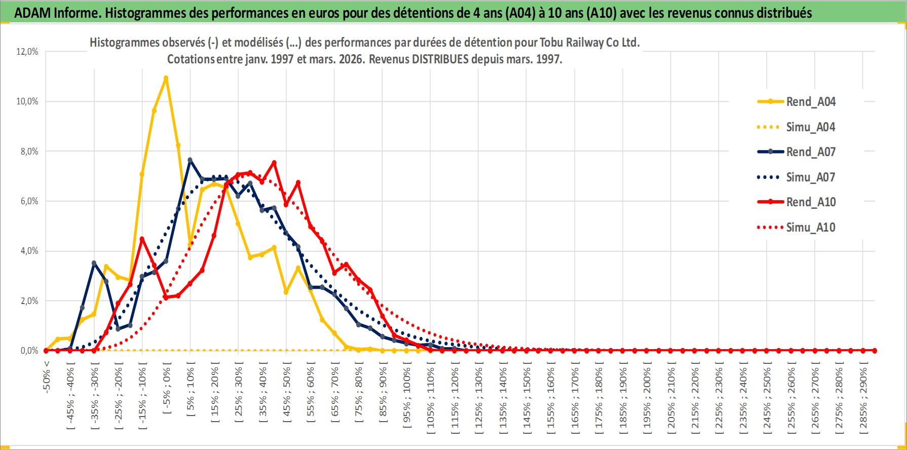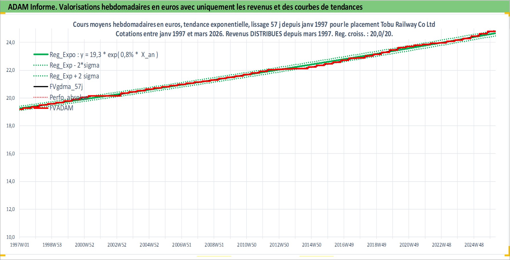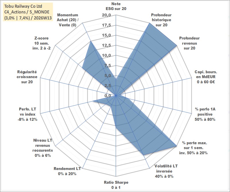 Site dédié aux investisseursPage dédiée sur site financeAnalyse des valorisations hebdomadaires de l'action Tobu Railway Co Ltd. Cet actif est cote en JPY. Les valorisations sont en contrevaleur EURO et couvrent les semaines 1997W01 a 2026W13. Les revenus de cet actif financier sont pris en compte depuis la semaine 1997W13. La note globale ESG de cet actif est estimee a 4.0 (apres rebasage entre 0 et 20).