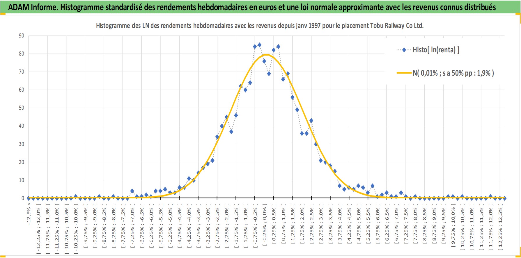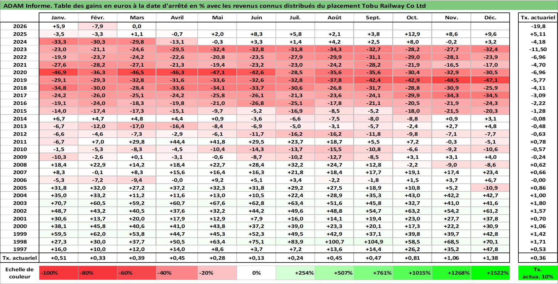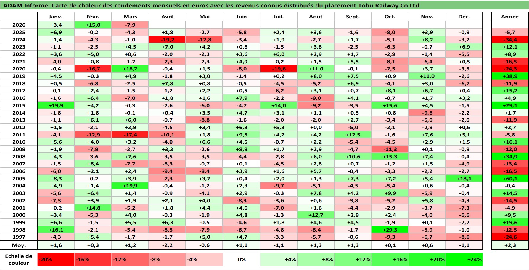 Site dédié aux investisseursPage dédiée sur site financeAnalyse des valorisations hebdomadaires de l'action Tobu Railway Co Ltd. Cet actif est cote en JPY. Les valorisations sont en contrevaleur EURO et couvrent les semaines 1997W01 a 2026W13. Les revenus de cet actif financier sont pris en compte depuis la semaine 1997W13. La note globale ESG de cet actif est estimee a 4.0 (apres rebasage entre 0 et 20).