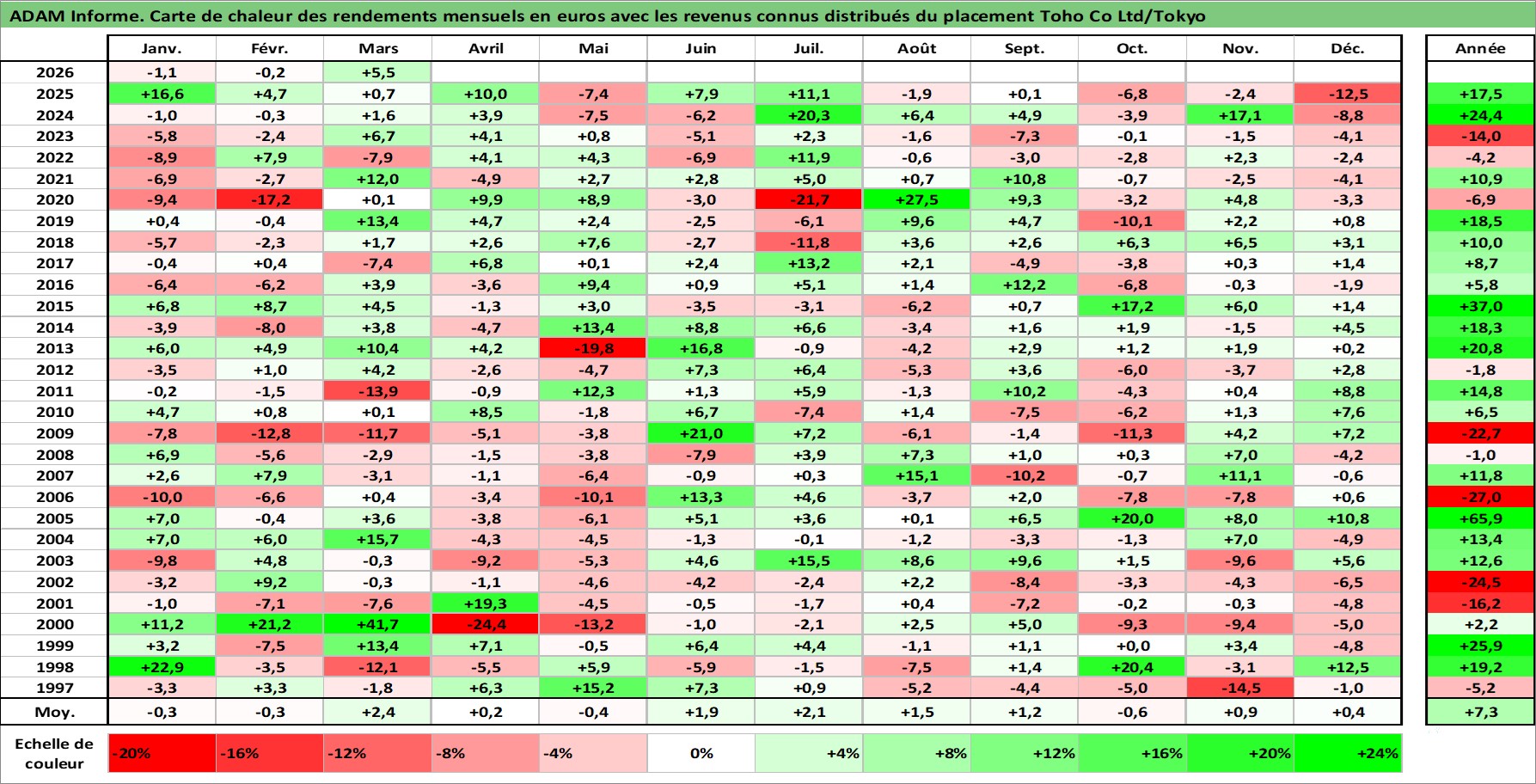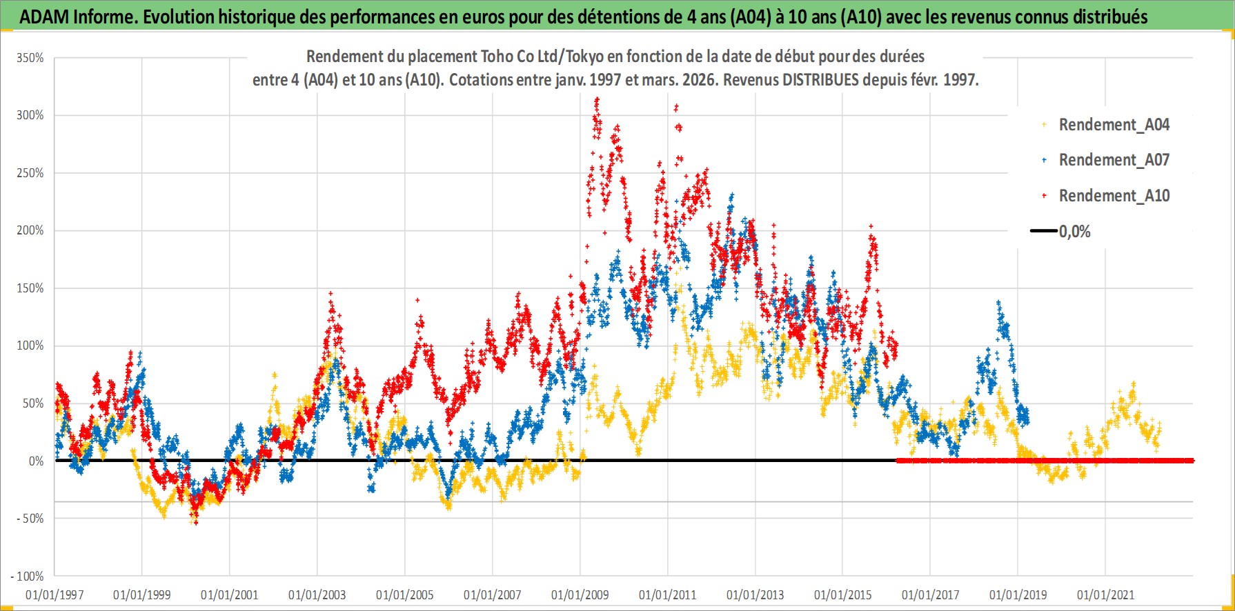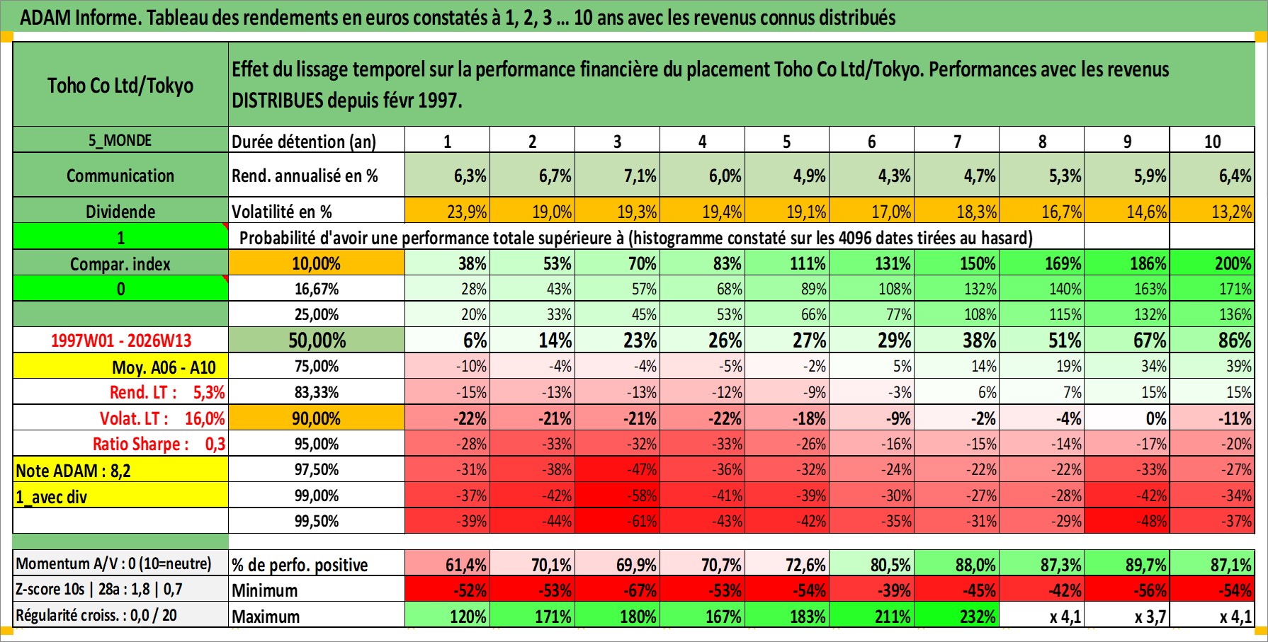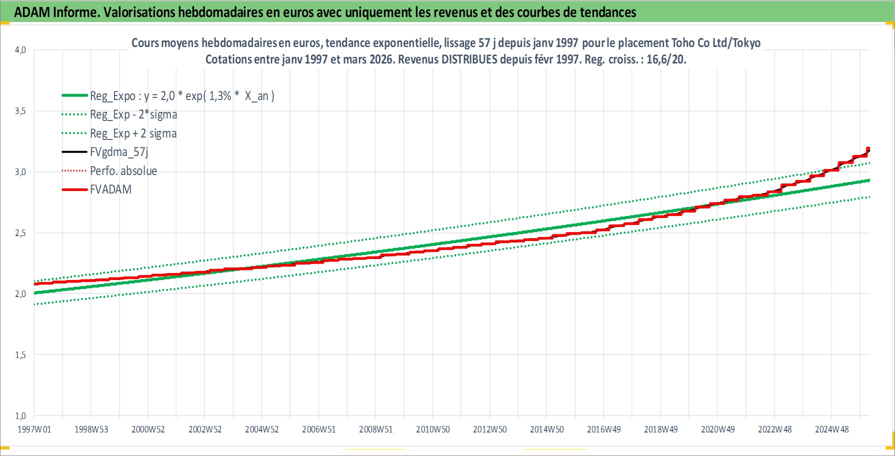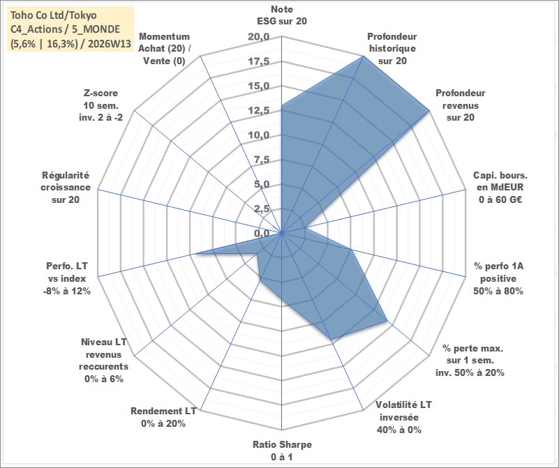Site dédié aux investisseursPage dédiée sur site financeAnalyse des valorisations hebdomadaires de l'action Toho Co Ltd/Tokyo. Cet actif est cote en JPY. Les valorisations sont en contrevaleur EURO et couvrent les semaines 1997W01 a 2026W13. Les revenus de cet actif financier sont pris en compte depuis la semaine 1997W09. La note globale ESG de cet actif est estimee a 13.0 (apres rebasage entre 0 et 20).