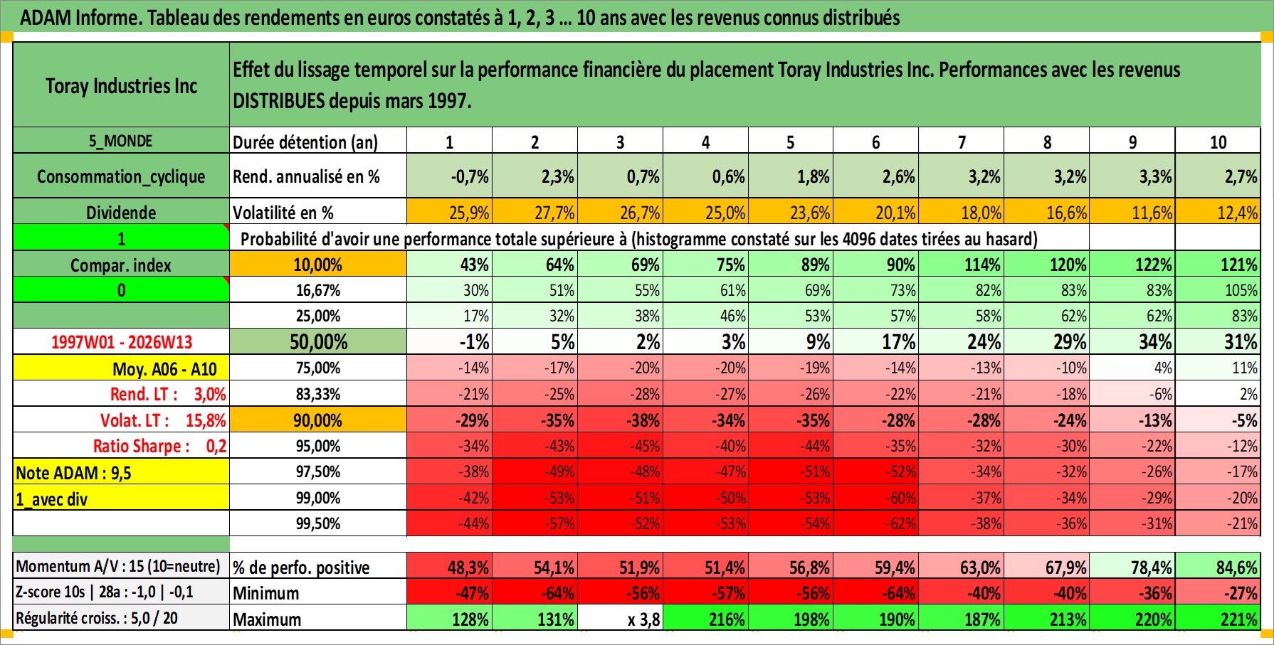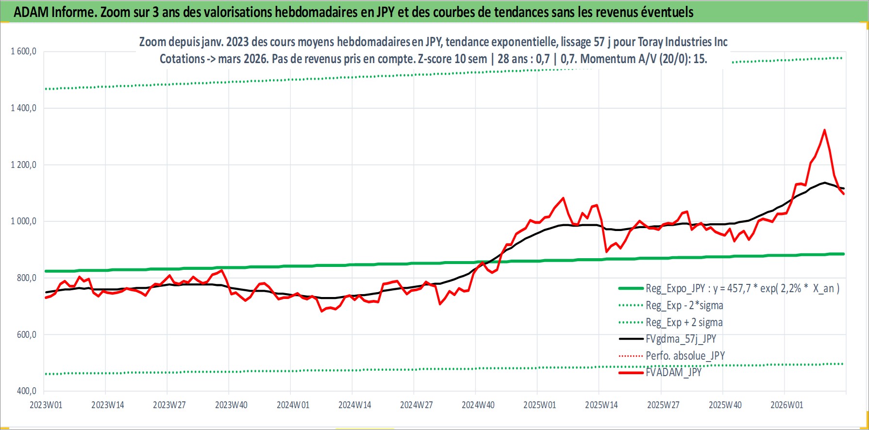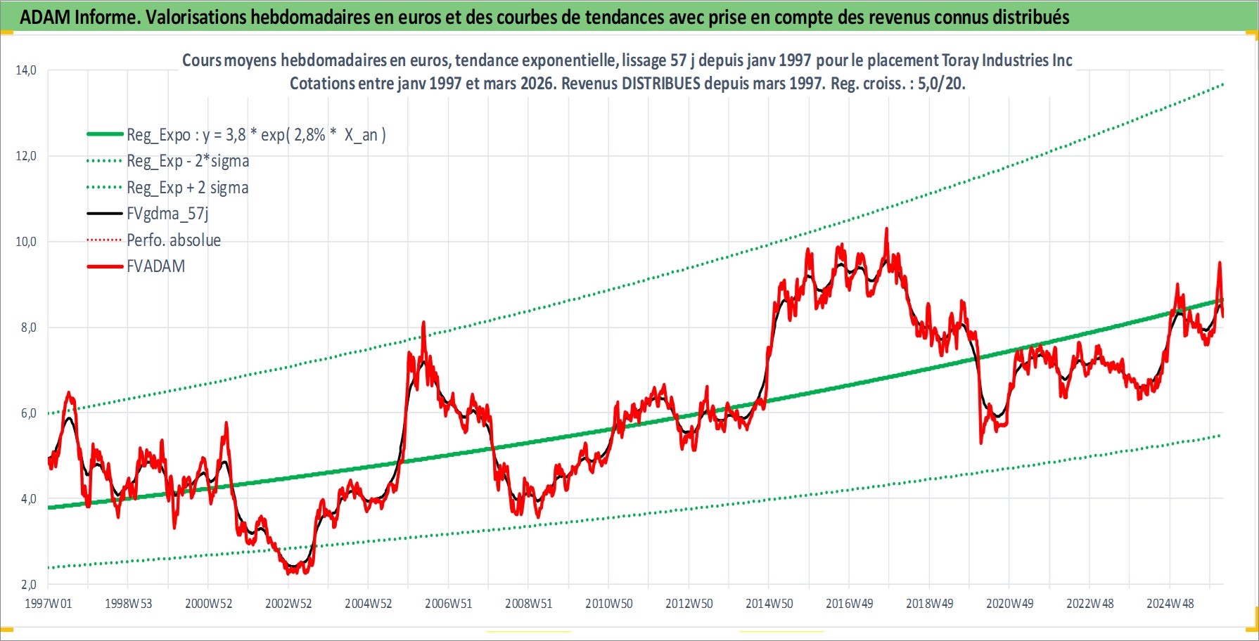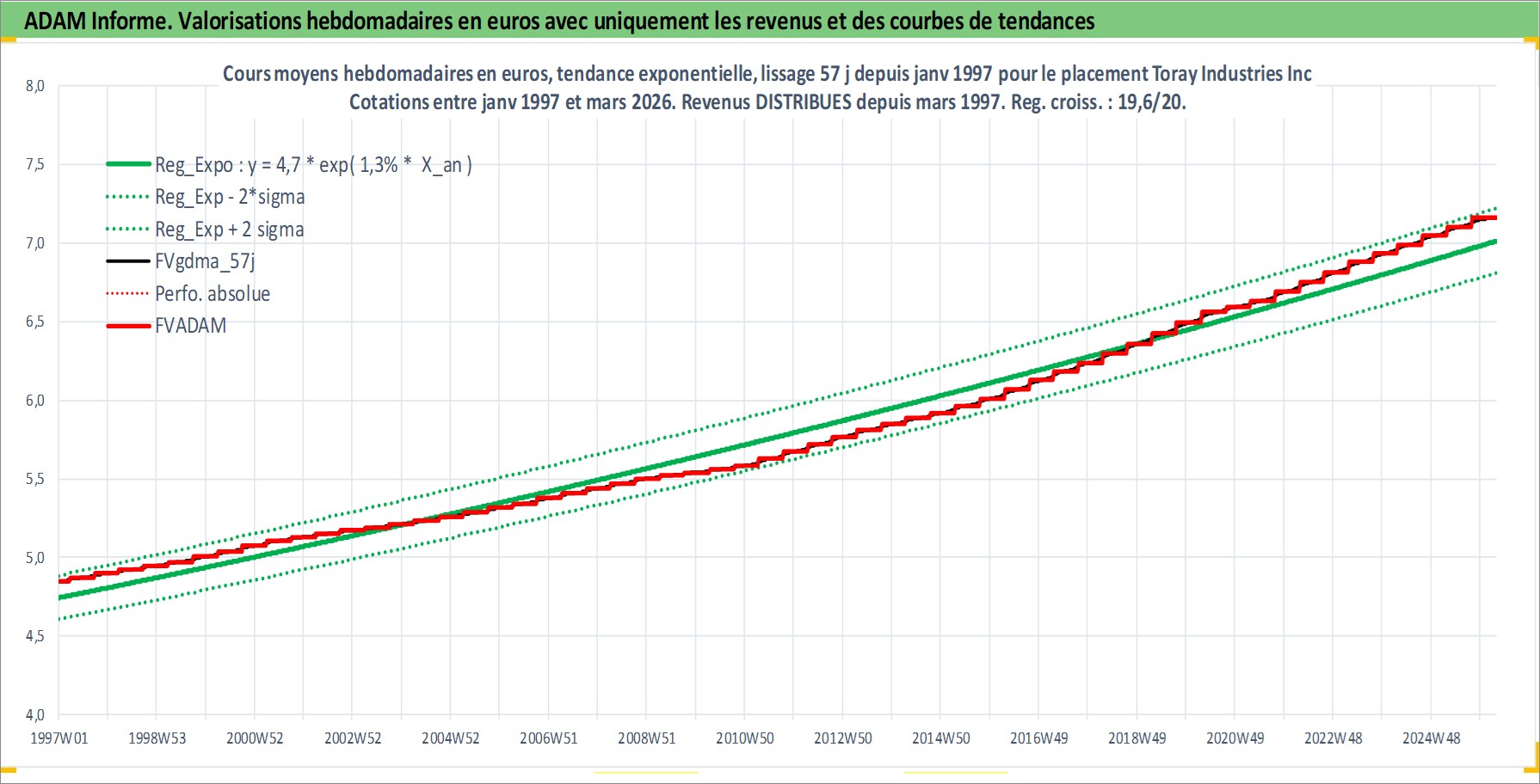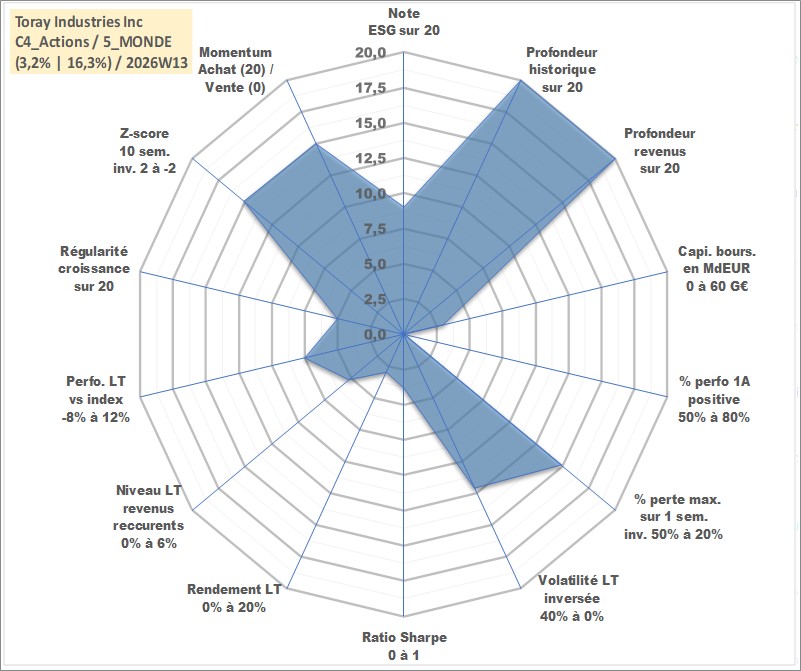 Site dédié aux investisseursPage dédiée sur site financeAnalyse des valorisations hebdomadaires de l'action Toray Industries Inc. Cet actif est cote en JPY. Les valorisations sont en contrevaleur EURO et couvrent les semaines 1997W01 a 2026W13. Les revenus de cet actif financier sont pris en compte depuis la semaine 1997W13. La note globale ESG de cet actif est estimee a 9.0 (apres rebasage entre 0 et 20).
